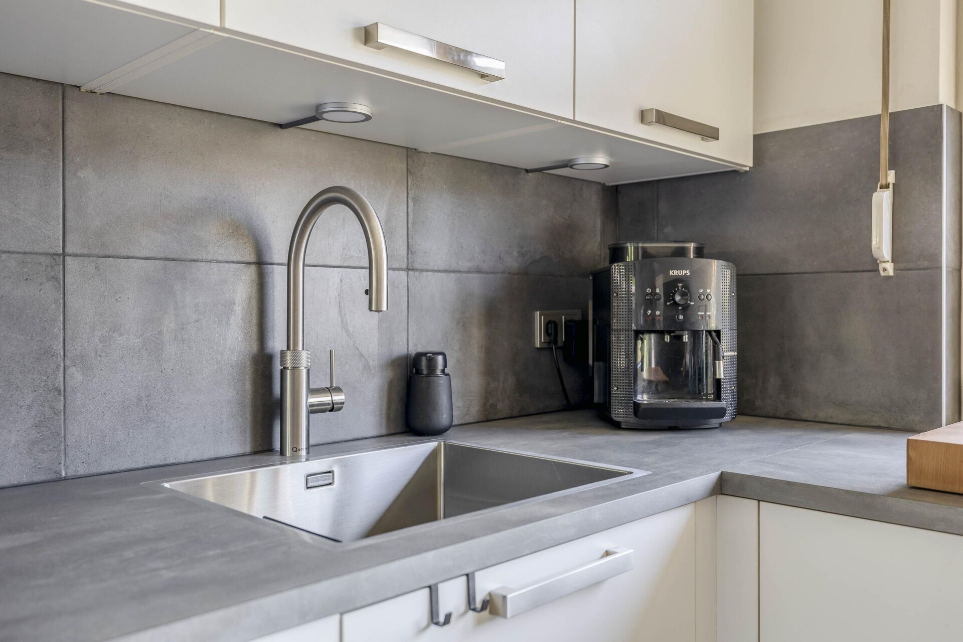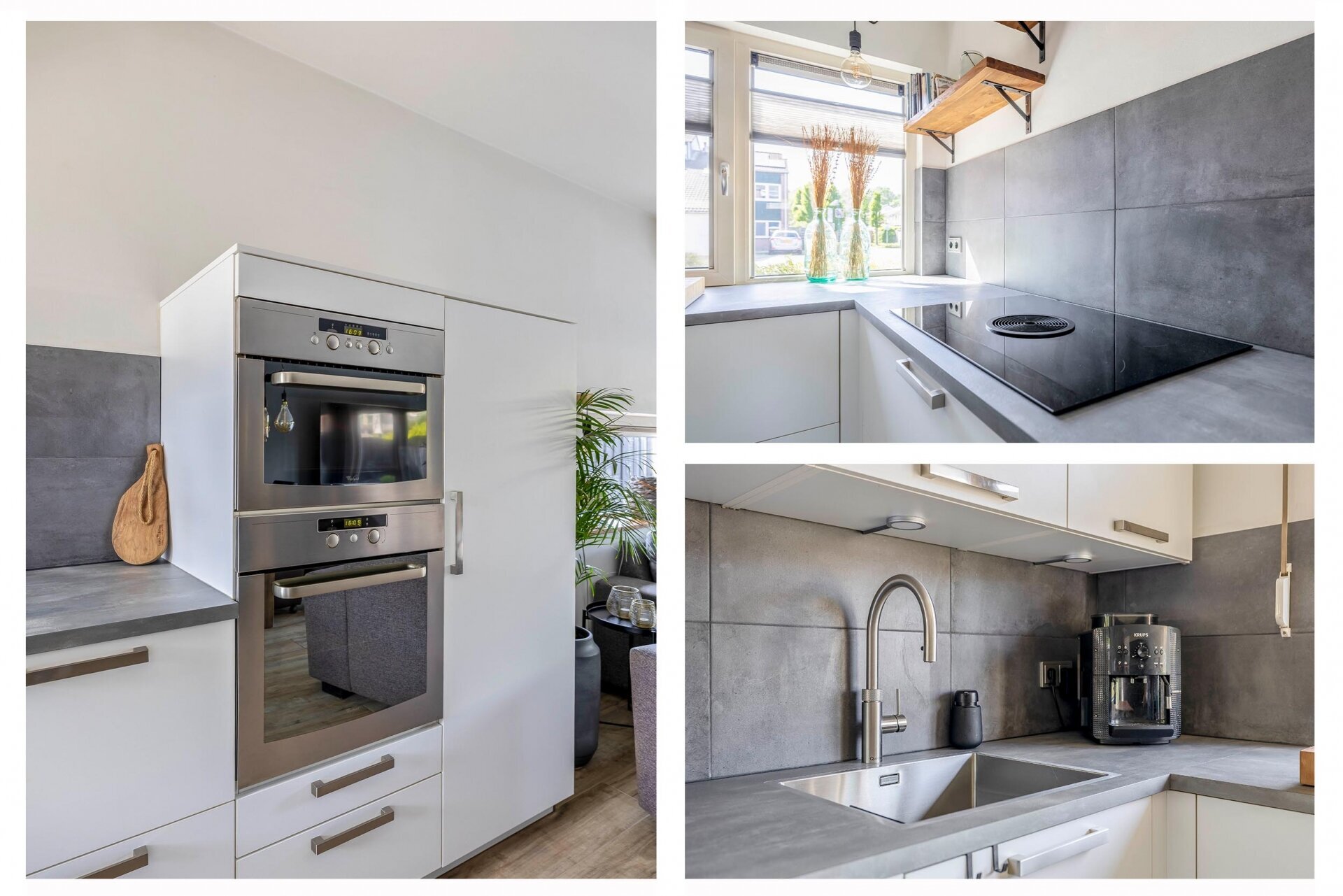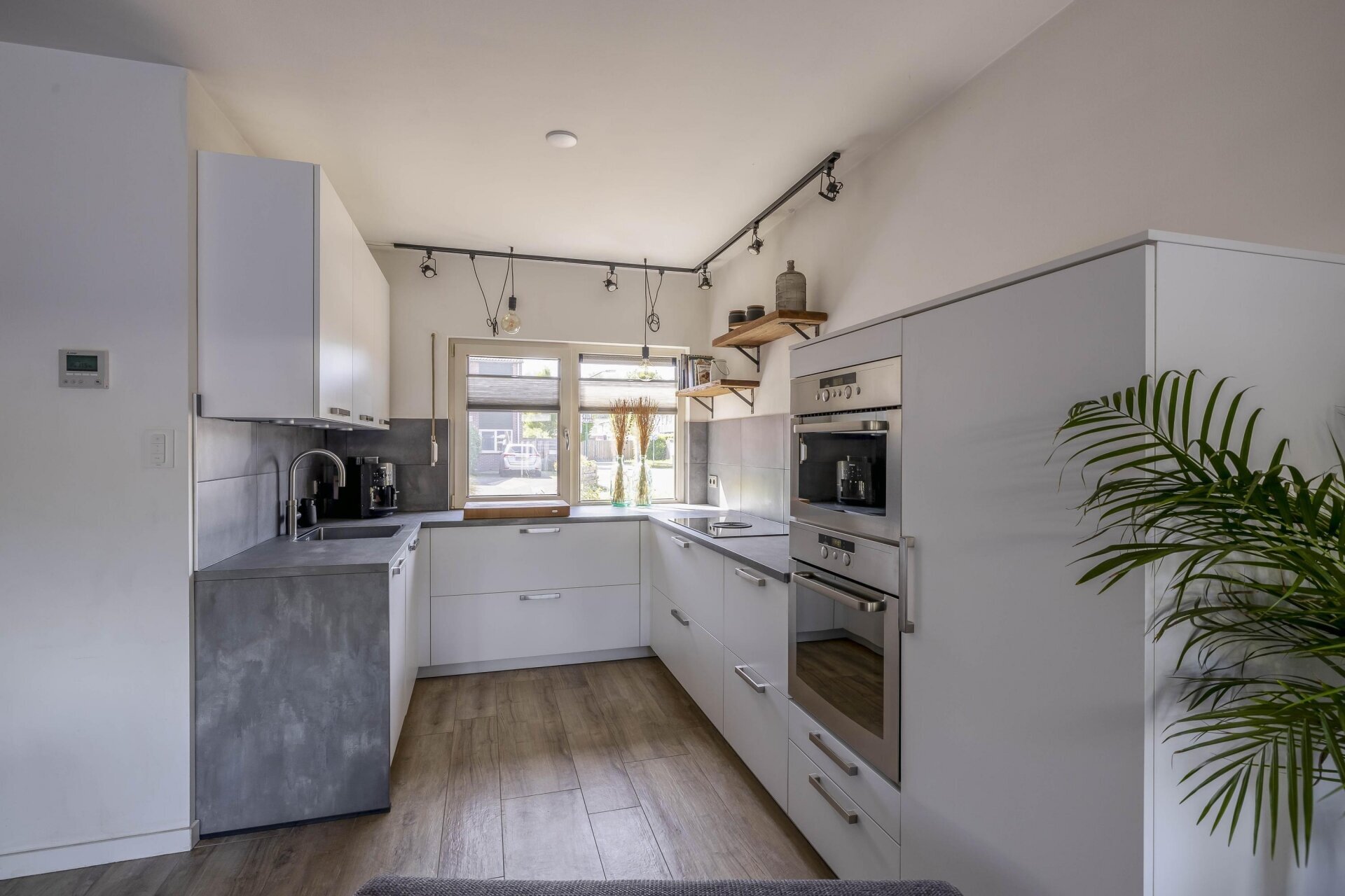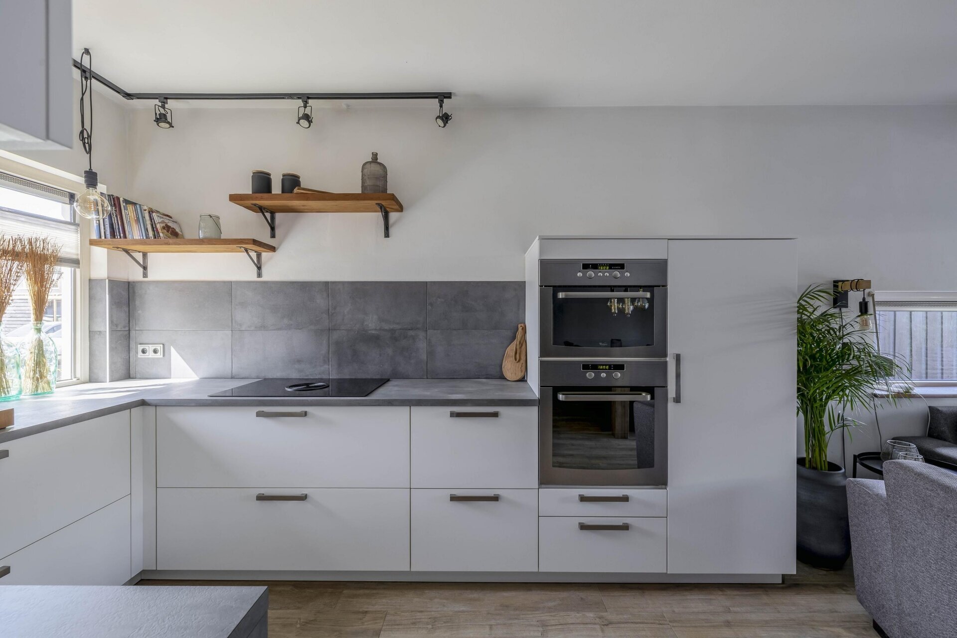 De keuken aan de voorzijde van het huis is voorzien van alle gemakken. Denk aan een Bora inductiekookplaat met geïntegreerde afzuiging, een Quooker-kraan voor direct kokend water en een strak werkblad dat mooi aansluit op de moderne kastenwand. Dankzij de hoekopstelling is er lekker veel werkruimte én bergruimte – koken wordt hier echt een feestje.