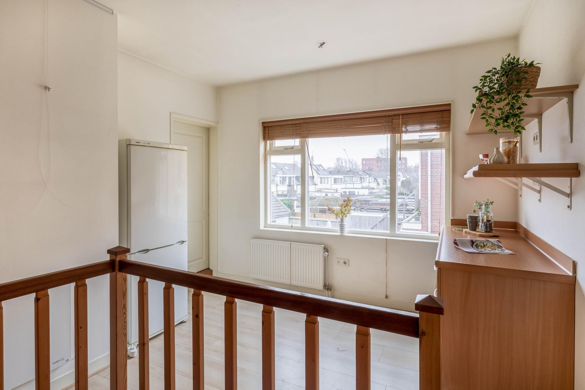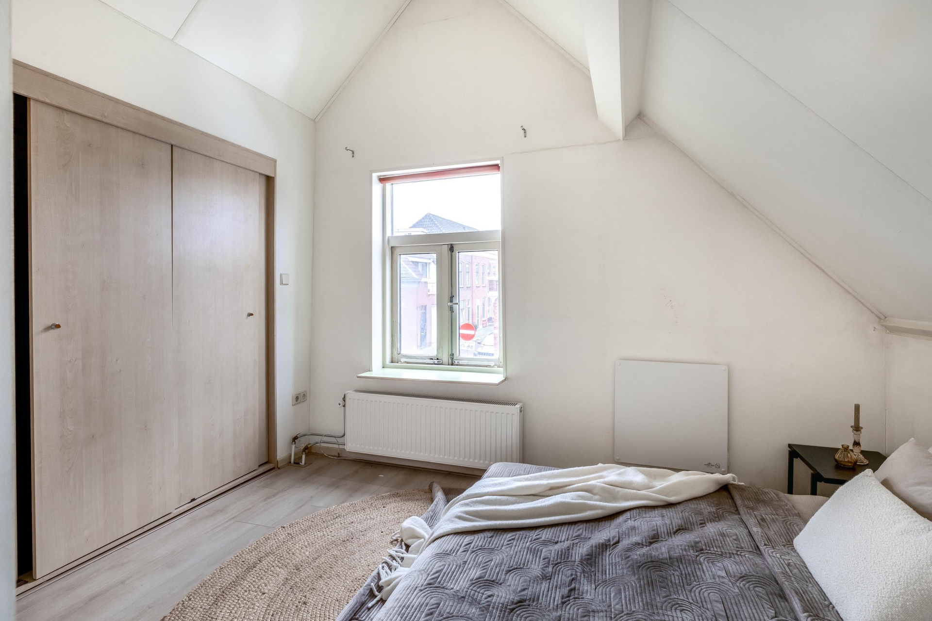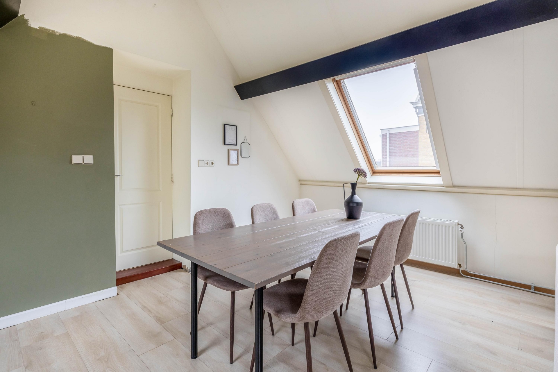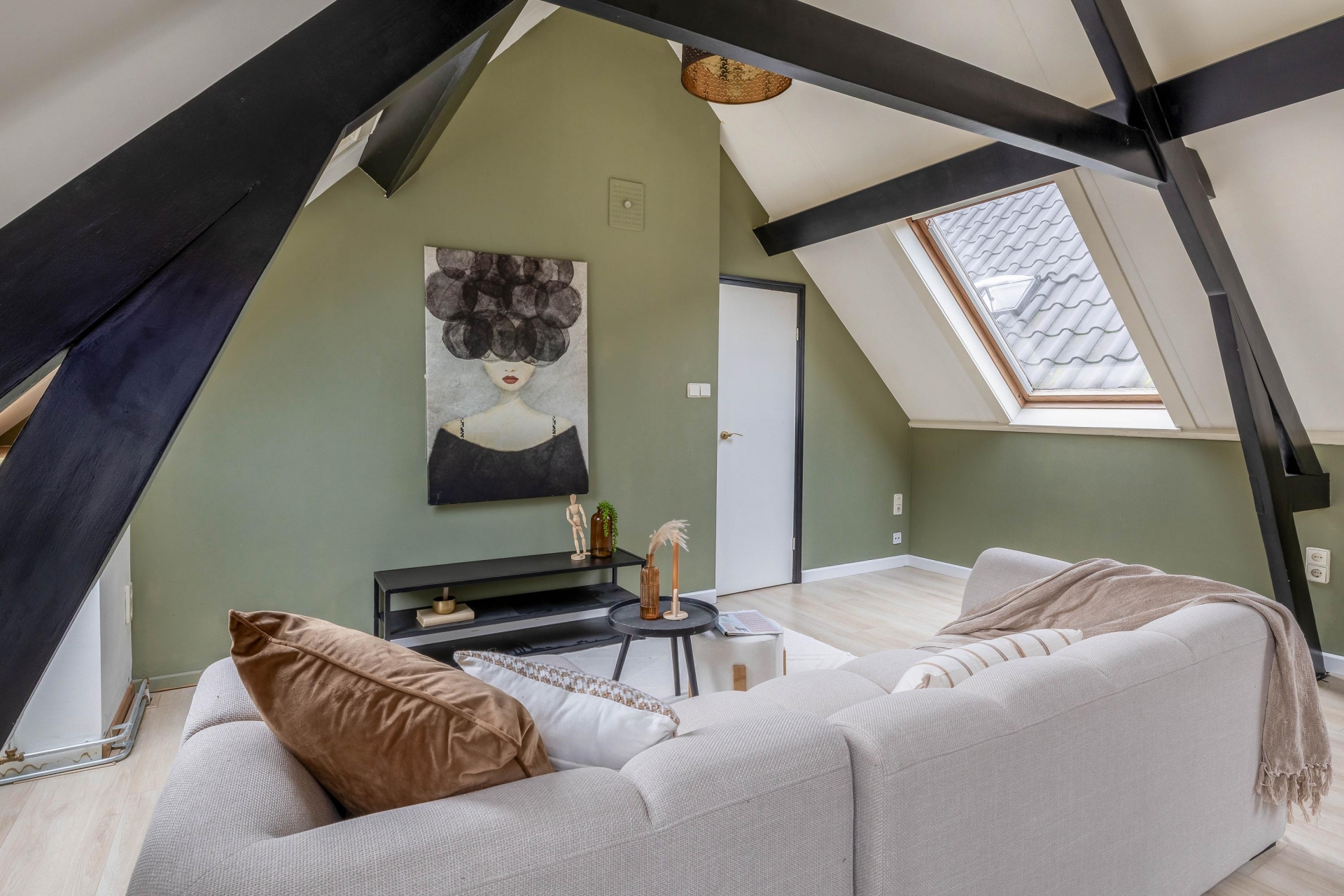 Aan deze verdieping grenst ook de badkamer, voorzien van een toilet, badkamermeubel en douchecabine. De afwerking met houten kozijnen en enkel glas geeft de ruimte een authentiek tintje. In de woonkamer op deze verdieping zorgen vier dakramen voor volop licht en sfeer. Aan de achterzijde vind je een royale slaapkamer met grote inbouwkast, ideaal als master bedroom. De gehele verdieping is afgewerkt met laminaatstroken.