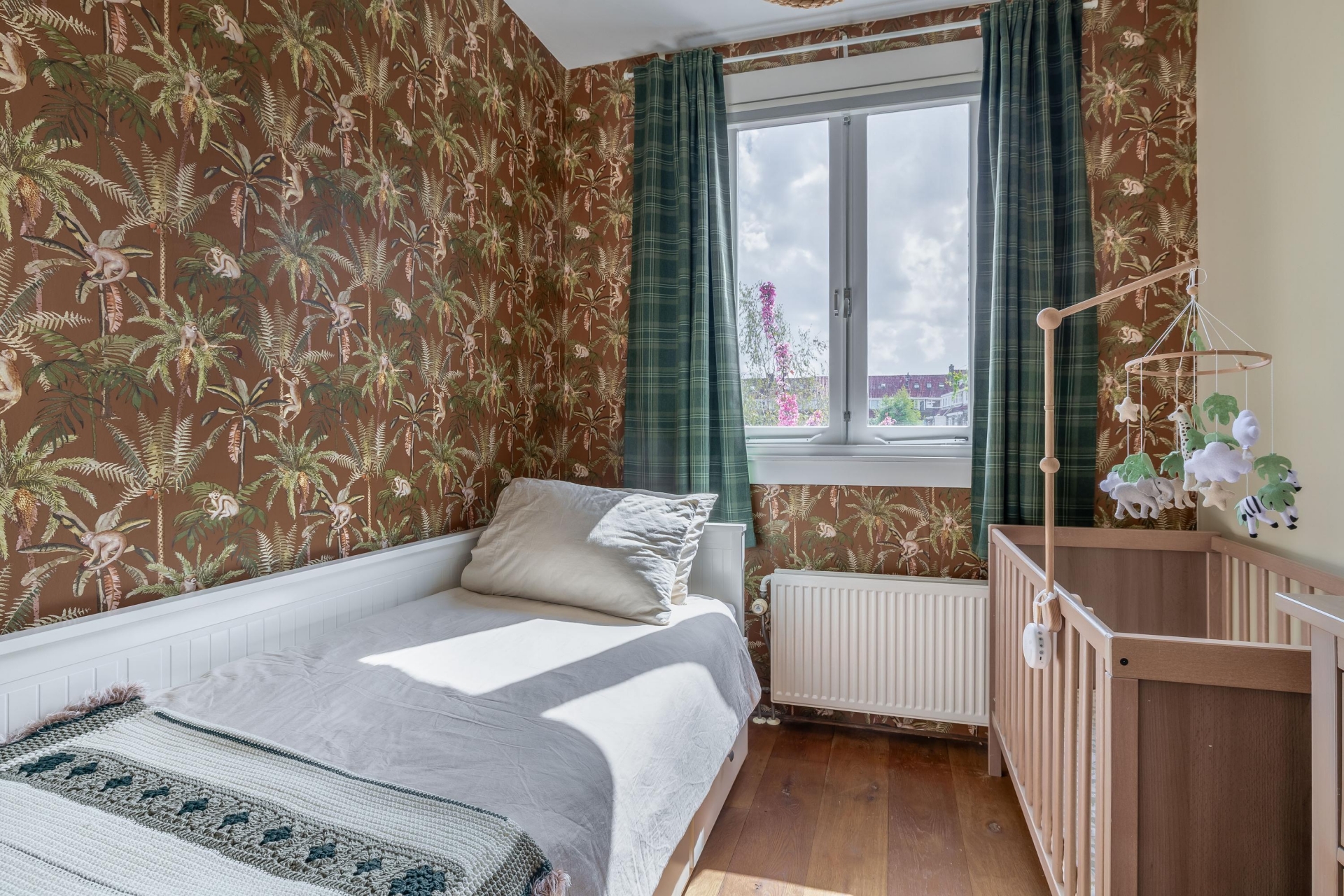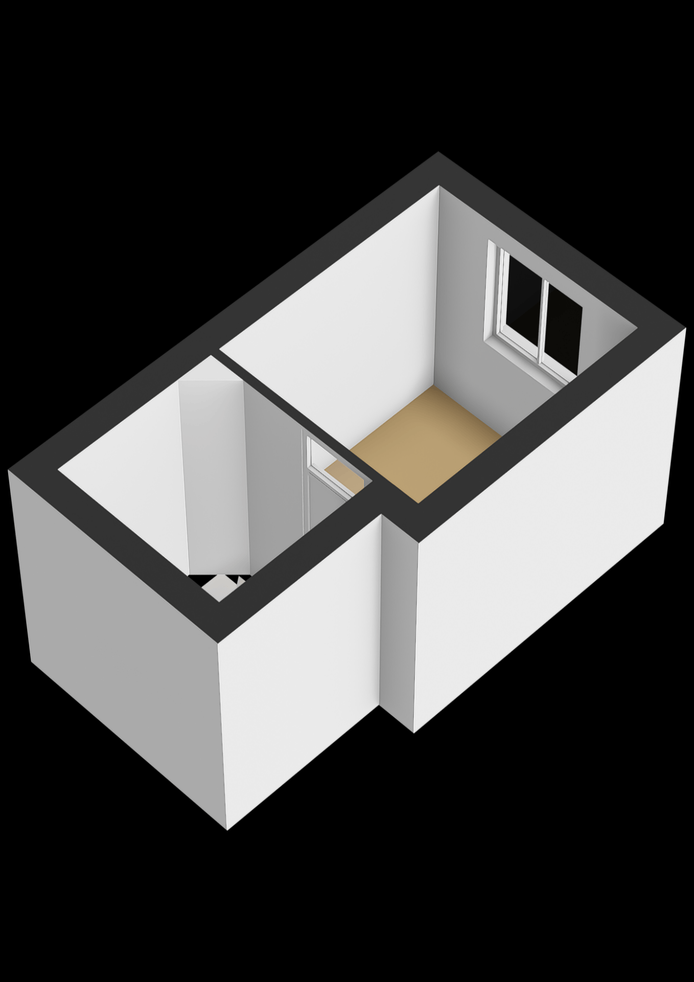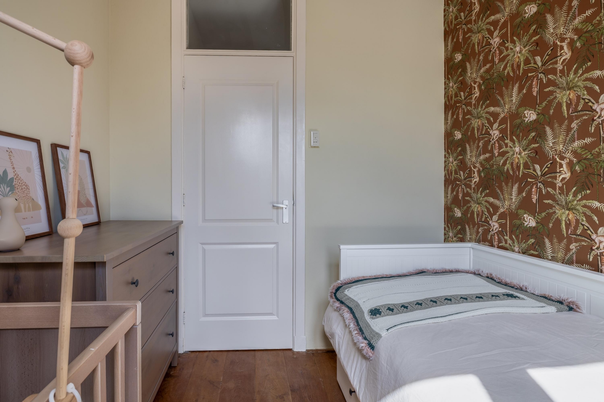 Op de eerste verdieping bevindt zich de tweede slaapkamer. Deze ruimte is ideaal als werkkamer of babykamer. Dankzij de indeling over twee lagen voelt het huis ruim en speels aan.