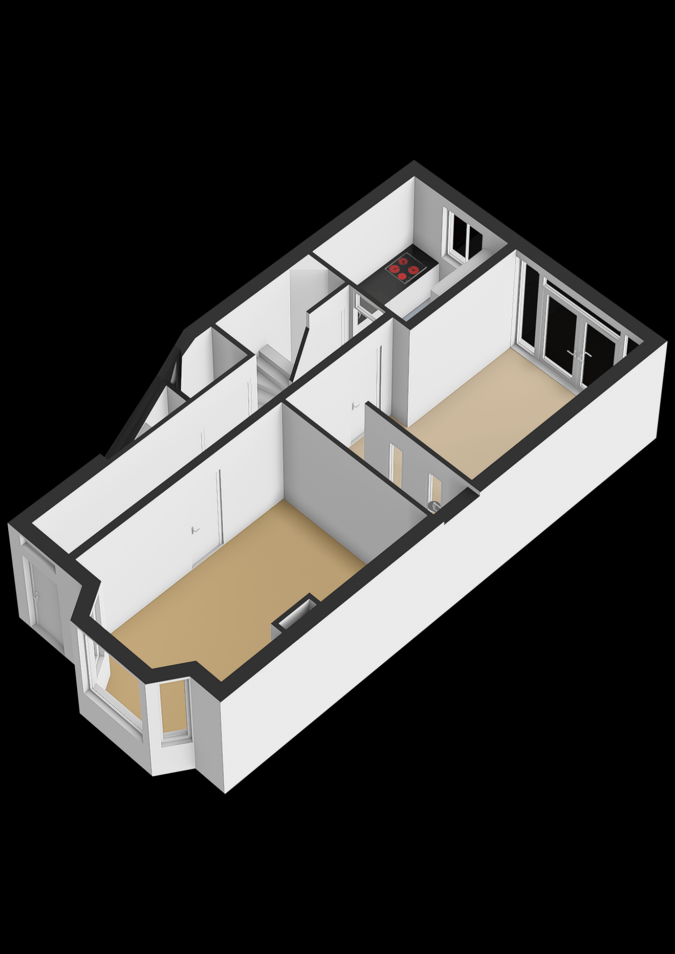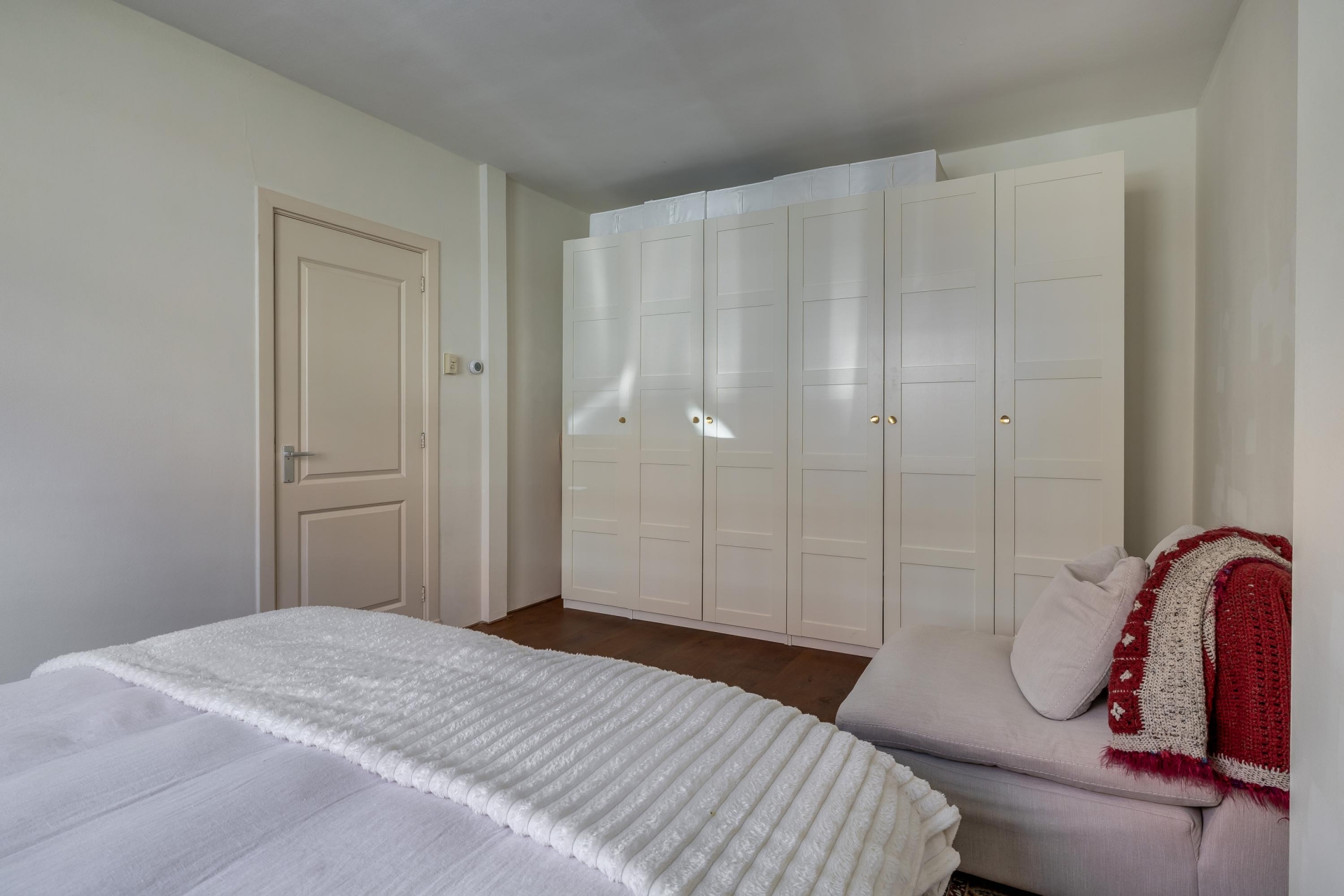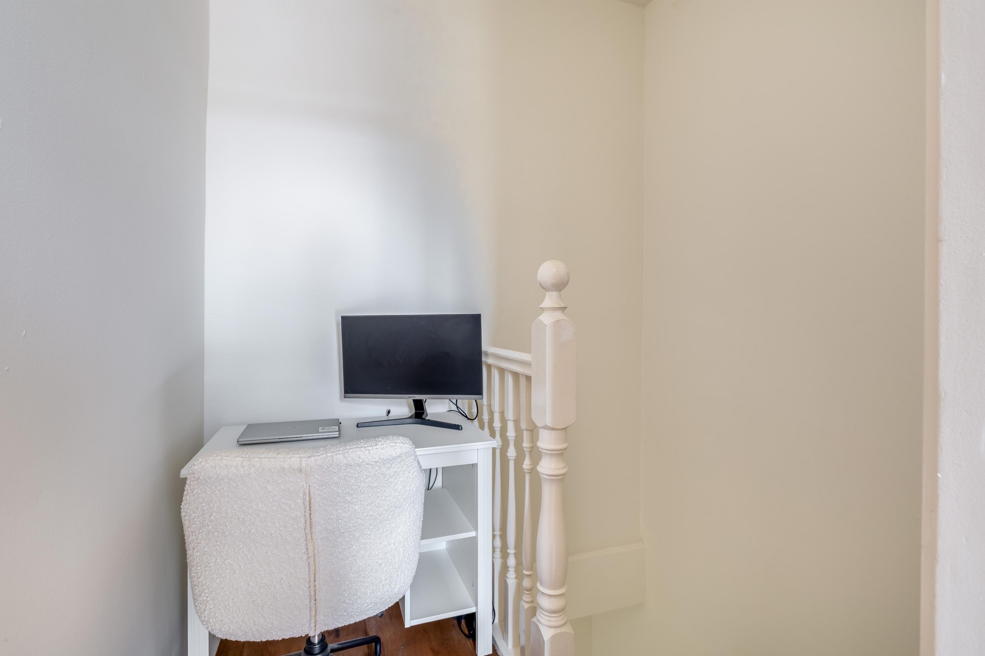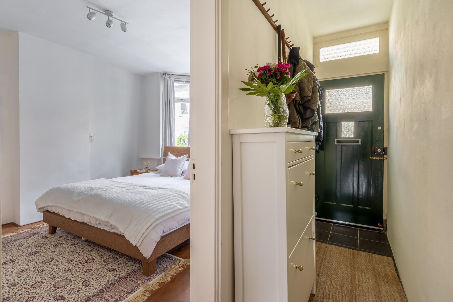 Op de eerste verdieping bevindt zich de tweede slaapkamer. Deze ruimte is ideaal als werkkamer of babykamer. Dankzij de indeling over twee lagen voelt het huis ruim en speels aan.