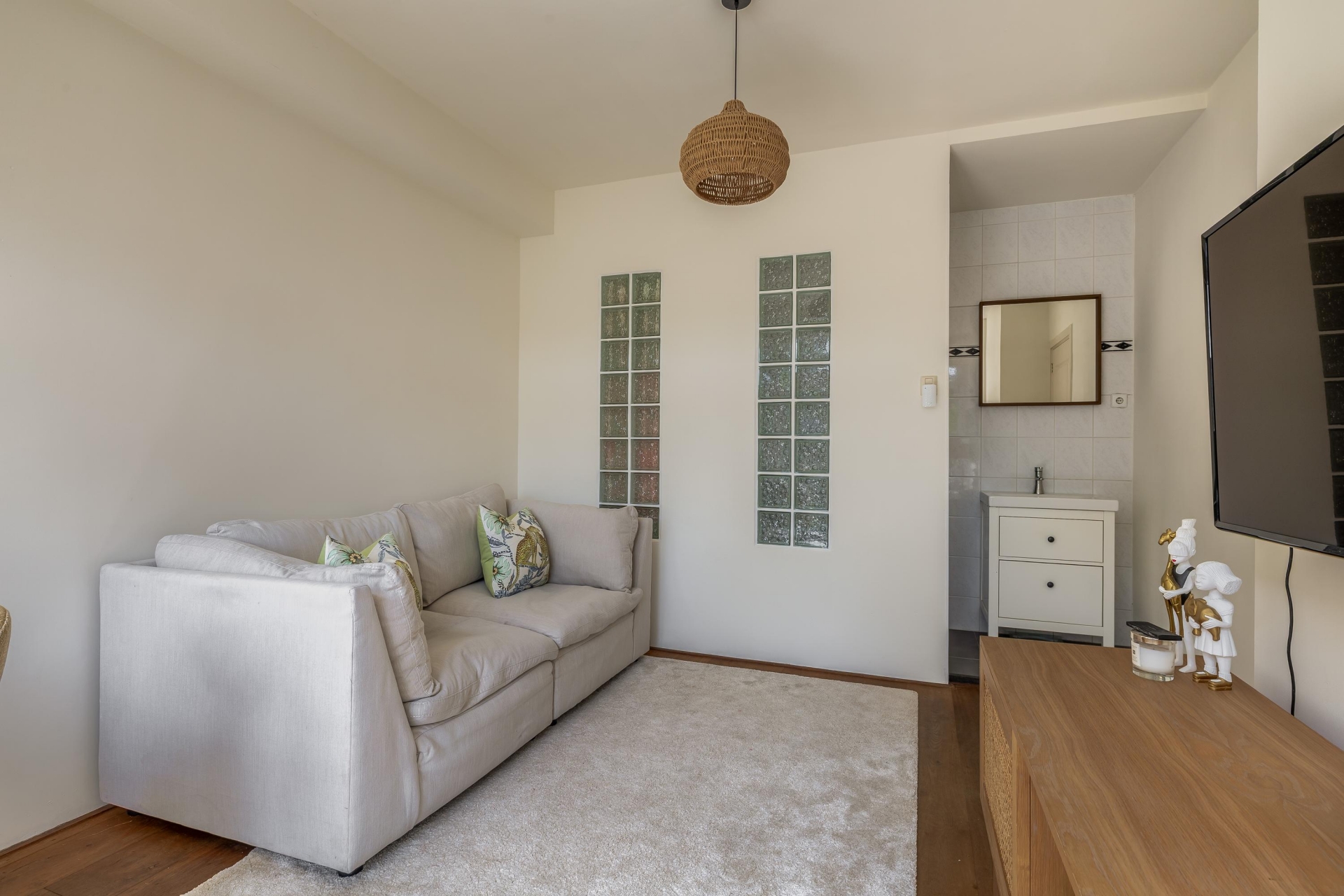 De woonkamer is een fijne plek waar je meteen ziet wat deze woning zo aantrekkelijk maakt. Door de grote raampartijen en de openslaande deuren naar de tuin valt het daglicht rijkelijk naar binnen. Het voormalige balkon is bij de woonkamer gevoegd, wat zorgt voor extra leefruimte en een prettig open gevoel. Hier heb je alle ruimte voor een gezellige zithoek én een eettafel.