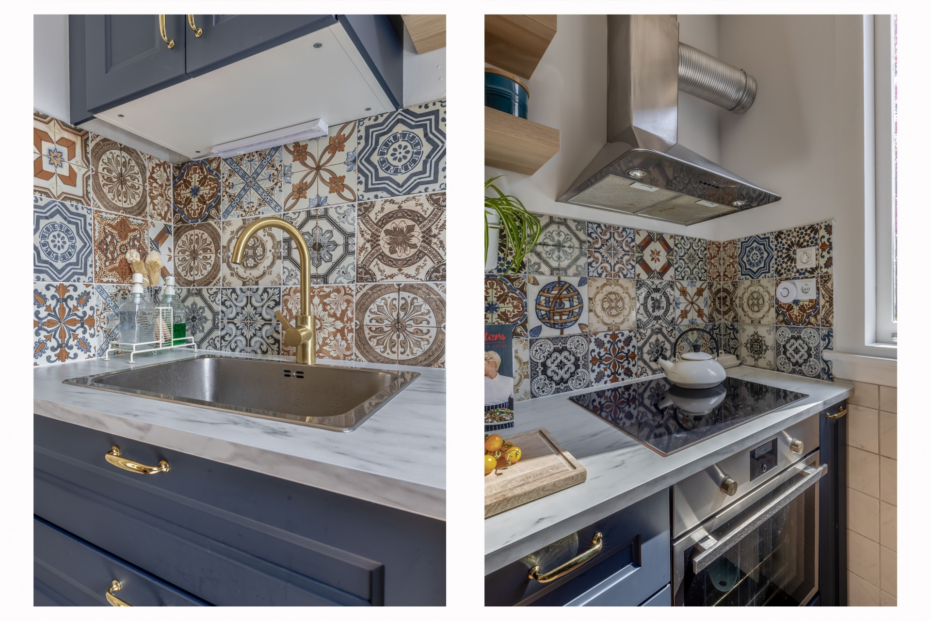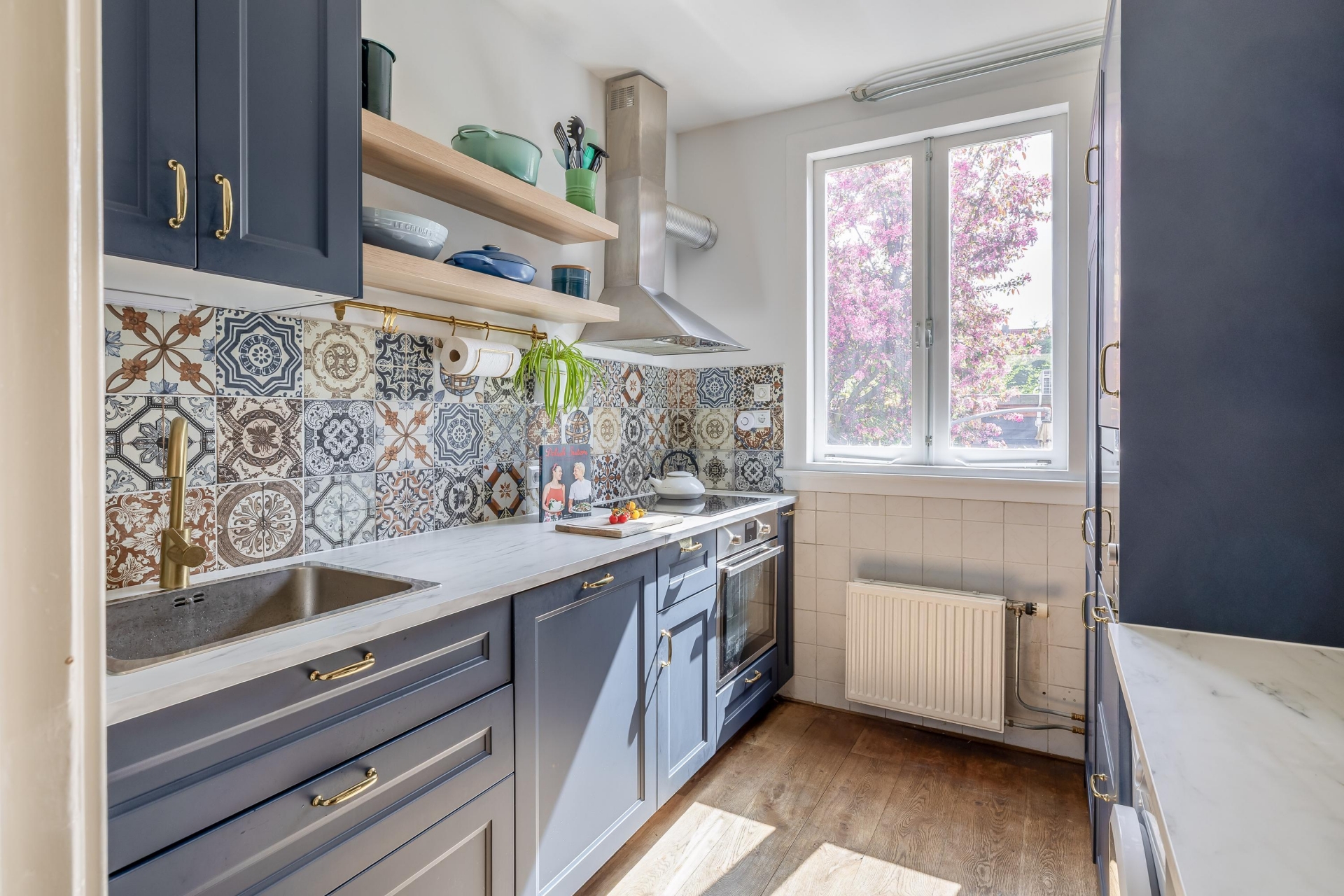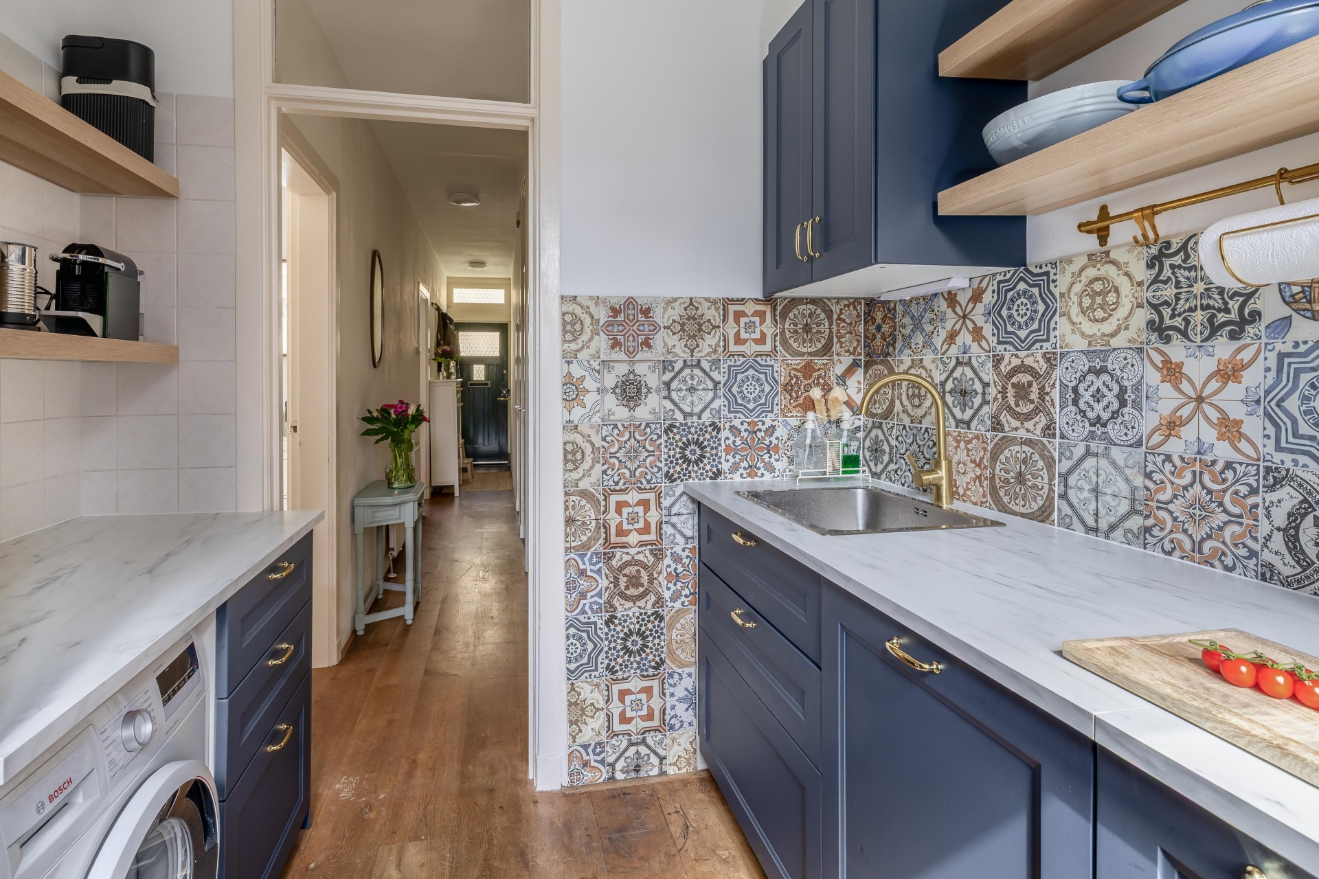 De keuken is in 2025 vernieuwd en dat zie je meteen. De combinatie van donker blauwe kastfronten, warme accenten en een speelse tegelwand geeft het geheel een eigentijdse en sfeervolle uitstraling. Tegelijkertijd is de keuken praktisch ingericht, met voldoende werk- en opbergruimte. Hier kook je met plezier, of je nu snel iets maakt of uitgebreid aan de slag gaat.