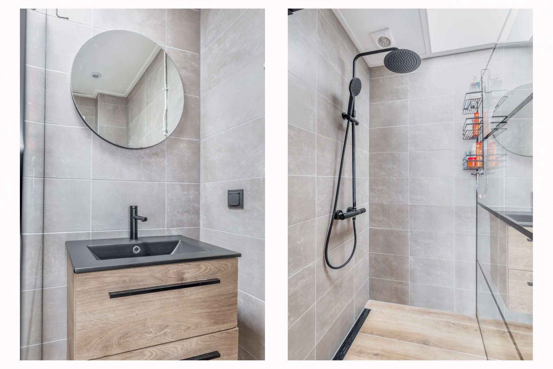 De badkamer (2023) sluit naadloos aan bij de moderne uitstraling en is uitgevoerd met een inloopdouche, regendouche en een stijlvol wastafelmeubel.