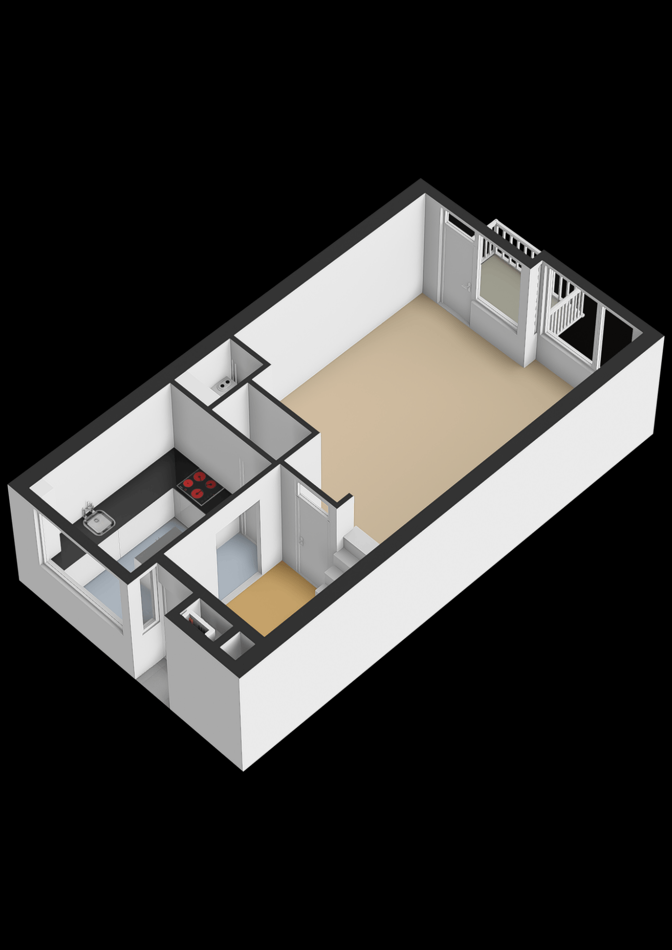 Entree, met toegang tot de keuken, woonkamer, meterkast en trapopgang. De keuken is gesitueerd aan de voorzijde van het complex. De keuken is voorzien van diverse inbouwapparatuur, een Amerikaanse koel/vries-combinatie en heeft een moderne uitstraling. Vanaf de keuken is het toilet ook toegankelijk. Aan de achterzijde van het complex is de woonkamer. Door de grote raampartijen is er voldoende daglichttoetreding aanwezig. Verder beschikt de ruimte over een vaste kast, waar zich de boiler bevindt, en toegang tot het balkon. Deze is gesitueerd op het zuidoosten waardoor je de hele middag van de zon kan genieten.