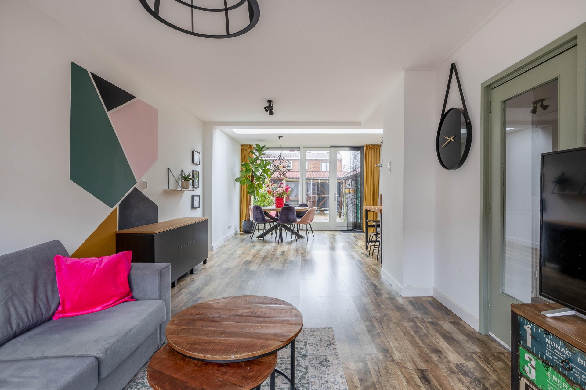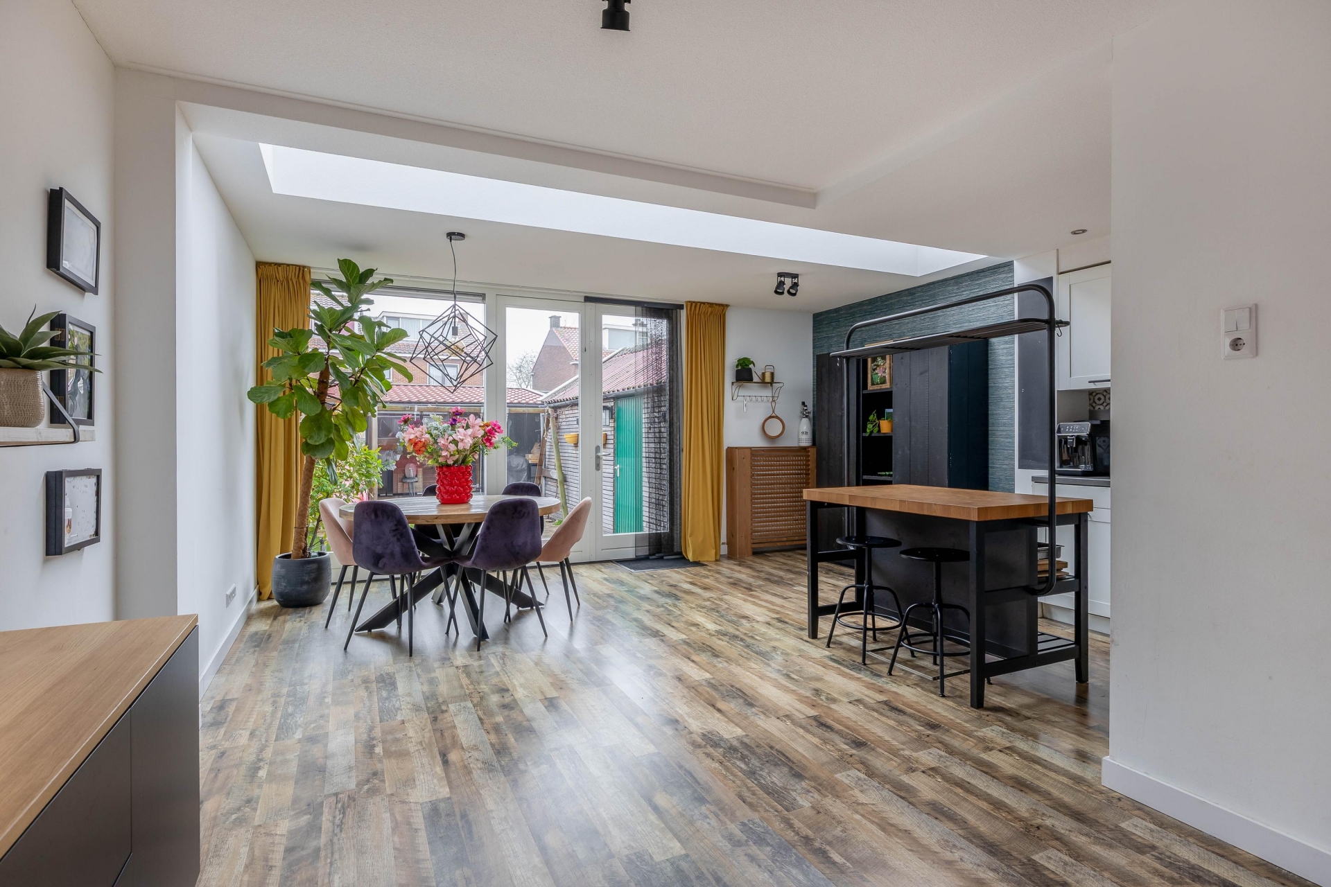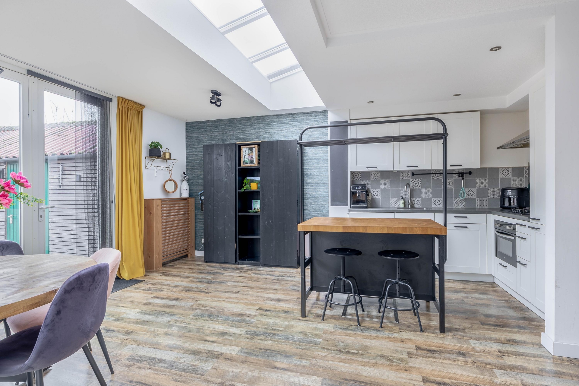 De begane grond is uitgebouwd en voelt ruim en licht aan, mede dankzij de lichtstraat in de uitbouw aan de achterzijde. Overdag komt het daglicht naar binnen en ’s avonds zorgt de indeling voor een warme, gezellige sfeer. Er is ruimte voor een comfortabele zithoek én een grote eettafel. De open keuken aan de achterzijde is uitgevoerd met diverse inbouwapparatuur waaronder een vaatwasser, combi-oven, kookplaat en afzuigkap. De afwerking van de woning is modern en verzorgd, waardoor je hier zonder klussen kunt wonen. Vanuit de uitbouw loop je via de dubbele openslaande deuren direct de tuin in, wat binnen en buiten mooi met elkaar verbindt. De tuin is voorzien van een fraaie loungehoek met overkapping en een berging.