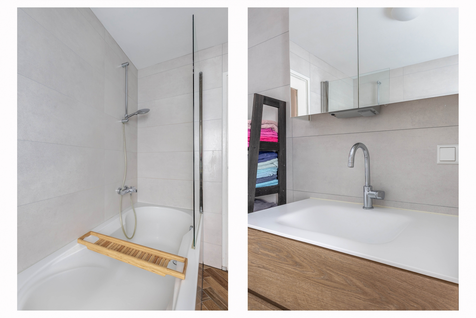 De 1e verdieping geeft toegang tot de eerste 2 slaapkamers waarvan één van de kamers is voorzien van een vaste kastenwand. De ruime badkamer is uitgevoerd met een ligbad, douche, wastafel met badkamermeubel en mechanische ventilatie. Vanuit de hal is een 2e toiletruimte met hangend closet en een wastafel.