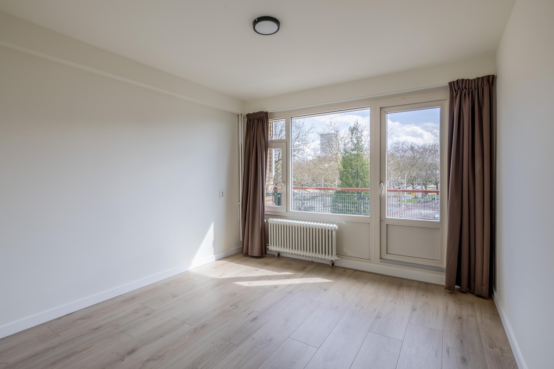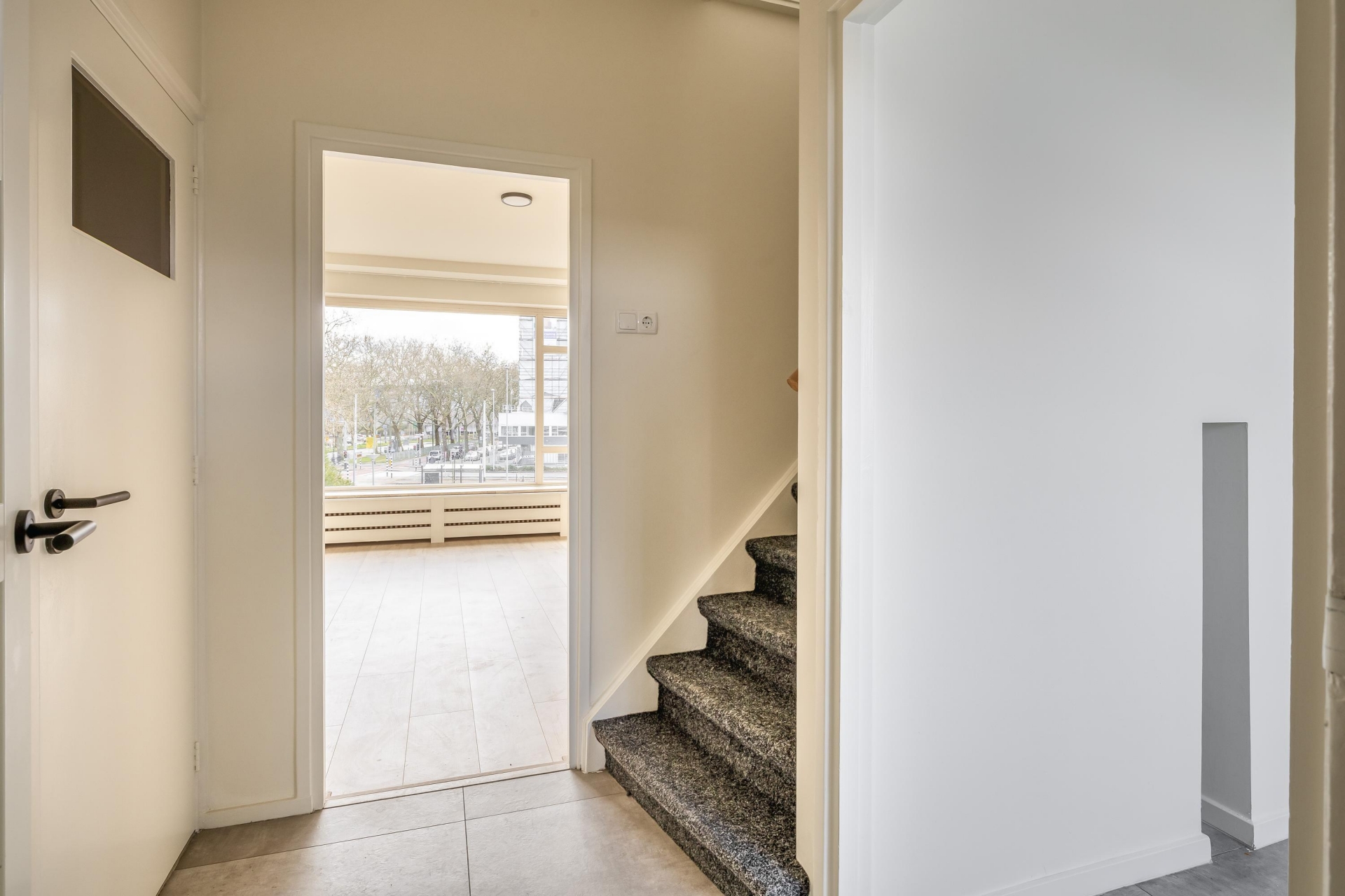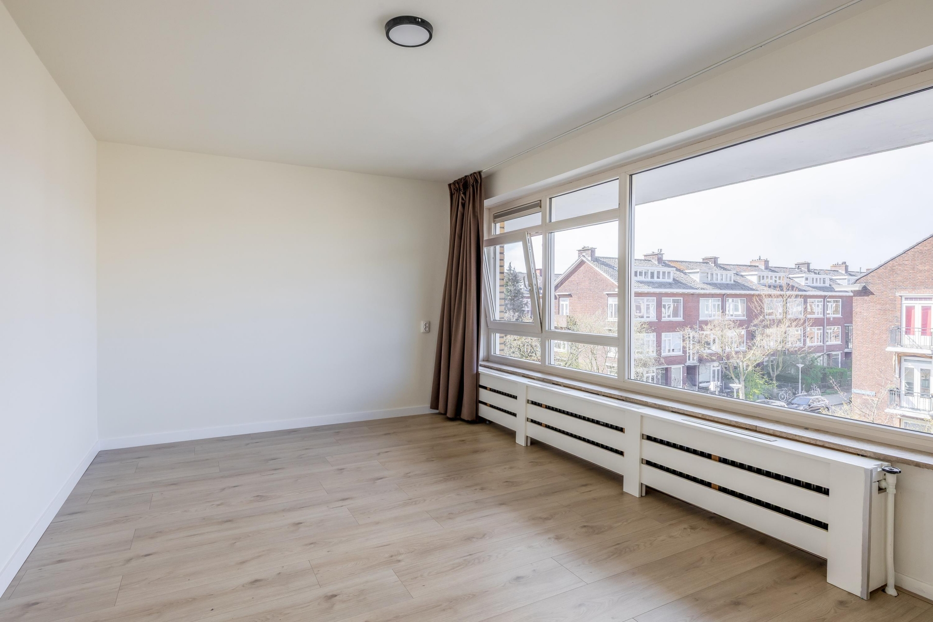 De woonkamer is prettig licht dankzij de grote raampartijen en biedt een levendig uitzicht op het Bentinckplein. De ruimte is praktisch in te delen met een comfortabele zithoek en een eethoek. Door de recente renovatie en het schilderwerk voelt het geheel fris en verzorgd aan. De nieuwe laminaatvloer zorgt voor een rustige en moderne basis die je eenvoudig naar eigen smaak kunt inrichten.