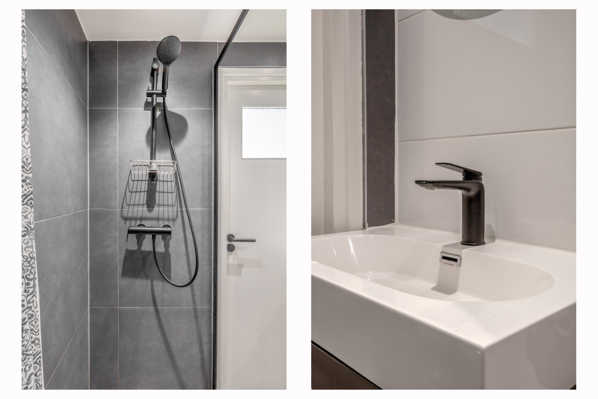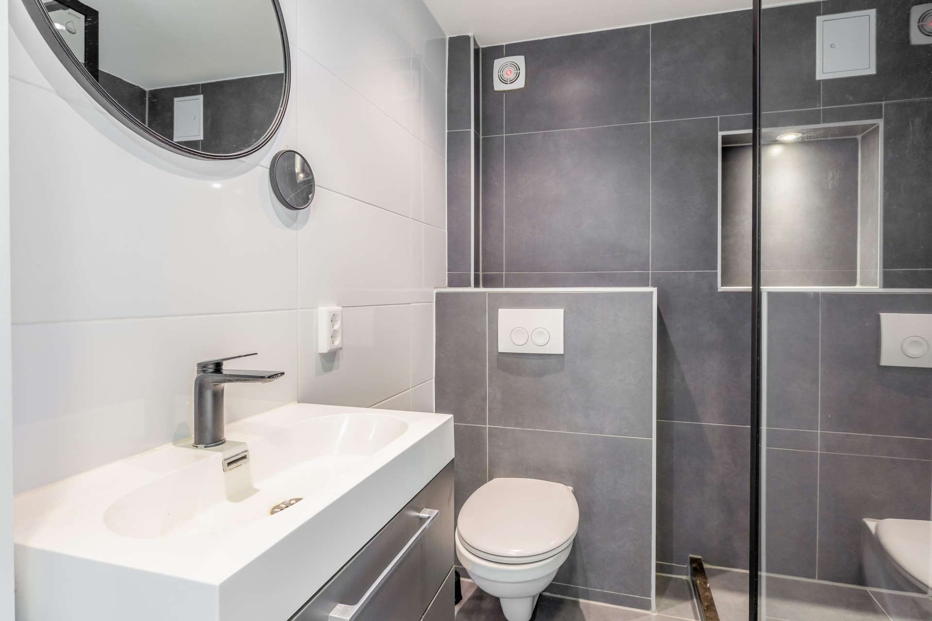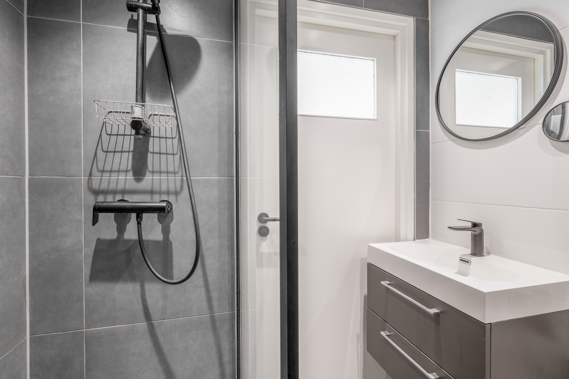 De badkamer is modern uitgevoerd en voorzien van een inloopdouche met regendouche, een wastafelmeubel en een tweede toilet. Alles is netjes afgewerkt en sluit goed aan bij de rest van het huis.