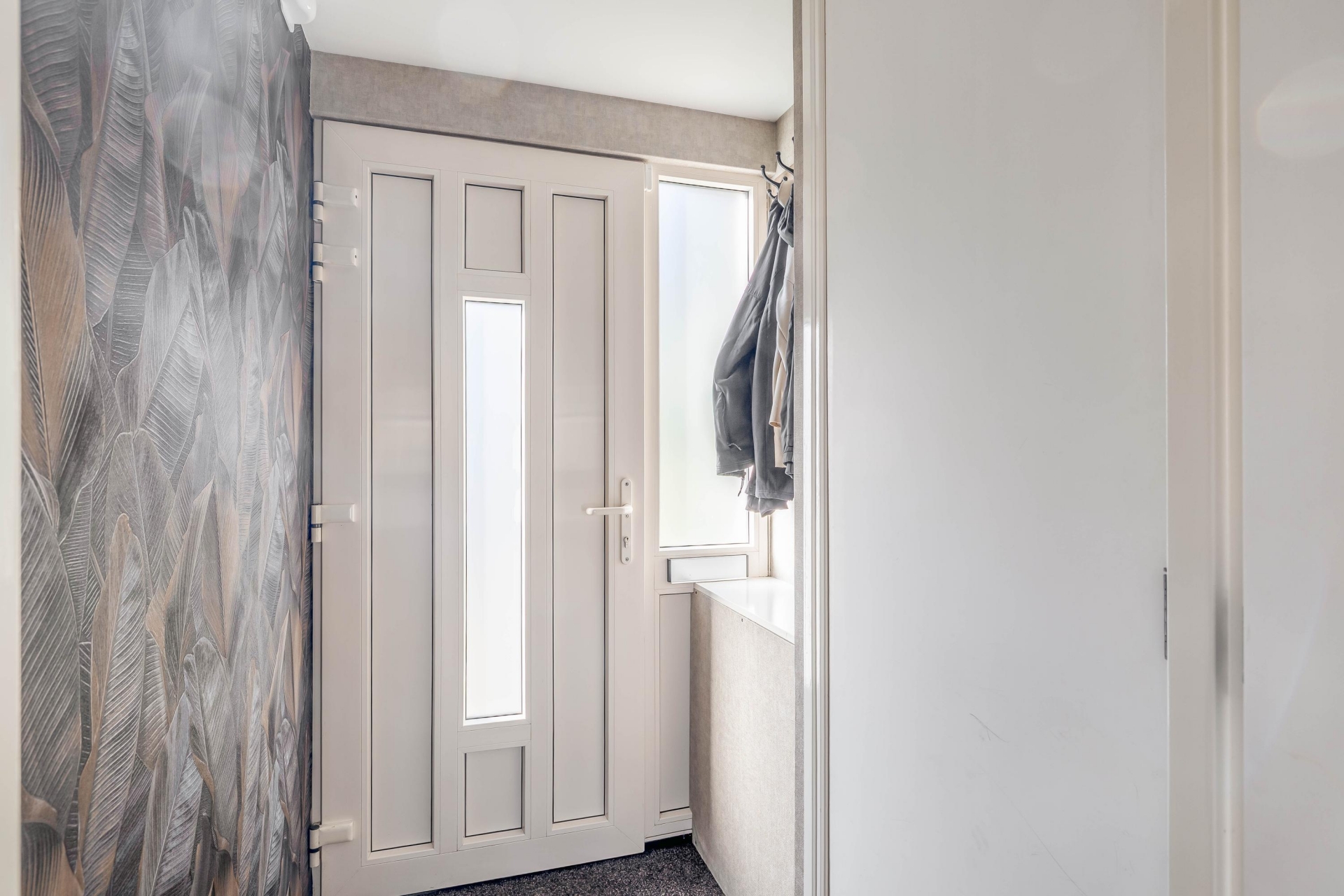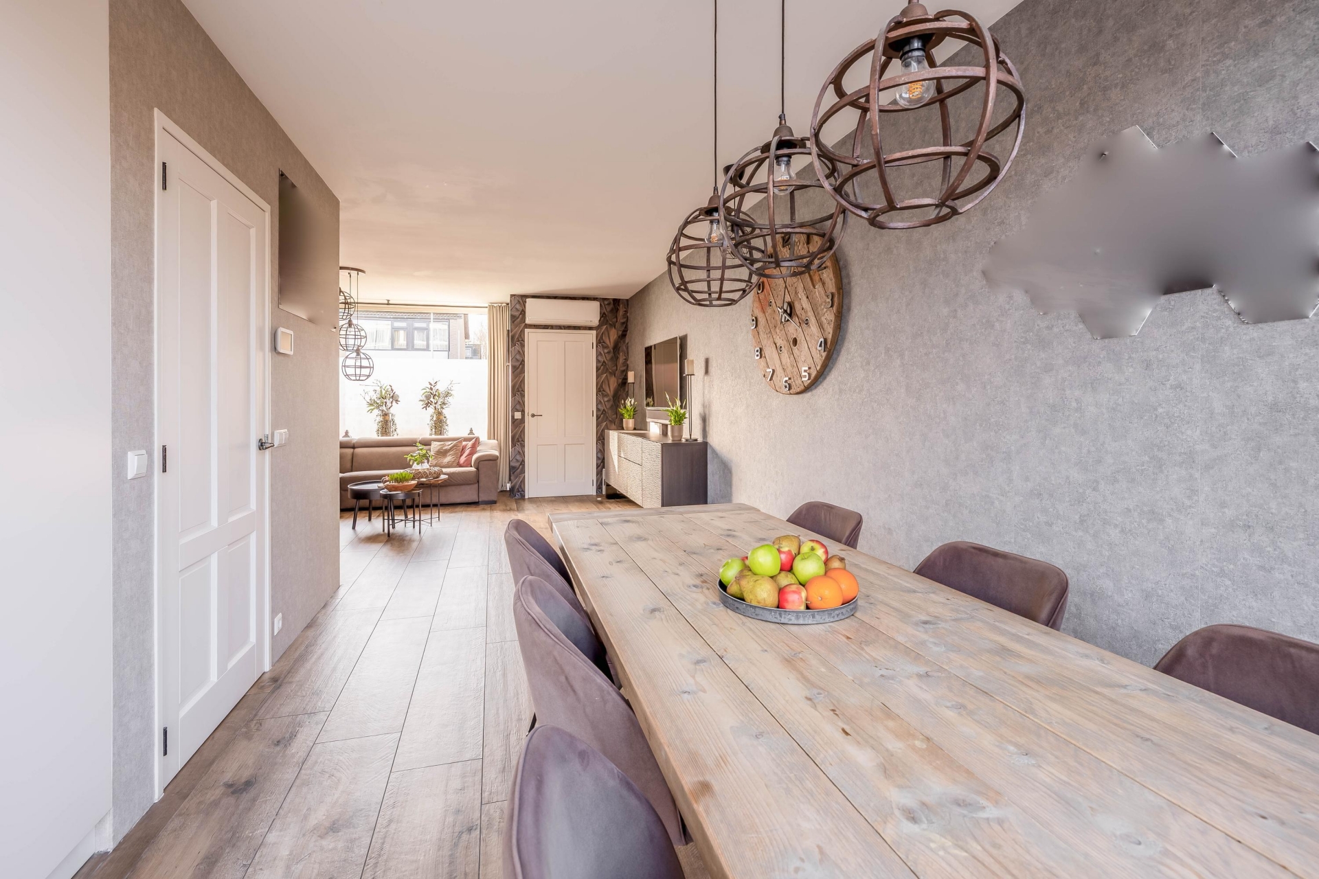 Aan de achterzijde zorgen de grote ramen en de deur naar de tuin voor een fijne verbinding met buiten. Hierdoor voelt de woonkamer nog ruimer en lichter aan. Dit is een plek waar je na een drukke dag heerlijk neerploft op de bank, terwijl de kinderen spelen of huiswerk maken aan de eettafel.