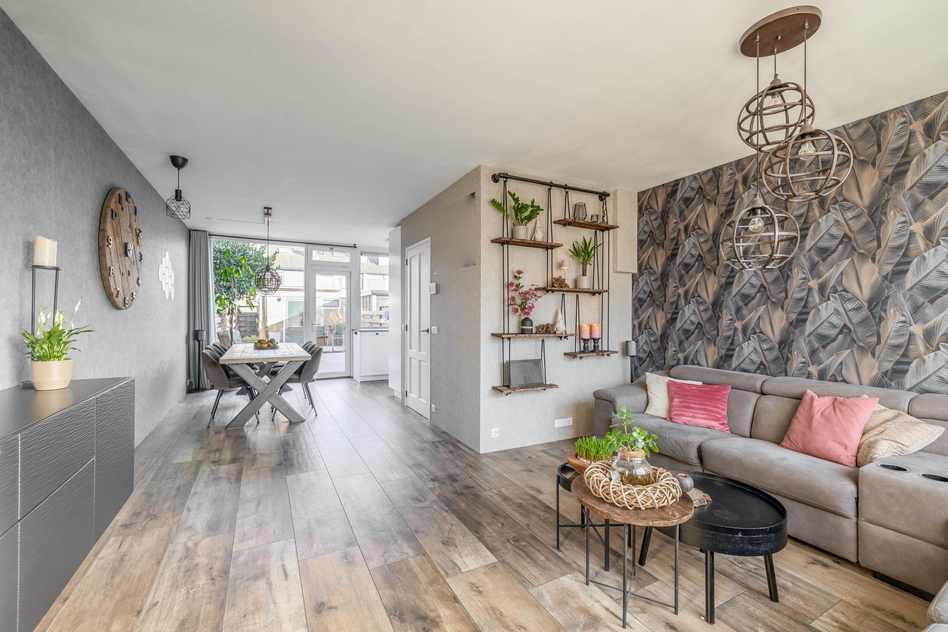 Al bij aankomst en zodra je binnenkomt valt op hoe verzorgd en sfeervol deze woning is. Vanuit de hal stap je de woonkamer binnen, waar het daglicht via de grote ramen en de achterpui prettig naar binnen valt. De woonkamer is ruim en biedt volop plek voor een royale zithoek en een gezellige eethoek.