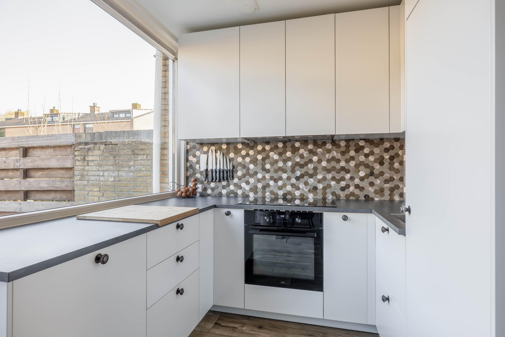 Aan de achterzijde van het huis ligt de keuken, die in 2022 volledig is vernieuwd. De keuken heeft een frisse en moderne uitstraling met lichte kastfronten, een strak werkblad en een opvallende achterwand met hexagon tegels die direct in het oog springen.