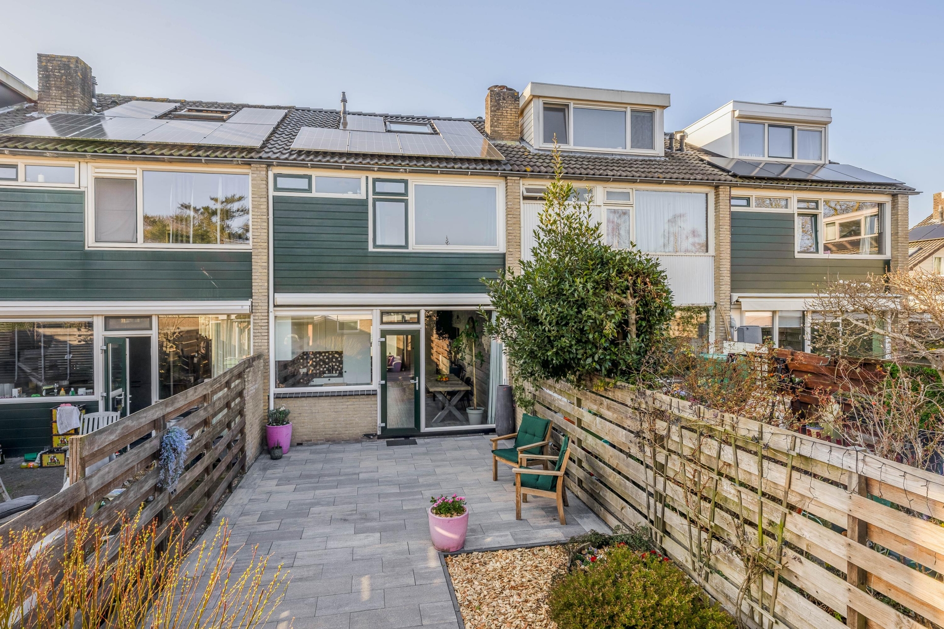 Een van de grote pluspunten van dit huis is zonder twijfel de achtertuin. Deze is opvallend diep en ligt op het zuidoosten, waardoor je hier al vroeg op de dag van de zon kunt genieten.