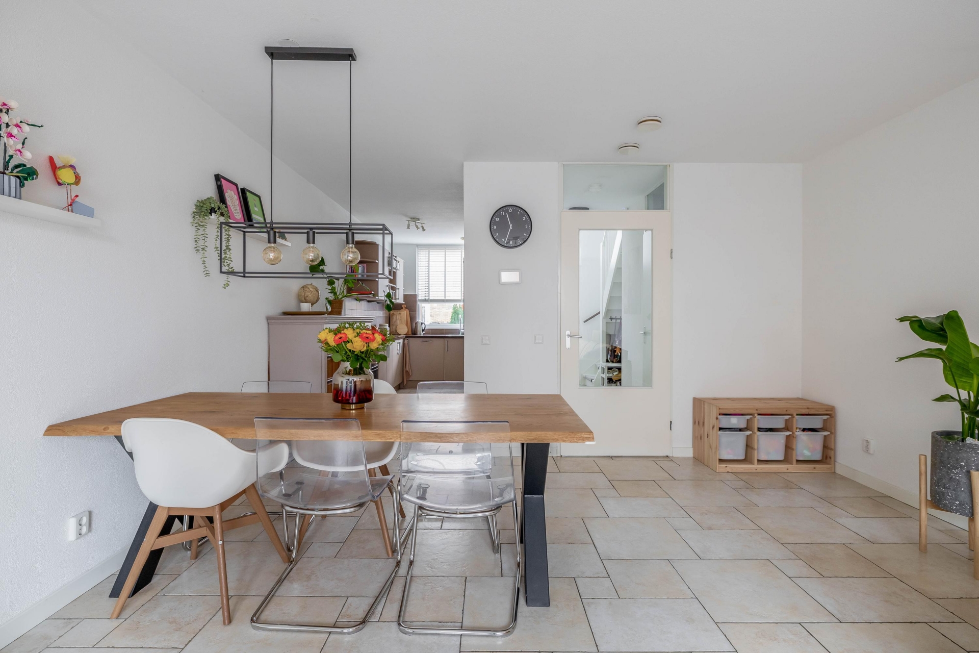 De begane grond is heerlijk licht en overzichtelijk ingedeeld. Bij binnenkomst valt direct de hoge entreehal op, die doorloopt naar de gezellige woonkamer met tuingerichte zithoek en openslaande deuren naar buiten. De strakke vloer, lichte wanden en grote raampartij zorgen voor een moderne uitstraling en fijne sfeer. Er is genoeg ruimte voor een royale zithoek én een grote eettafel, perfect voor gezellige etentjes of lange spelletjesavonden met het gezin.