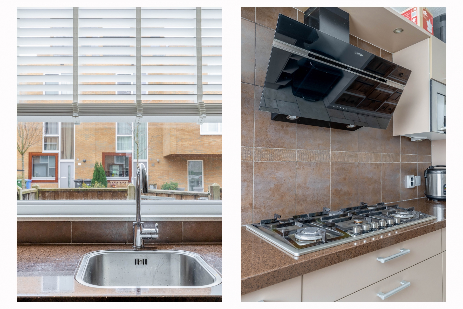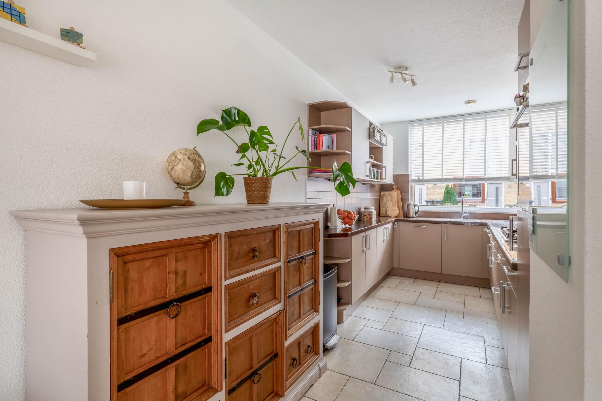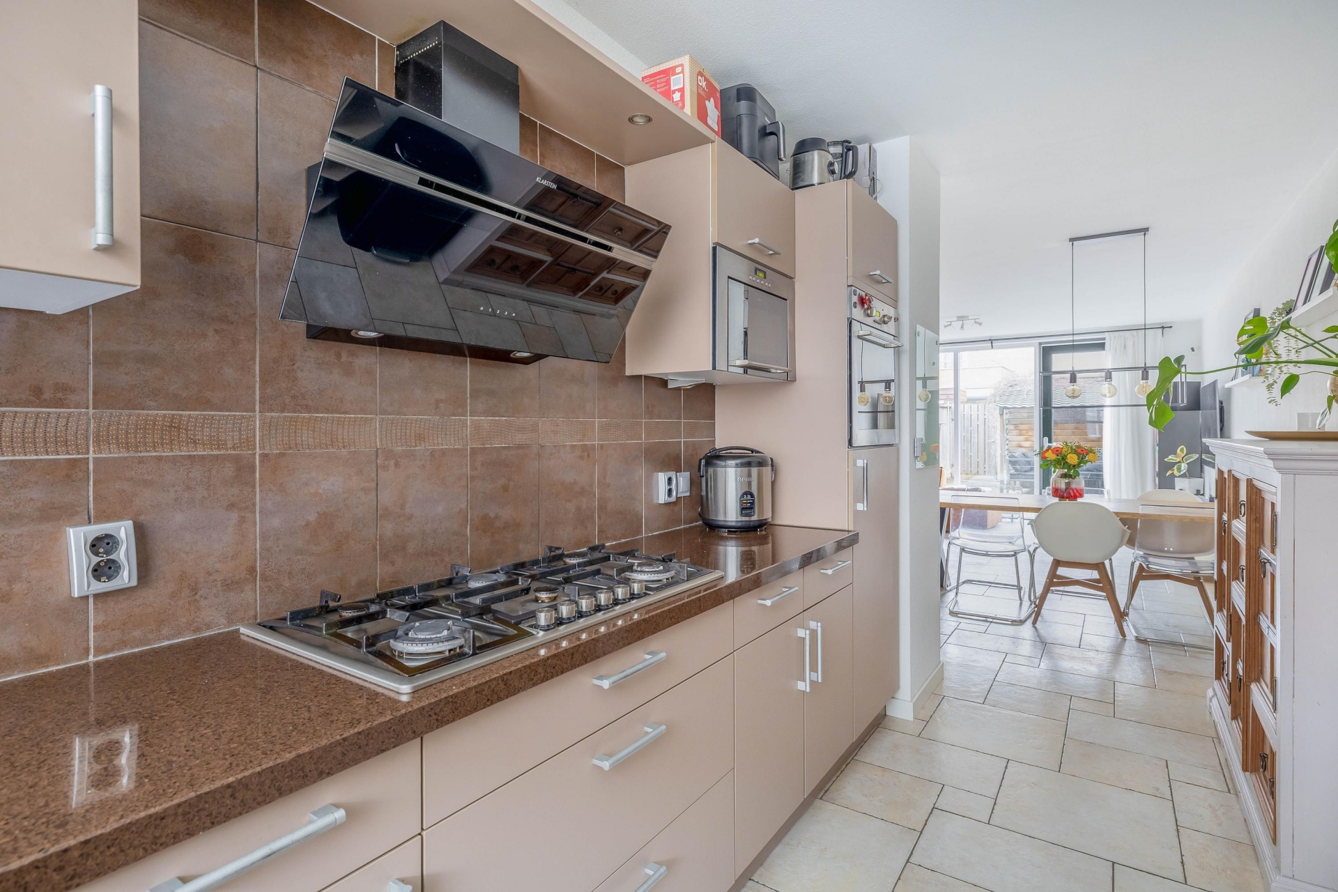 Aan de voorzijde ligt de de half open keuken, uitgevoerd in een warme, neutrale kleurstelling met volop kastruimte, een 5-pits gaskookplaat, afzuigkap, oven, combimagnetron, vaatwasser en koel-/vriescombinatie. De keuken heeft een rechte opstelling met een extra wandkast, wat zorgt voor een praktische en efficiënte indeling.