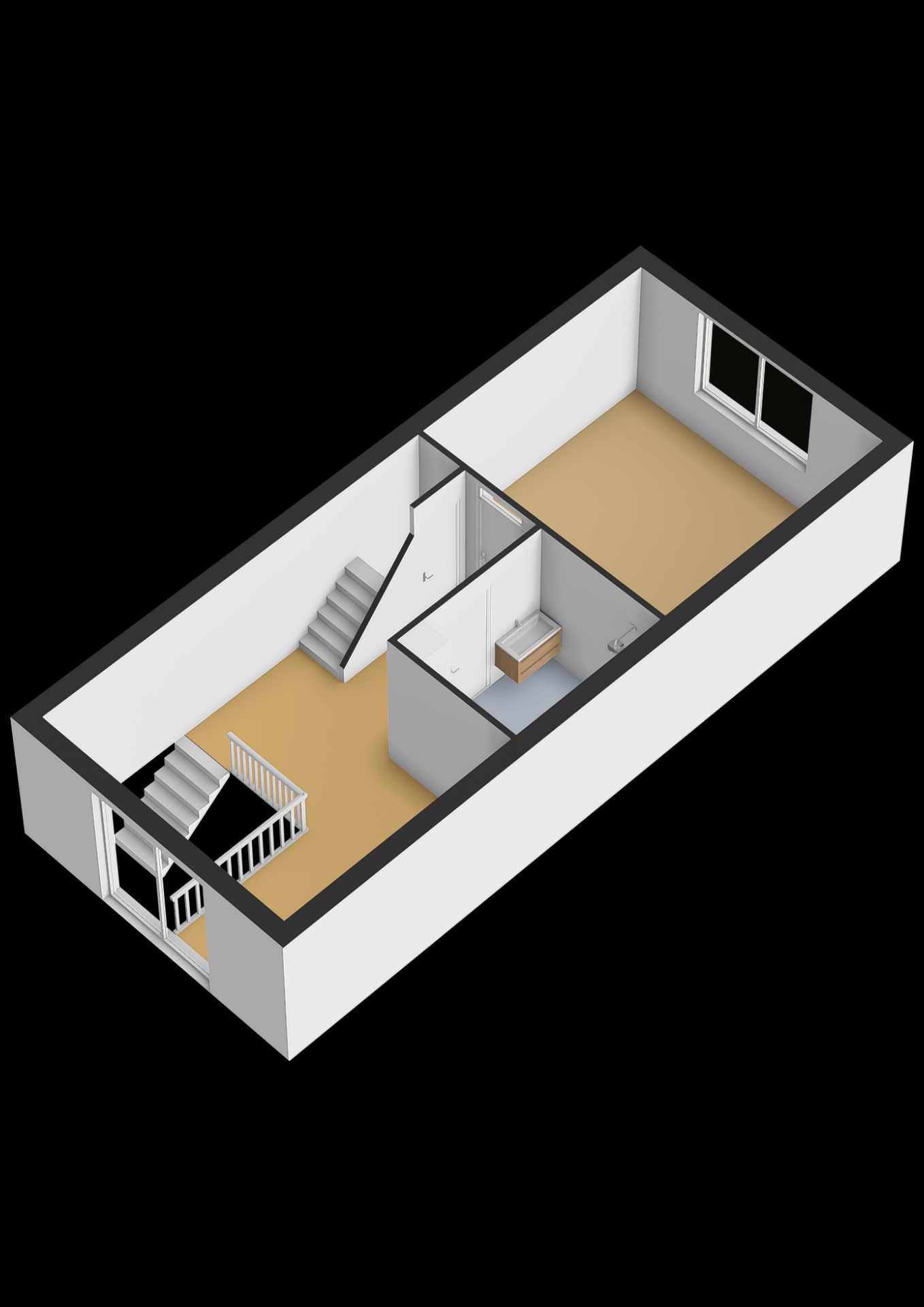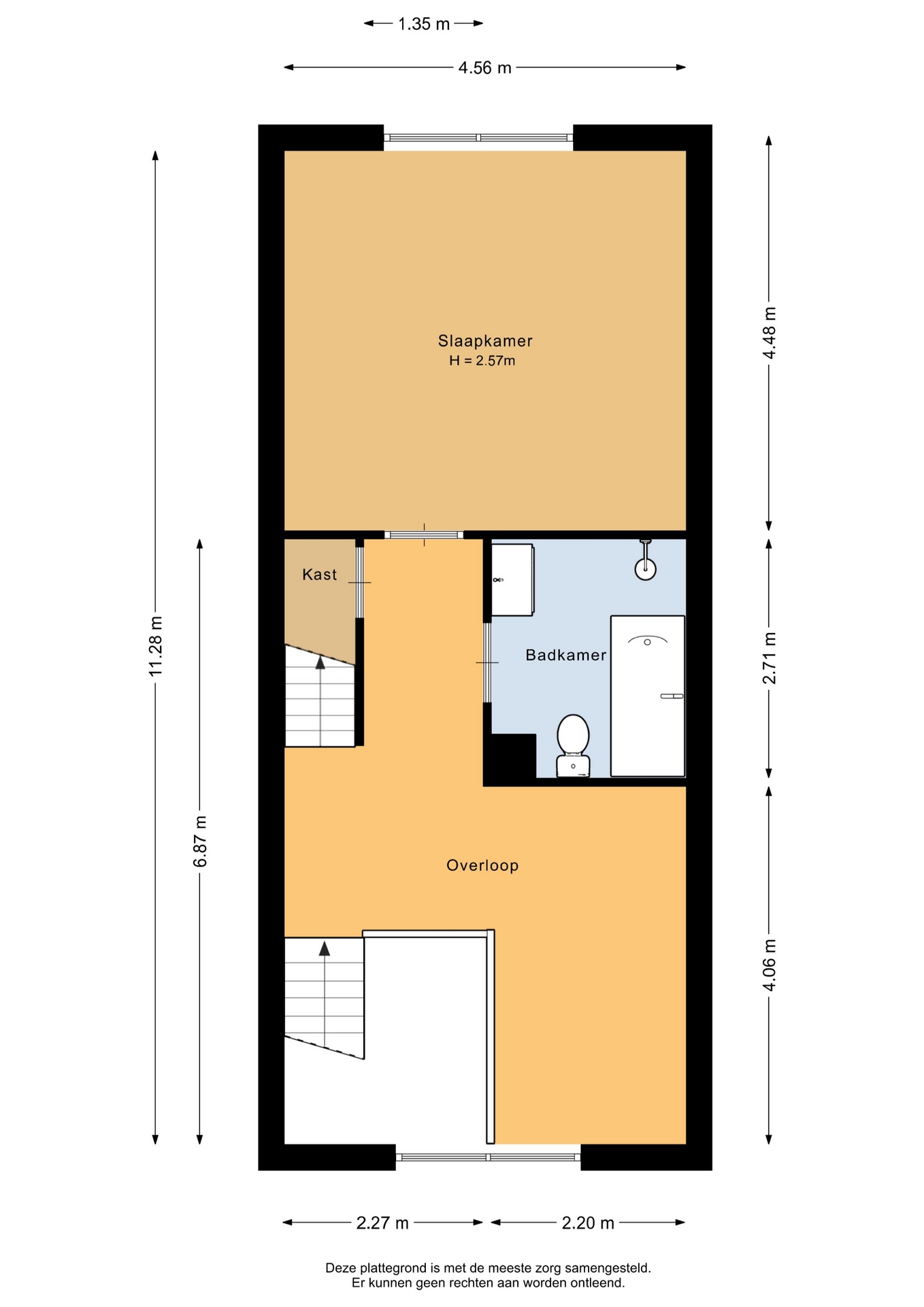 Op de eerste verdieping bevindt zich de grootste slaapkamer, over de volle breedte van de woning. Deze is ruim genoeg voor een groot bed en een kledingkast, en heeft prettig daglicht. De badkamer is compleet uitgevoerd met een ligbad, inloopdouche, toilet en wastafelmeubel.