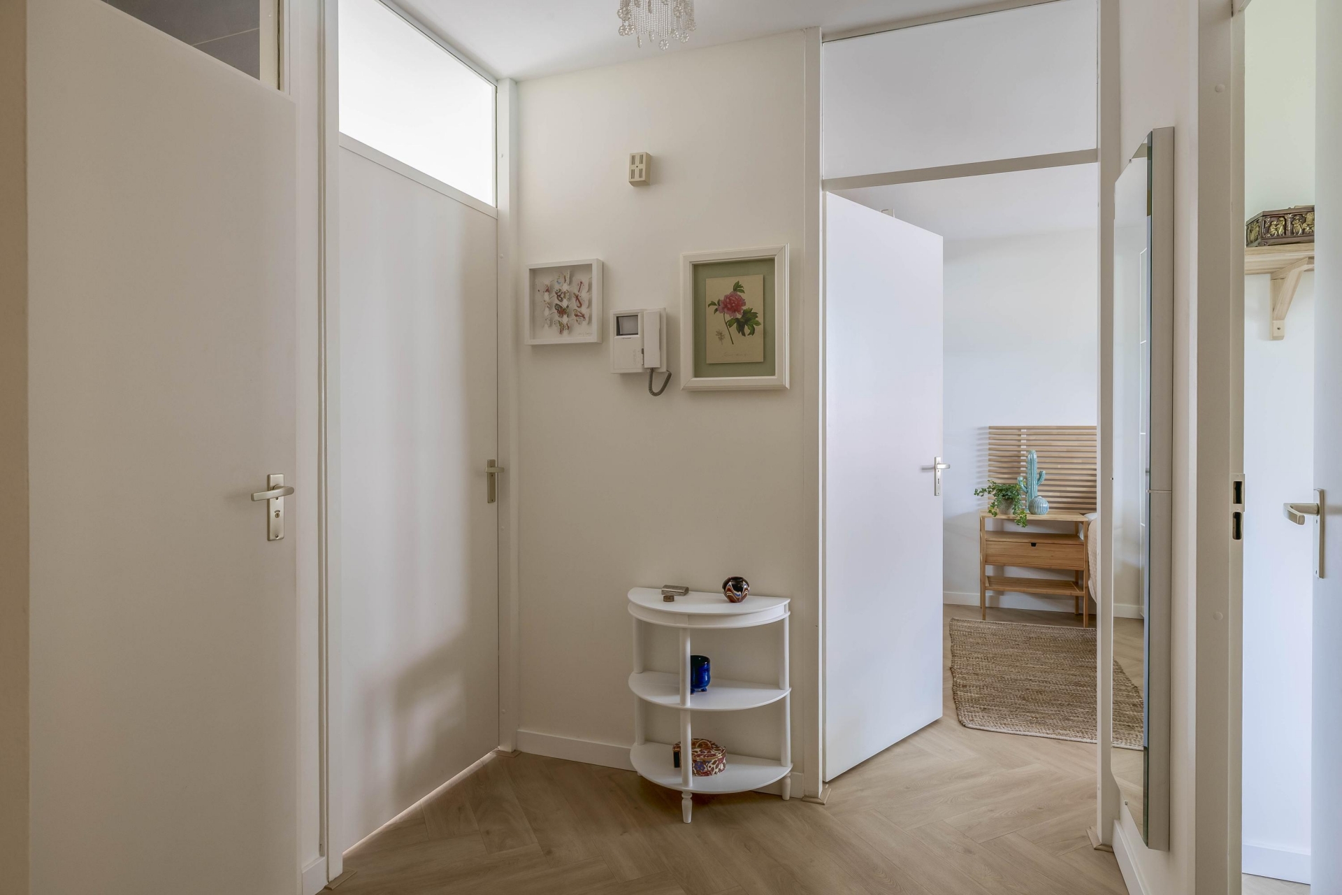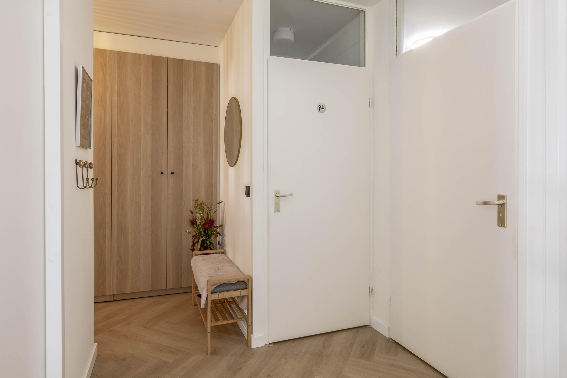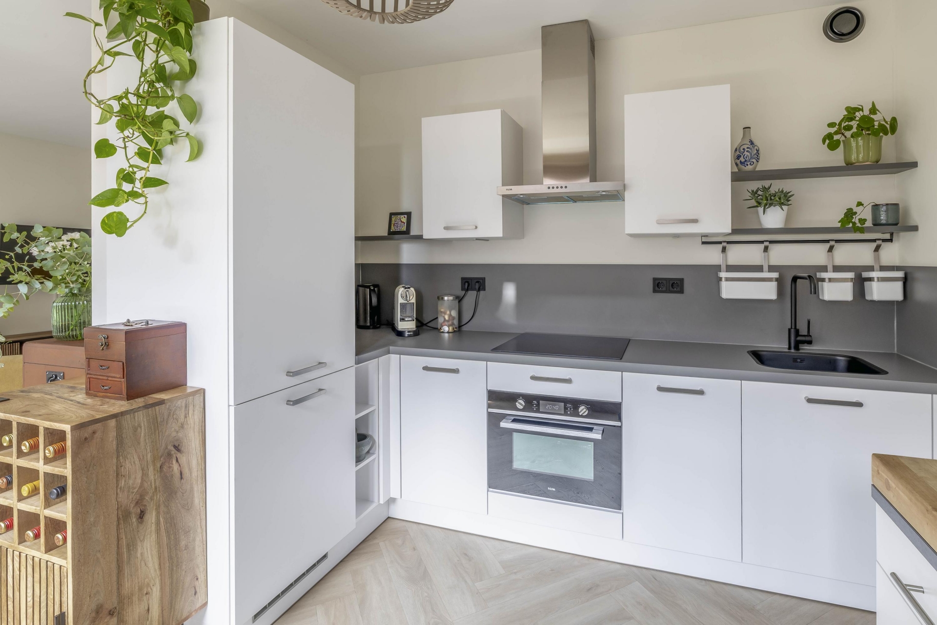 In de afgelopen jaren is veel gerenoveerd. De badkamer, het toilet, de keuken, het stuc- en schilderwerk, de plafonds, de elektra en de vloer – alles is vernieuwd met oog voor stijl en kwaliteit. De keuken is voorzien van moderne inbouwapparatuur, waaronder een combi-oven en inductiekookplaat, perfect geïntegreerd in een strakke opstelling. De nieuwe PVC-vloer loopt naadloos door het appartement en zorgt voor een rustige, moderne basis. In de hal zijn op maat gemaakte inbouwkasten geplaatst, wat zorgt voor extra bergruimte en een nette uitstraling.