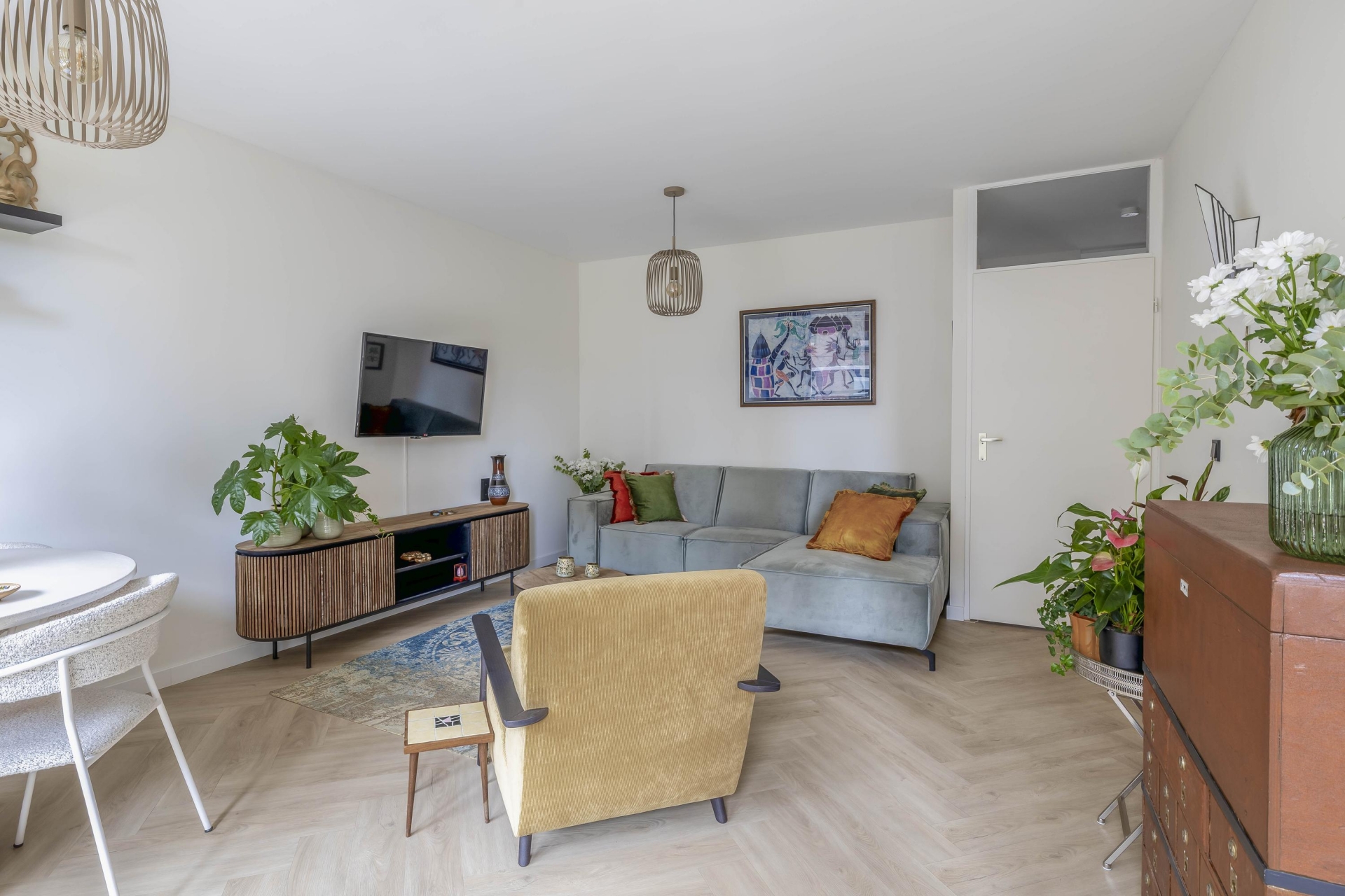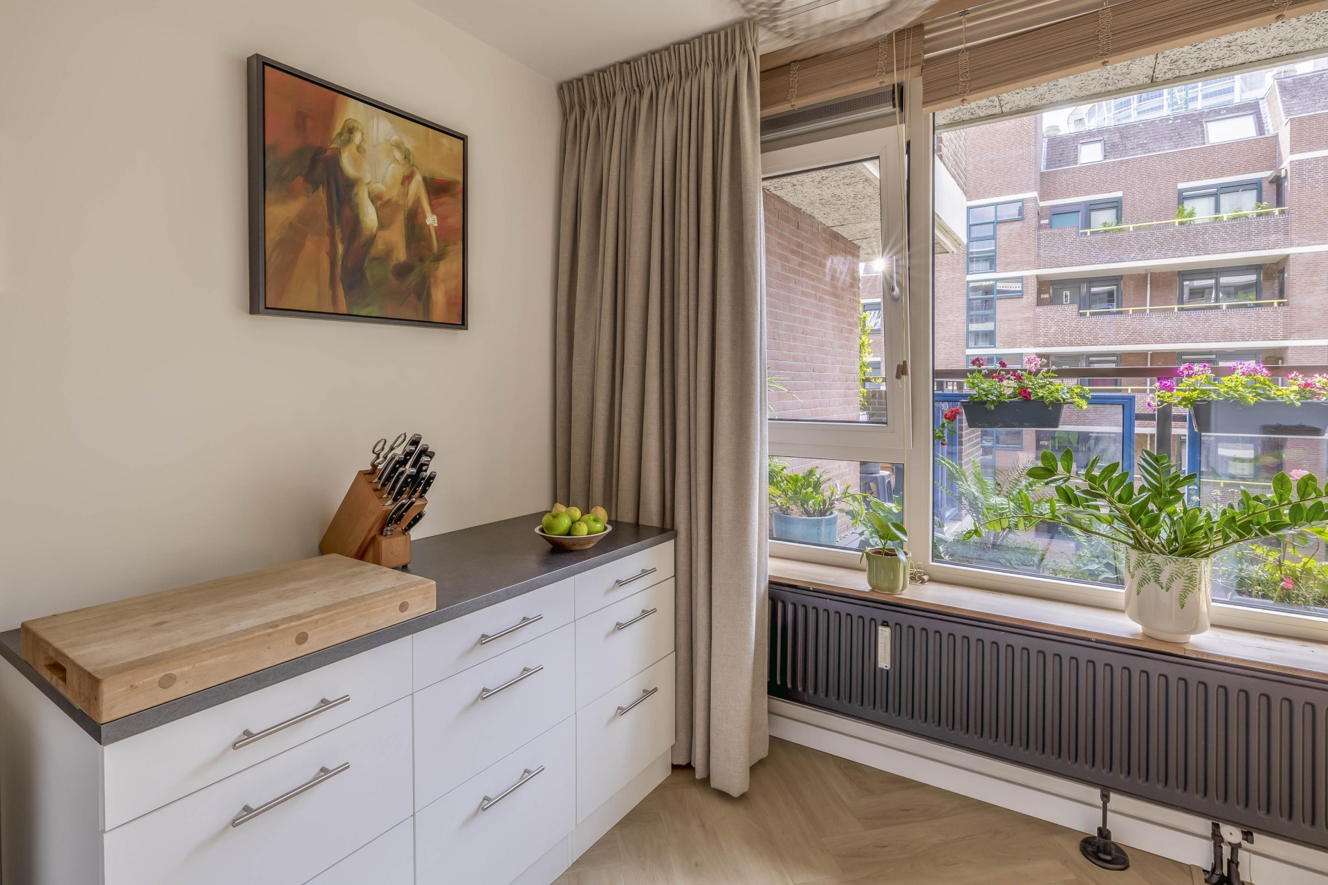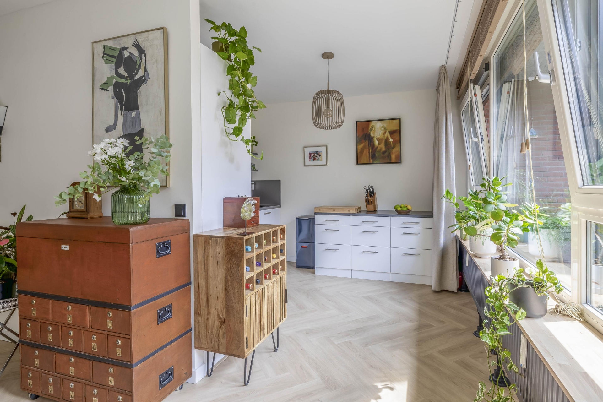 In de afgelopen jaren is veel gerenoveerd. De badkamer, het toilet, de keuken, het stuc- en schilderwerk, de plafonds, de elektra en de vloer – alles is vernieuwd met oog voor stijl en kwaliteit. De keuken is voorzien van moderne inbouwapparatuur, waaronder een combi-oven en inductiekookplaat, perfect geïntegreerd in een strakke opstelling. De nieuwe PVC-vloer loopt naadloos door het appartement en zorgt voor een rustige, moderne basis. In de hal zijn op maat gemaakte inbouwkasten geplaatst, wat zorgt voor extra bergruimte en een nette uitstraling.