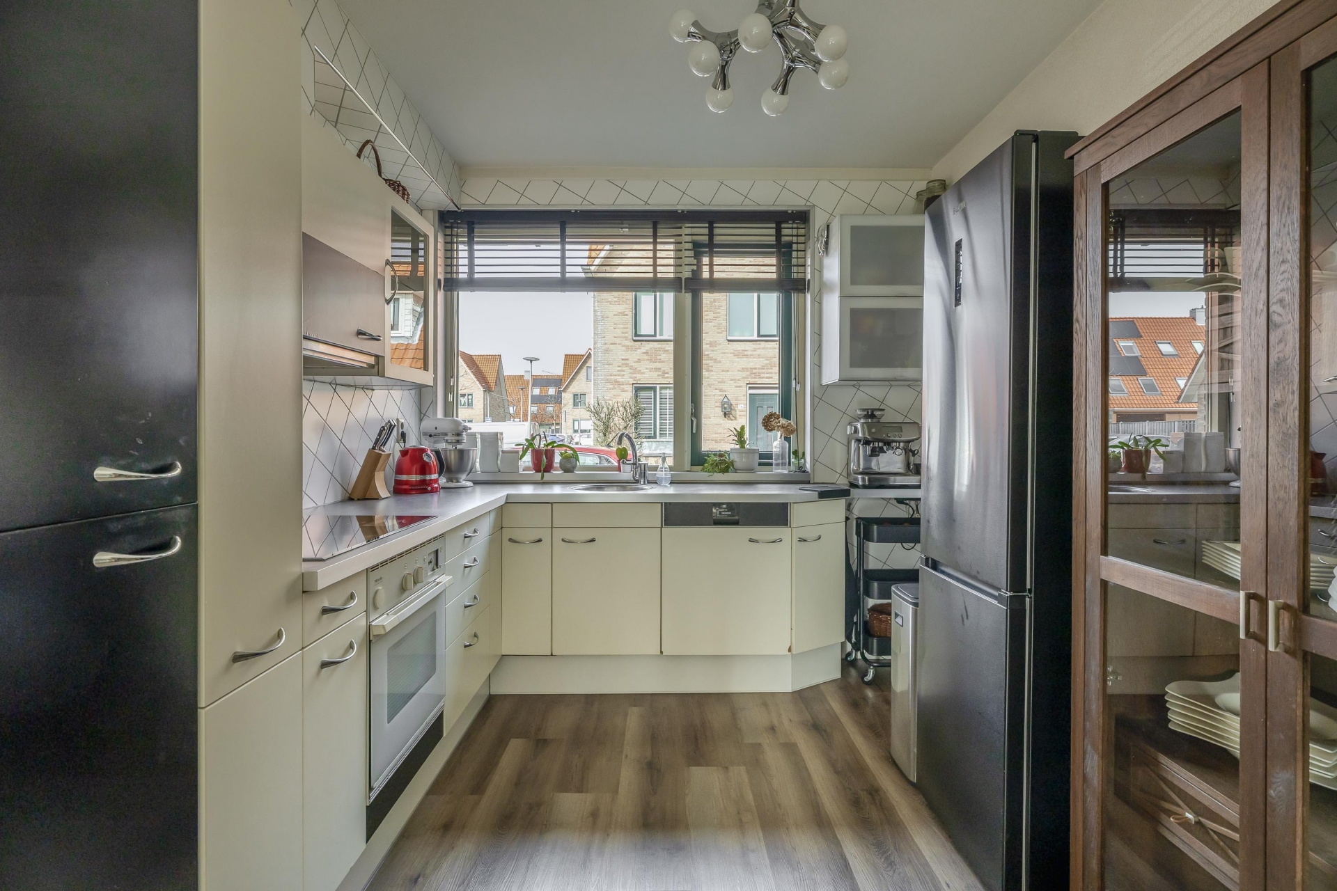 Entree woning; hal met meterkast en toiletruimte met hangend closet en fonteintje; tuingerichte woonkamer met wandmeubel, trapkast en toegang naar de zonnige achtertuin. Aan de voorzijde de halfopen keuken met diverse inbouwapparatuur waaronder een inductie kookplaat, afzuigkap, oven, vriezer en vaatwasser. De achtertuin is fraai aangelegd en voorzien van een onderheide berging met elektra en achterom.