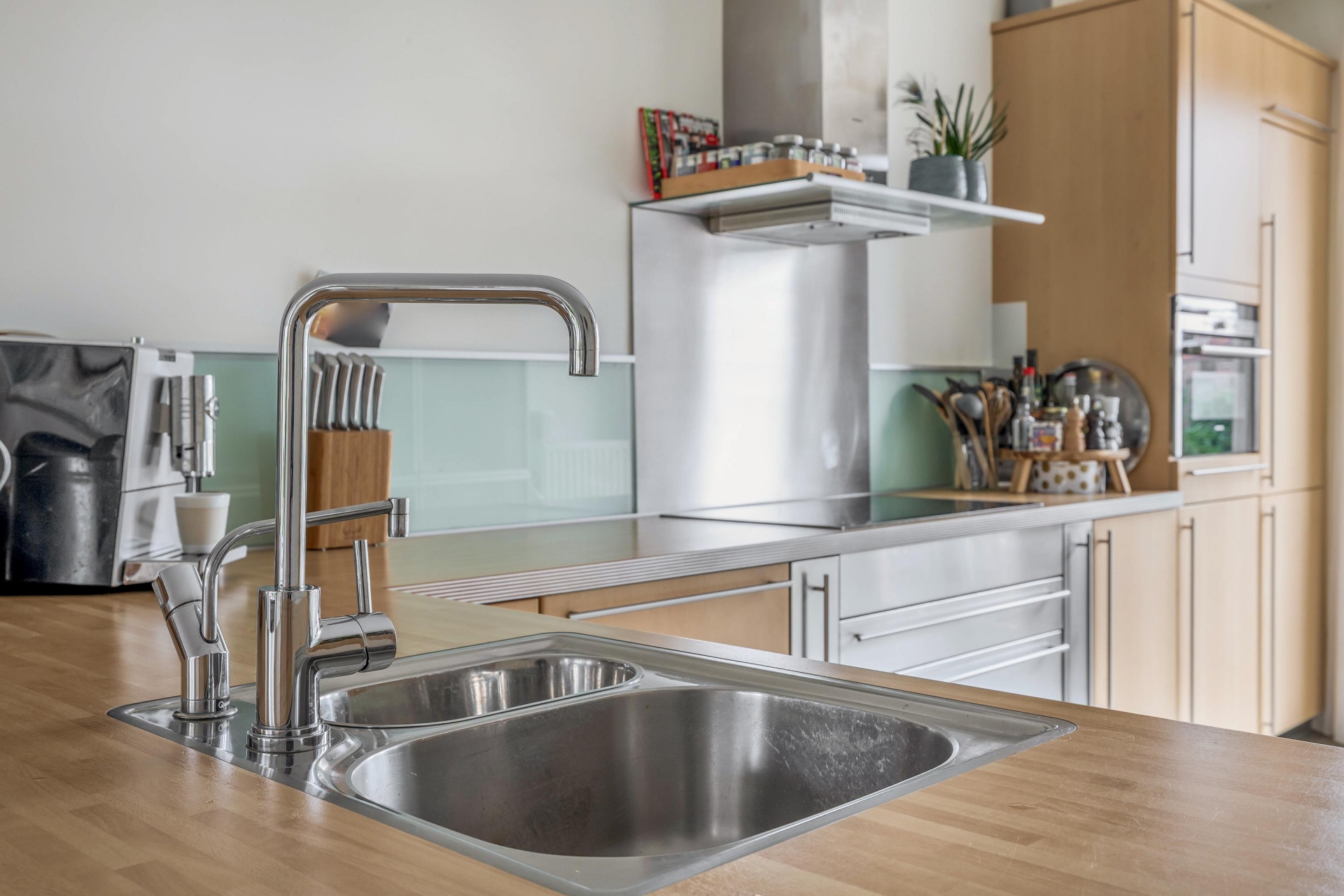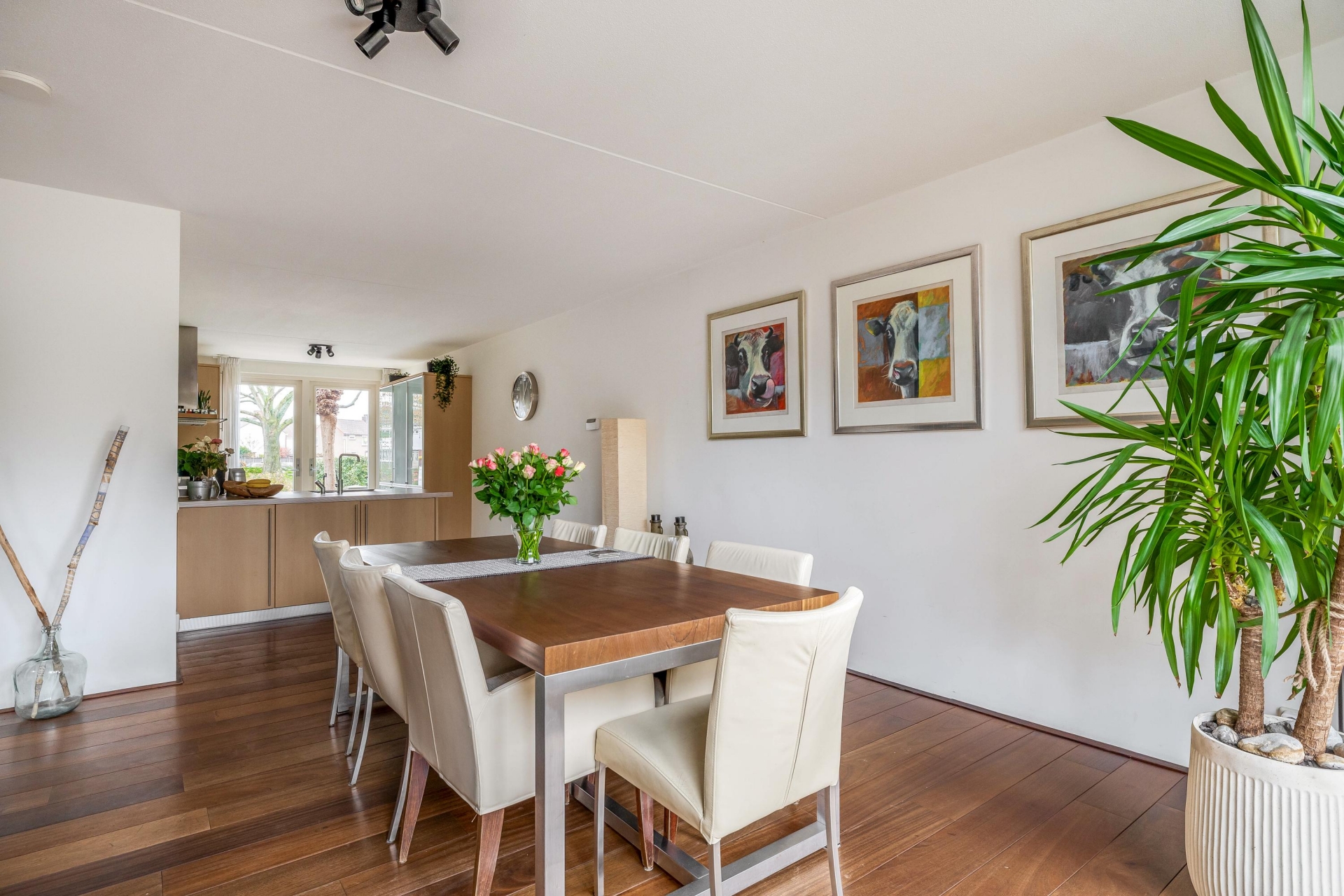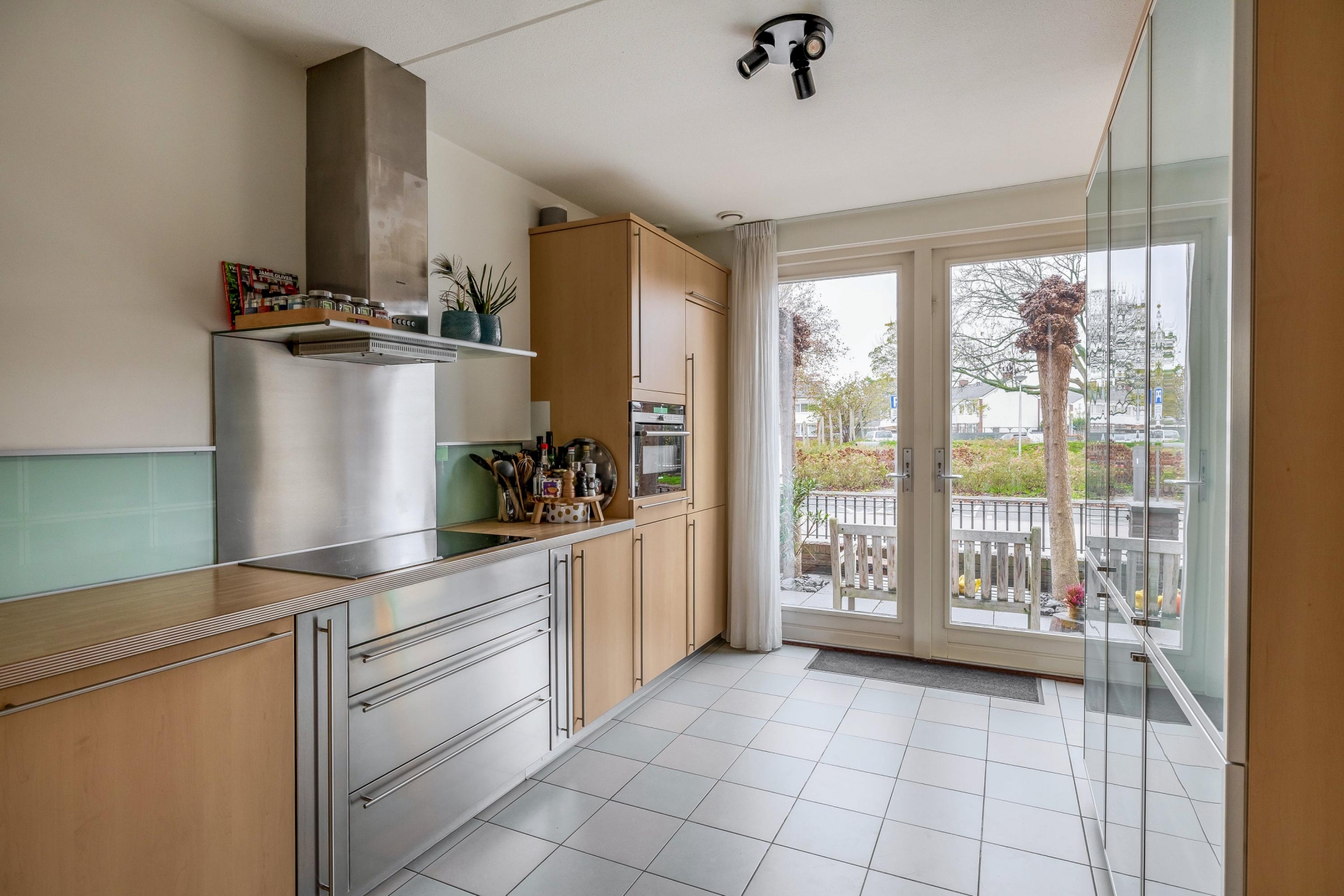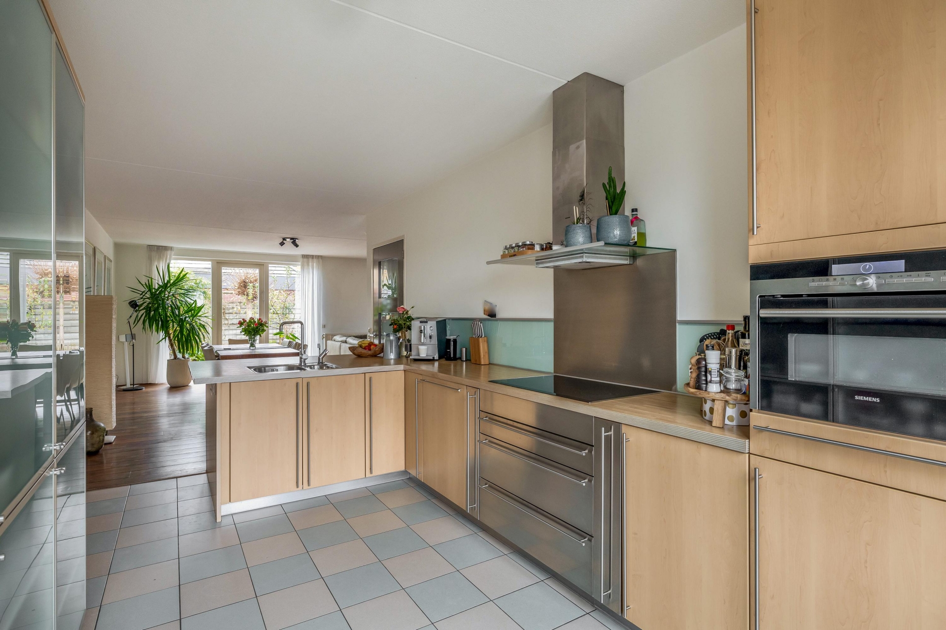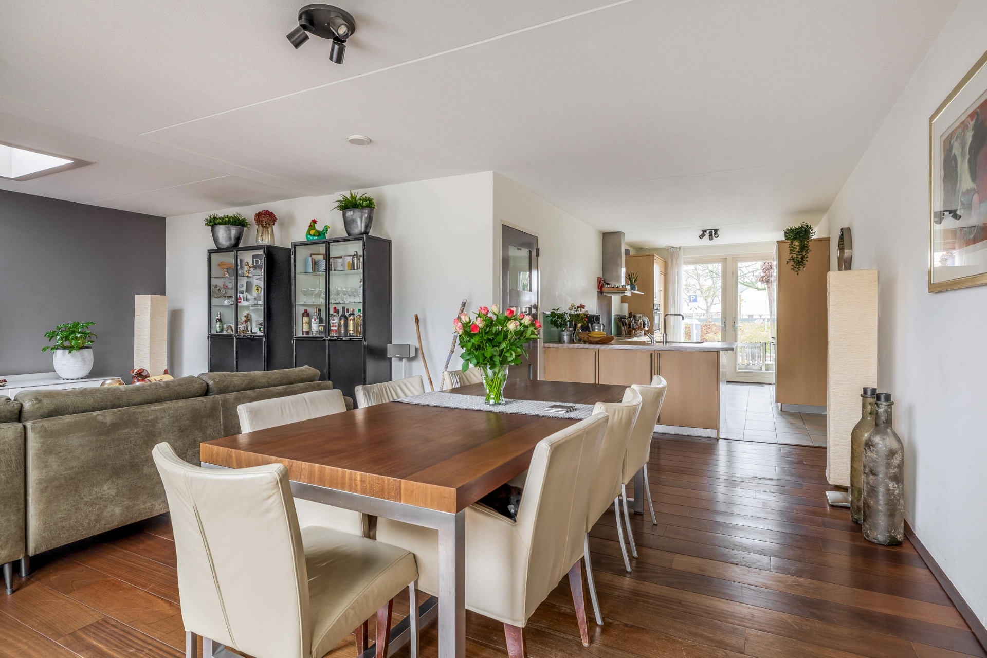 De woonkamer van circa 35 m² is tuingericht en heerlijk licht dankzij de grote raampartijen. Vanuit hier kijk je zo de groene achtertuin in. De begane grond is praktisch ingedeeld met een ruime hal, toilet, toegang tot de inpandige garage én natuurlijk de open keuken aan de voorzijde. De keuken is voorzien van inbouwapparatuur en een fijne plek voor een grote eettafel, waar je met het hele gezin of met vrienden lekker kunt tafelen. De woonkamer en keuken lopen naadloos in elkaar over en maken dit een fijne leefruimte met volop mogelijkheden.