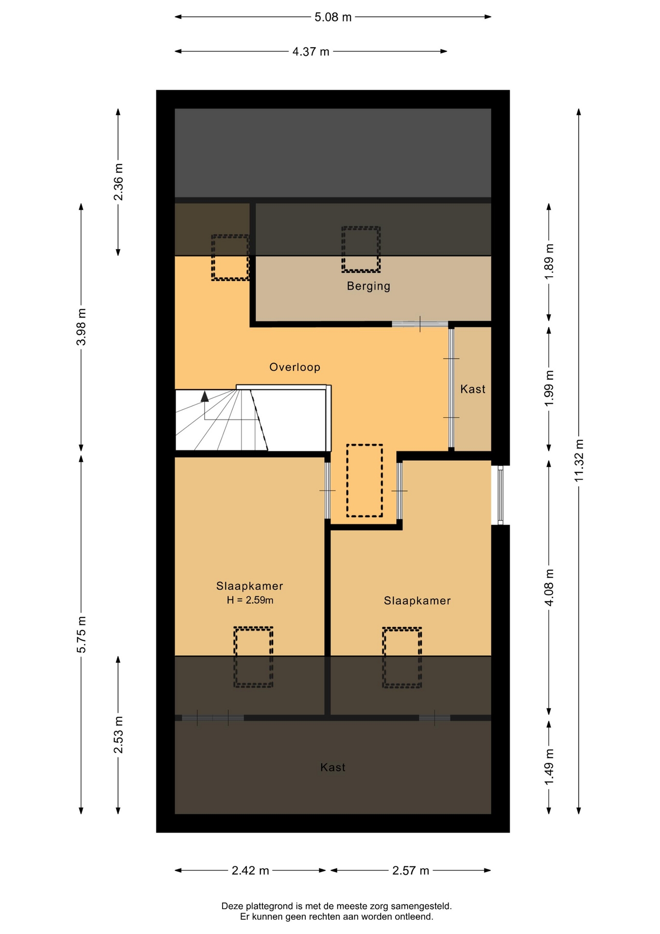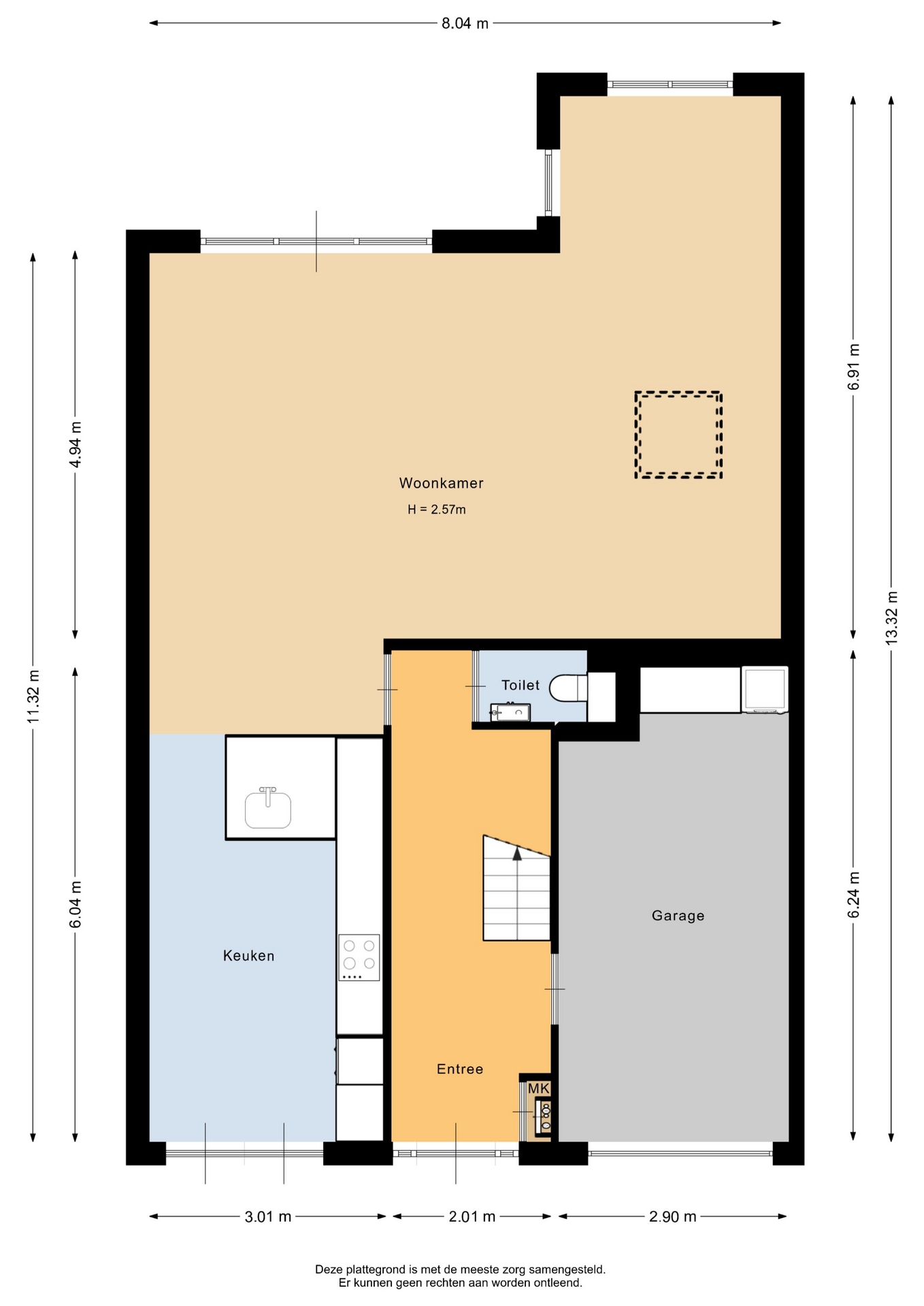 “Deze informatie is door ons met de nodige zorgvuldigheid samengesteld. Onzerzijds wordt echter geen enkele aansprakelijkheid aanvaard voor enige onvolledigheid, onjuistheid of anderszins, dan wel de gevolgen daarvan. Alle opgegeven maten en oppervlakten zijn indicatief.”