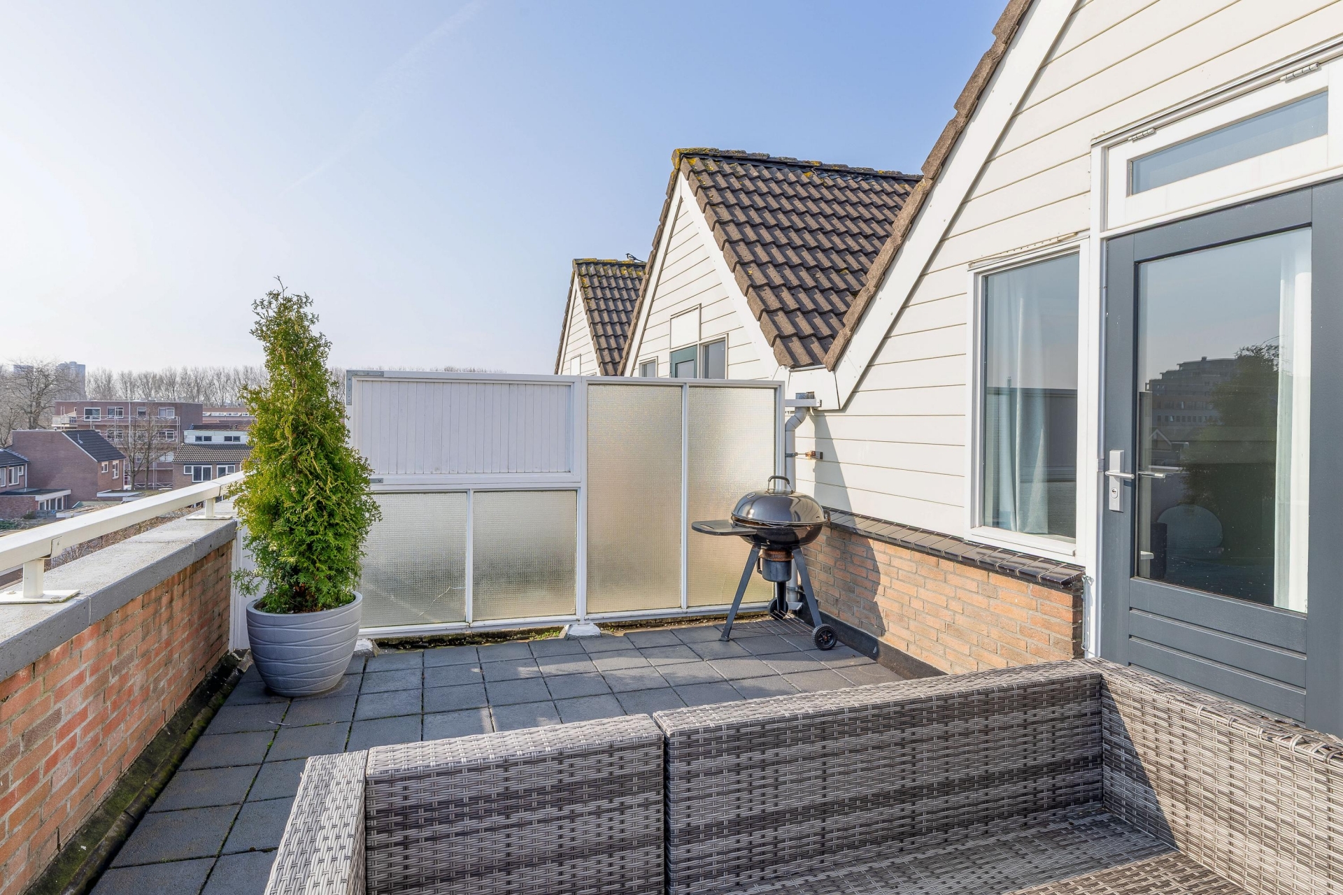 Een van de grootste pluspunten van dit appartement is zonder twijfel het ruime dakterras. Hier heb je verrassend veel buitenruimte tot je beschikking, iets wat je niet vaak tegenkomt bij starterswoningen. Het terras biedt voldoende plek voor een comfortabele loungeset, een eettafel of zelfs een paar plantenbakken om het groen aan te kleden.