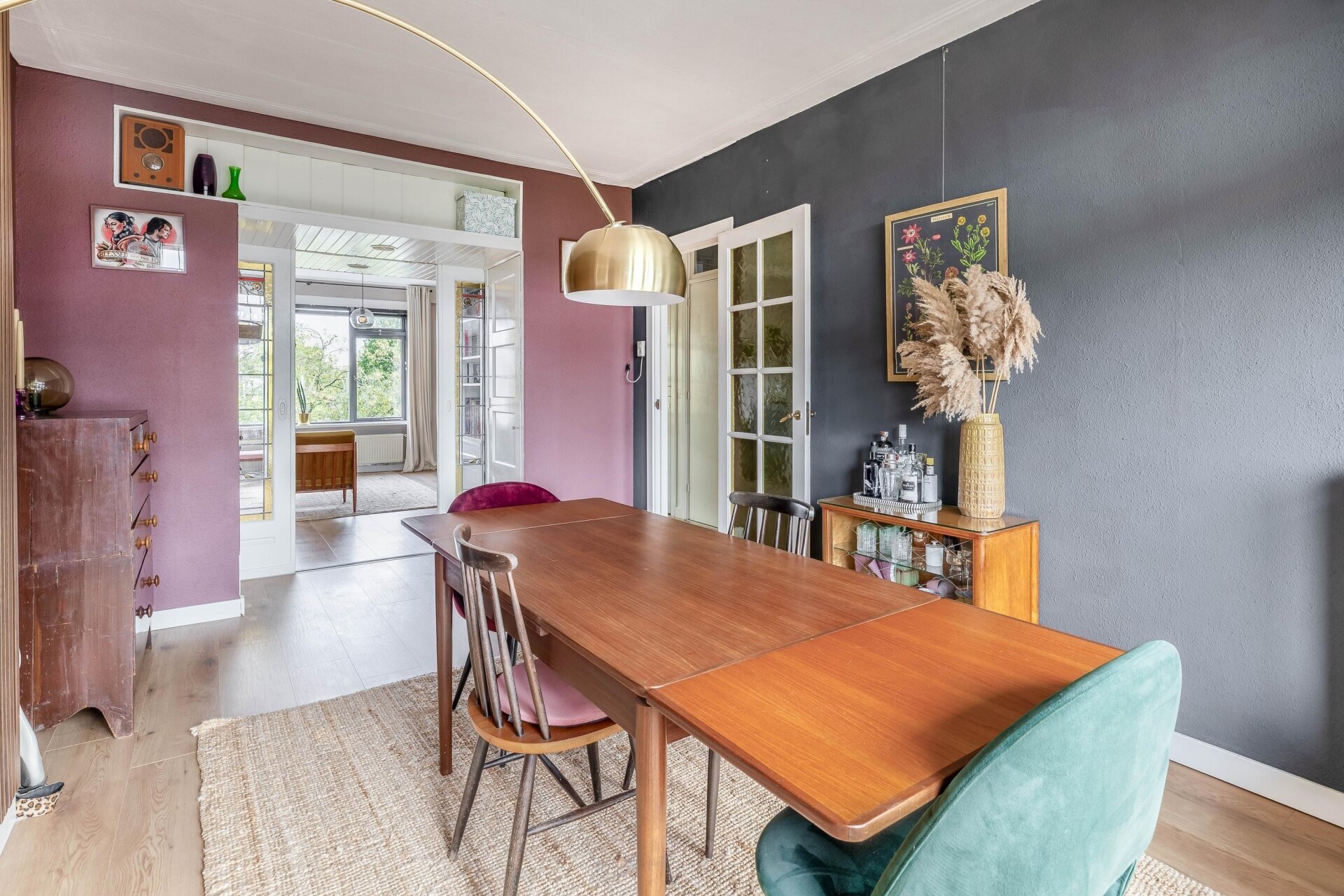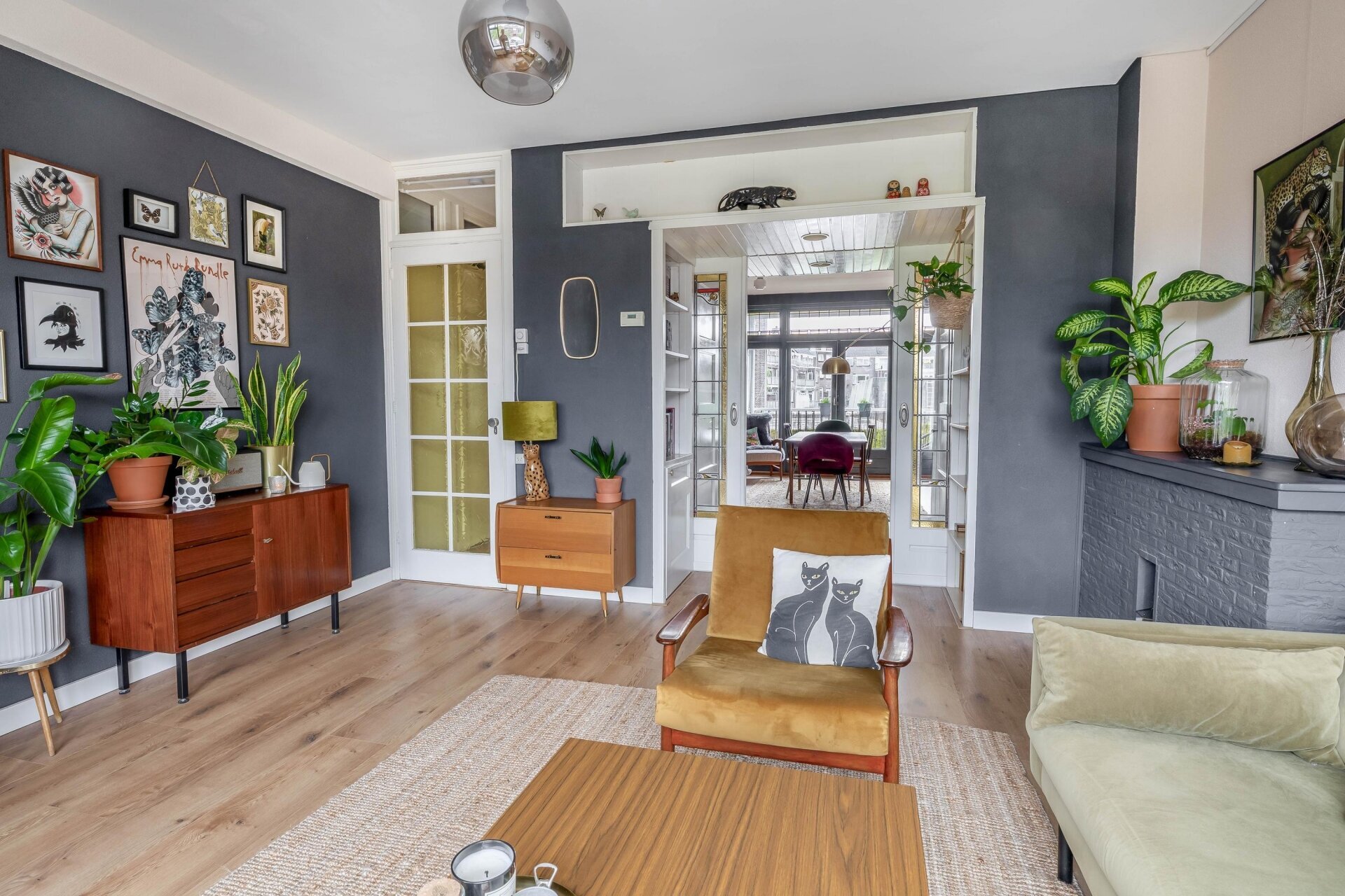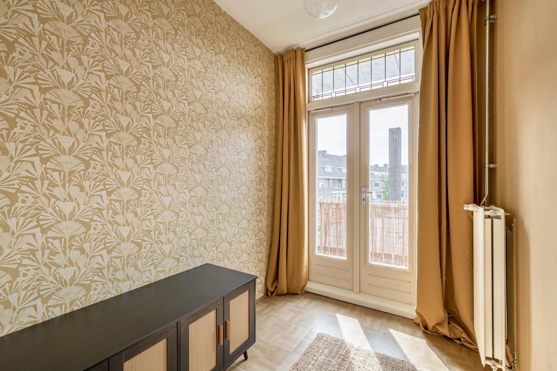 Zodra je de woonkamer binnenstapt, valt de warme sfeer direct op. De ruimte is opgedeeld in een voor- en achterkamer, gescheiden door klassieke en-suite deuren met glas-in-lood en maar liefst vier vaste kasten. Grote ramen en openslaande deuren aan de achterzijde zorgen voor veel daglicht. Hier stap je zo het eerste balkon op, gelegen op het westen, waar je in de middag en avond kunt genieten van de zon.