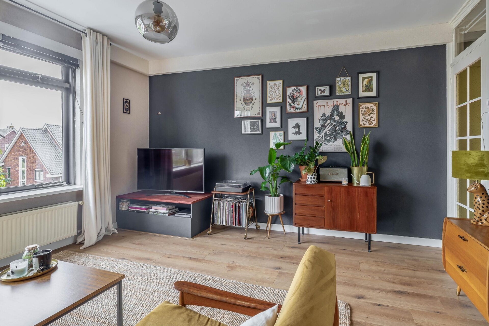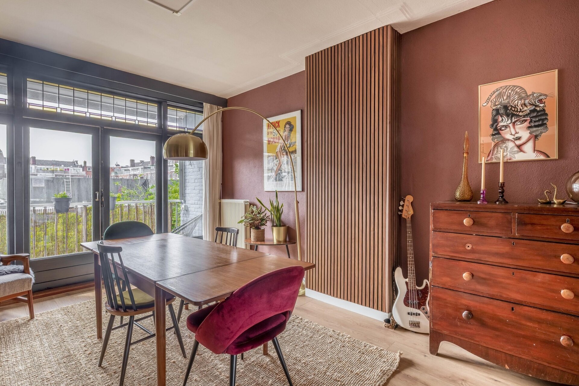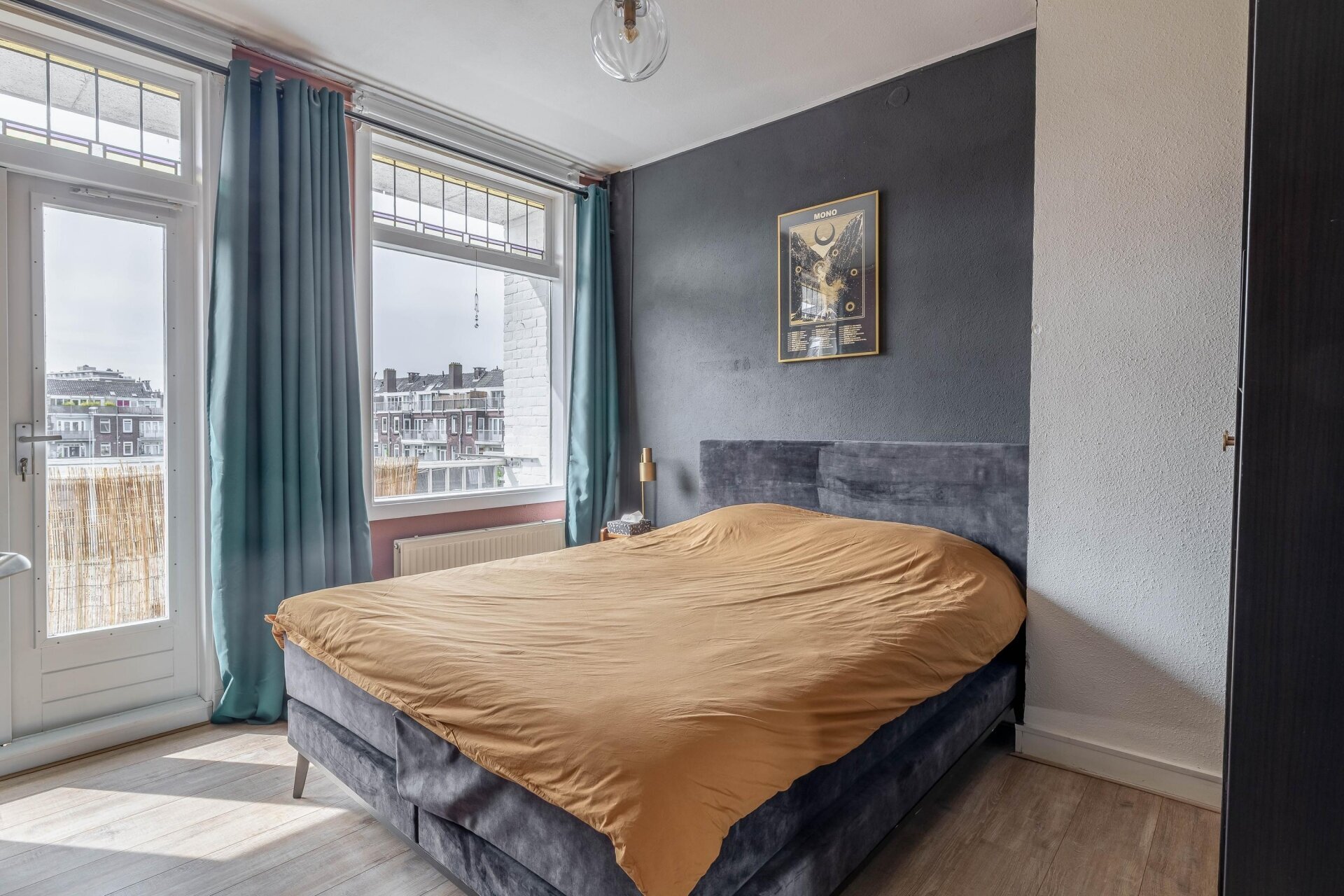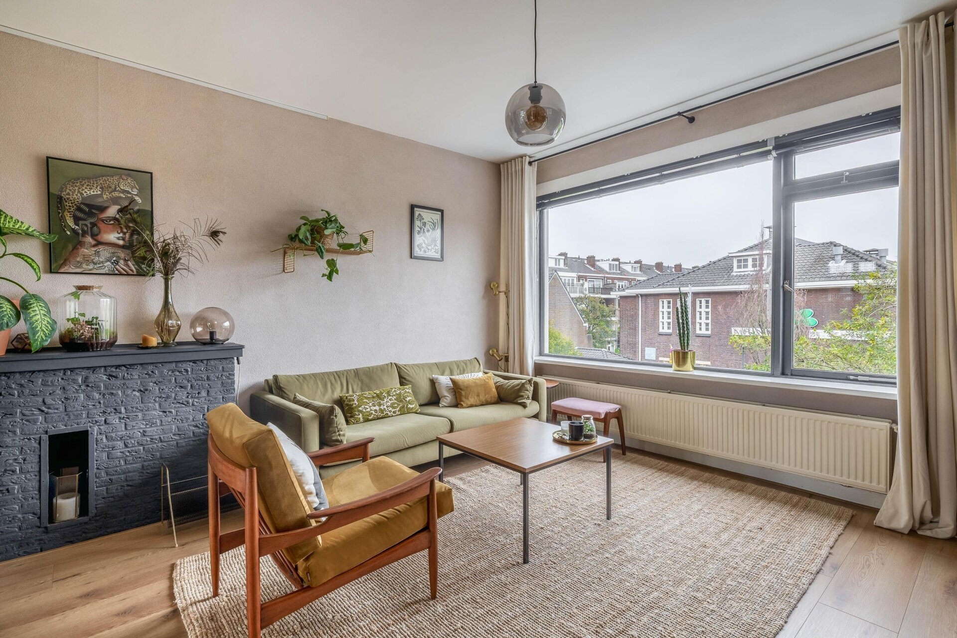 Zodra je de woonkamer binnenstapt, valt de warme sfeer direct op. De ruimte is opgedeeld in een voor- en achterkamer, gescheiden door klassieke en-suite deuren met glas-in-lood en maar liefst vier vaste kasten. Grote ramen en openslaande deuren aan de achterzijde zorgen voor veel daglicht. Hier stap je zo het eerste balkon op, gelegen op het westen, waar je in de middag en avond kunt genieten van de zon.