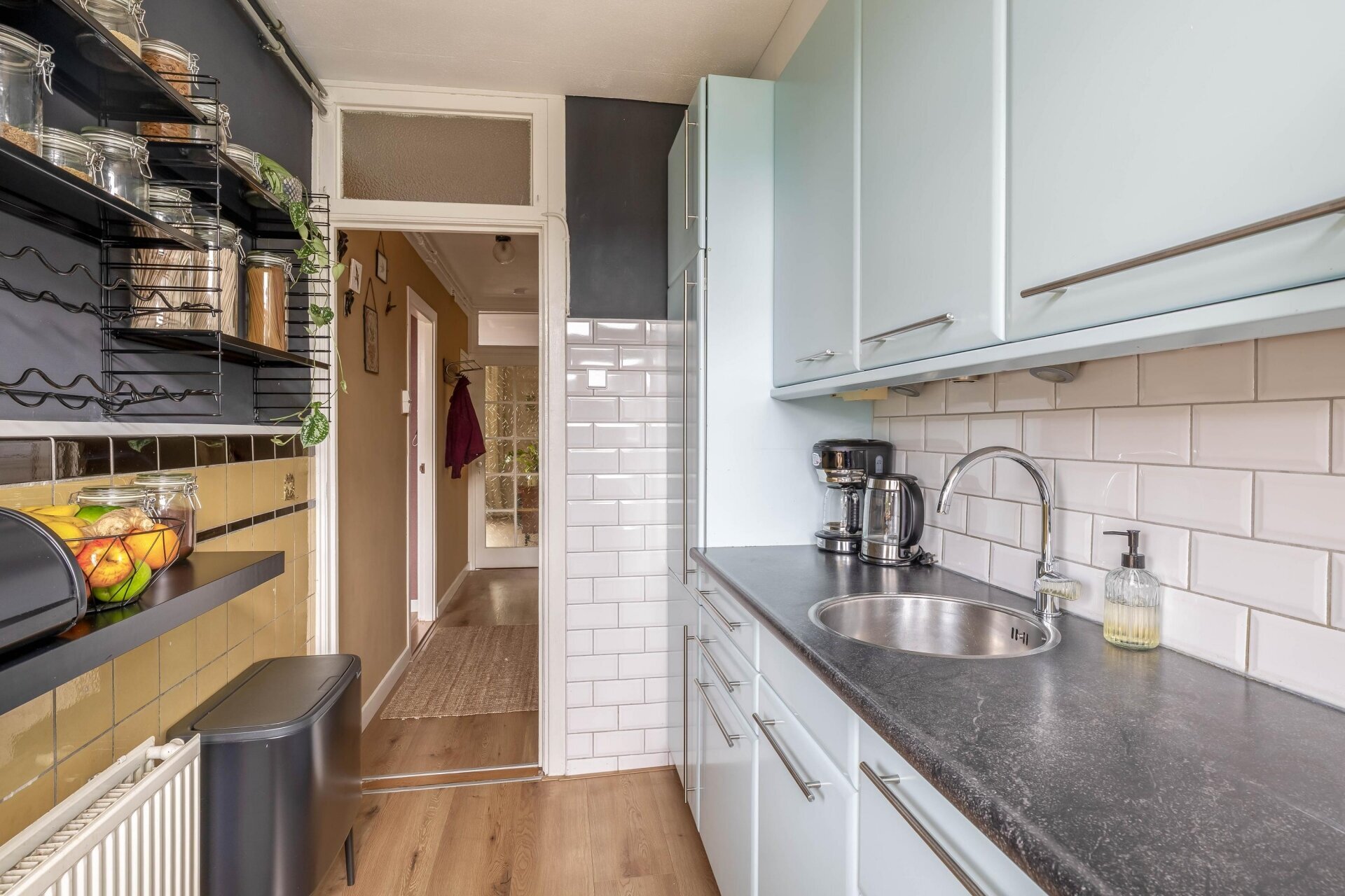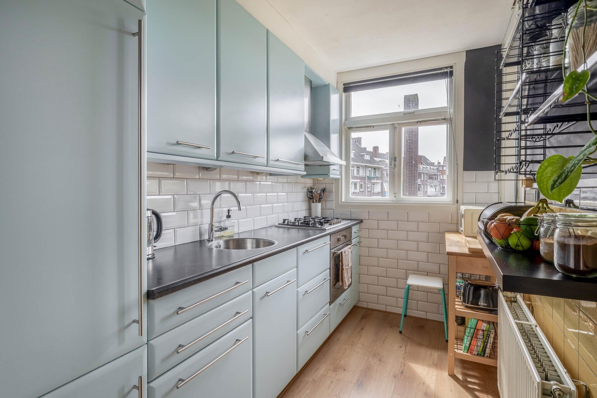 Aan de achterzijde vind je de keuken, uitgevoerd in een praktische wandopstelling met diverse inbouwapparatuur: een koel-/vriescombinatie, oven, 5-pits gaskookplaat met afzuigkap en volop kastruimte. Ook vanuit de keuken is er toegang tot het balkon. Zet de deuren open tijdens het koken en haal buiten naar binnen.