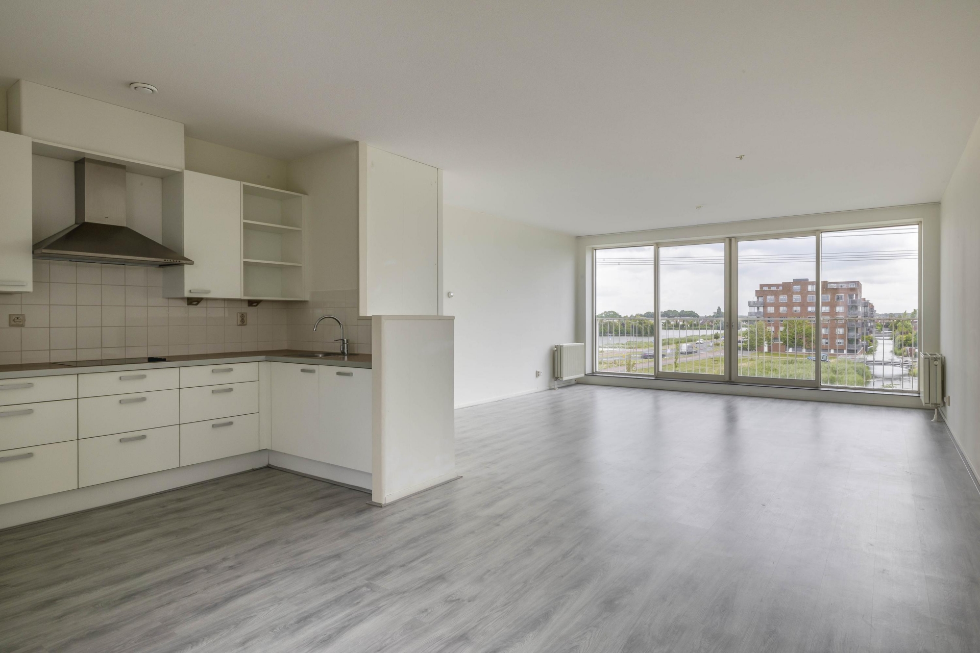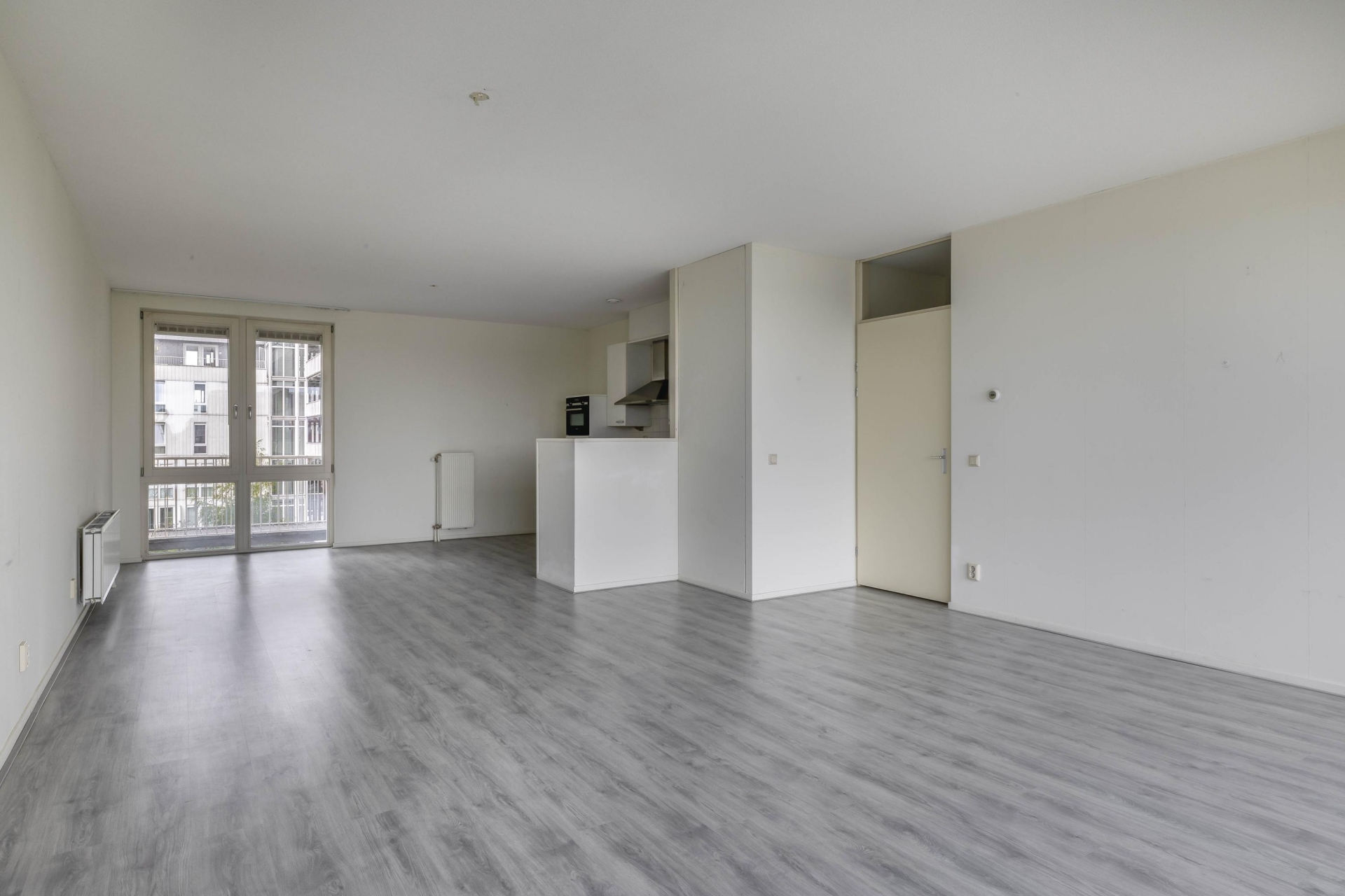 Entree, ruime hal met toegang tot 2 slaapkamers, de badkamer, een inpandige berging, het toilet, de meterkast en de woonkamer met open keuken. Er is een ruime woonkamer met complete open keuken aanwezig. Deze hebben samen een oppervlakte van bijna 50 m²! De keuken is voorzien van diverse inbouwapparatuur en biedt ruimte genoeg voor een royale eettafel. Vanuit de woonkamer is er middels een schuifpui een Frans balkon. Vanaf hier is er een waanzinnig uitzicht over het Rietveldpark!