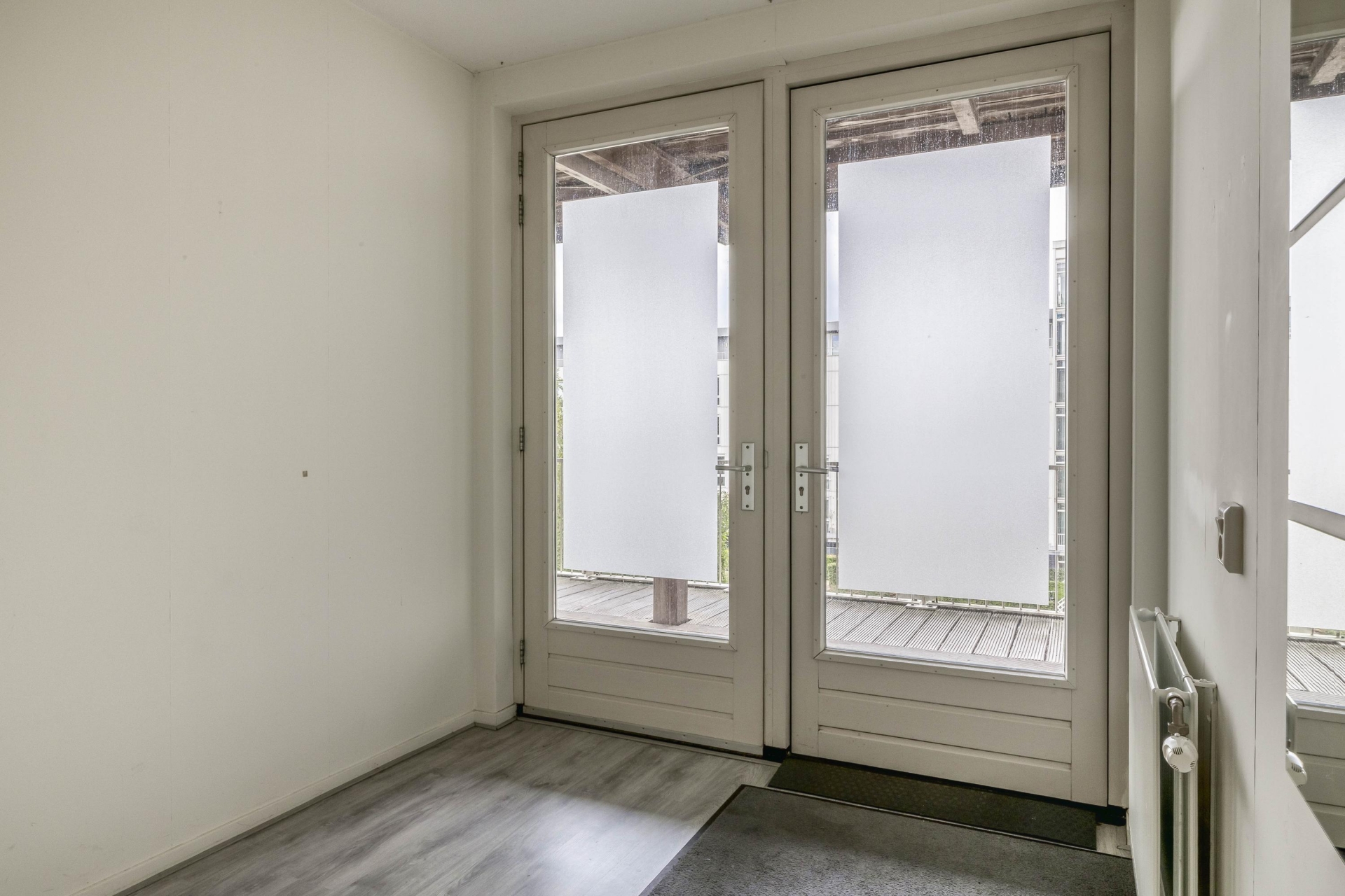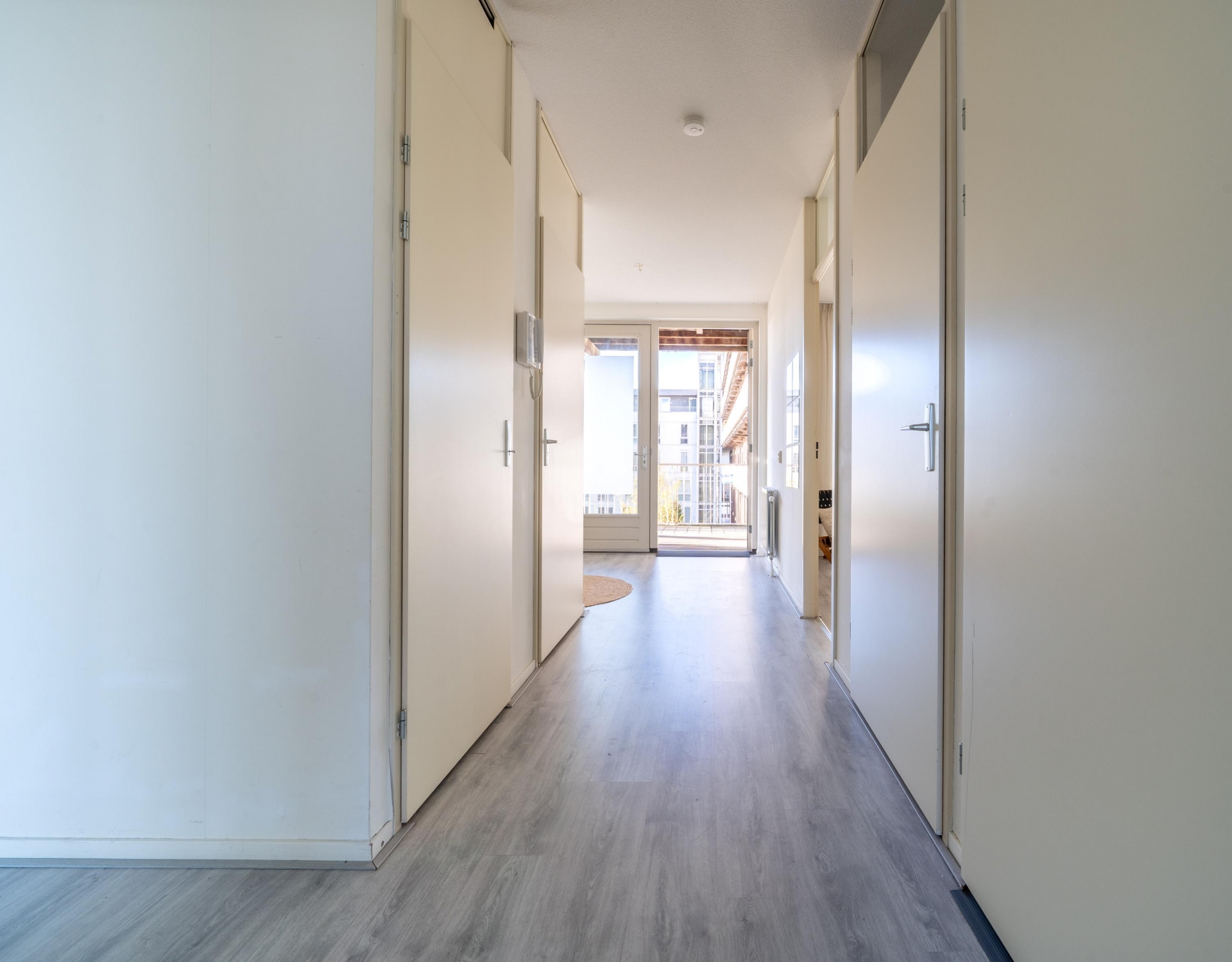 Entree, ruime hal met toegang tot 2 slaapkamers, de badkamer, een inpandige berging, het toilet, de meterkast en de woonkamer met open keuken. Er is een ruime woonkamer met complete open keuken aanwezig. Deze hebben samen een oppervlakte van bijna 50 m²! De keuken is voorzien van diverse inbouwapparatuur en biedt ruimte genoeg voor een royale eettafel. Vanuit de woonkamer is er middels een schuifpui een Frans balkon. Vanaf hier is er een waanzinnig uitzicht over het Rietveldpark!