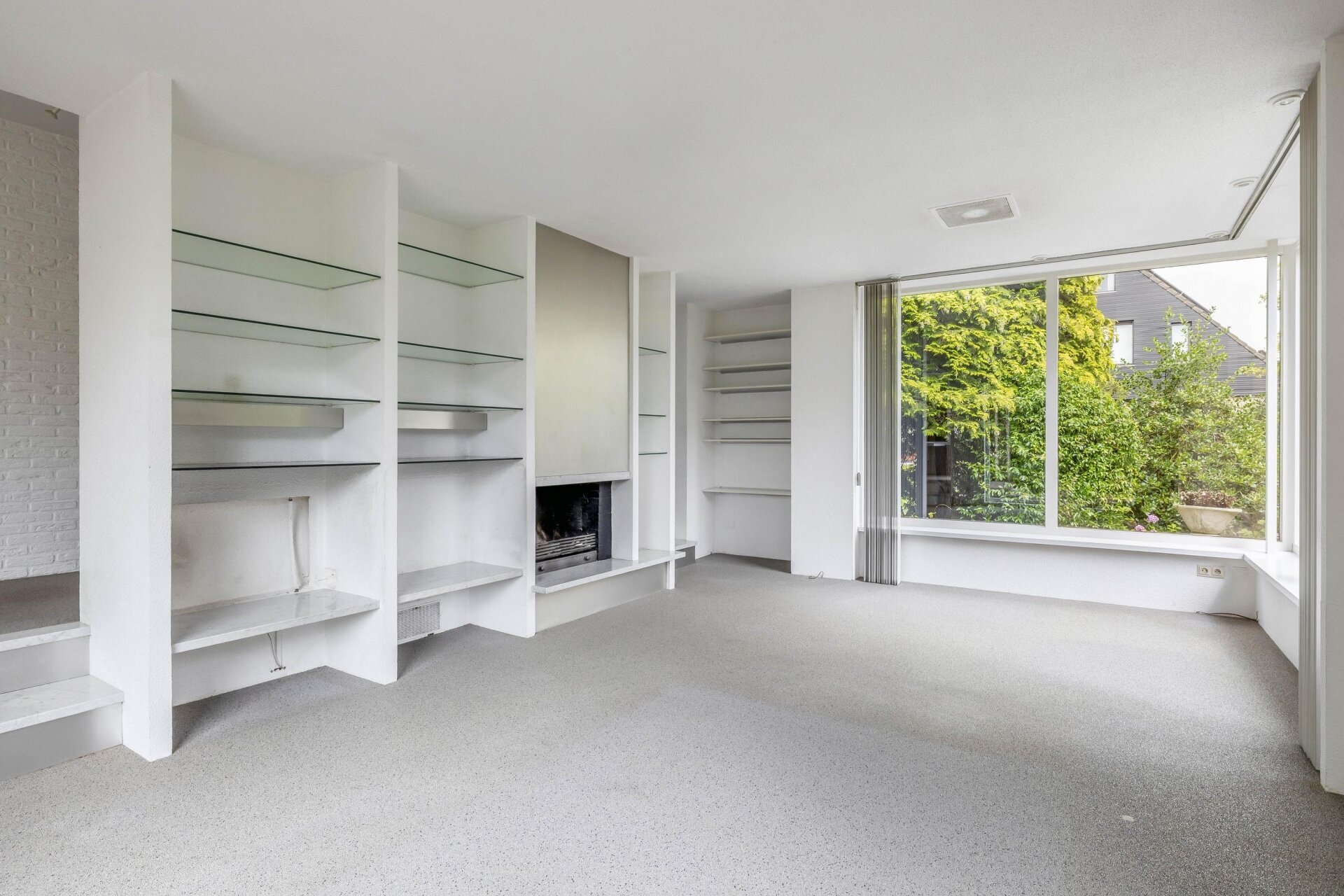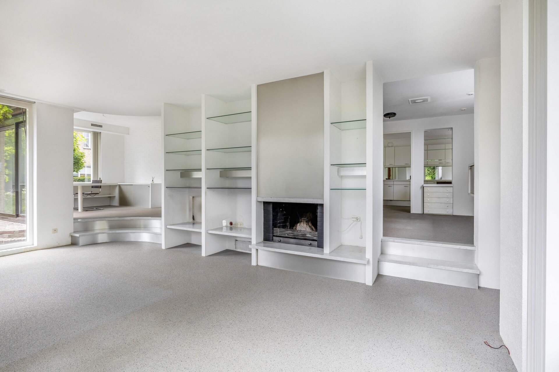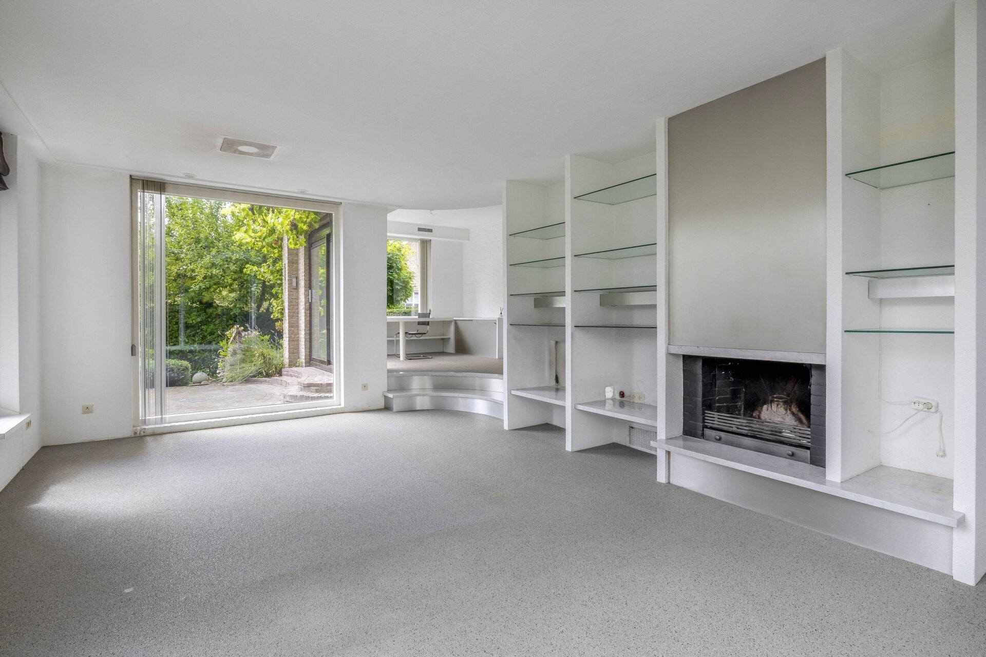 De begane grond verrast direct met een grote, lichte living die op een speelse manier overgaat in een eetgedeelte en aansluit op de keuken. Dankzij het split-level element in de woonkamer ontstaat er een gezellige dynamiek in de ruimte. De living heeft grote raampartijen, zicht op de tuin en een open haard als sfeervol middelpunt.