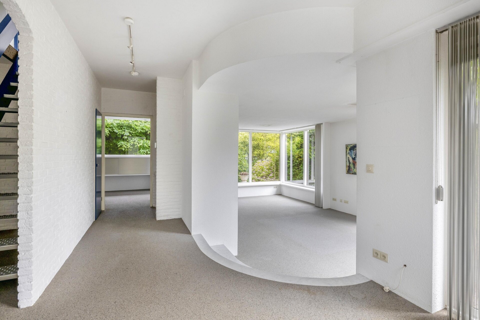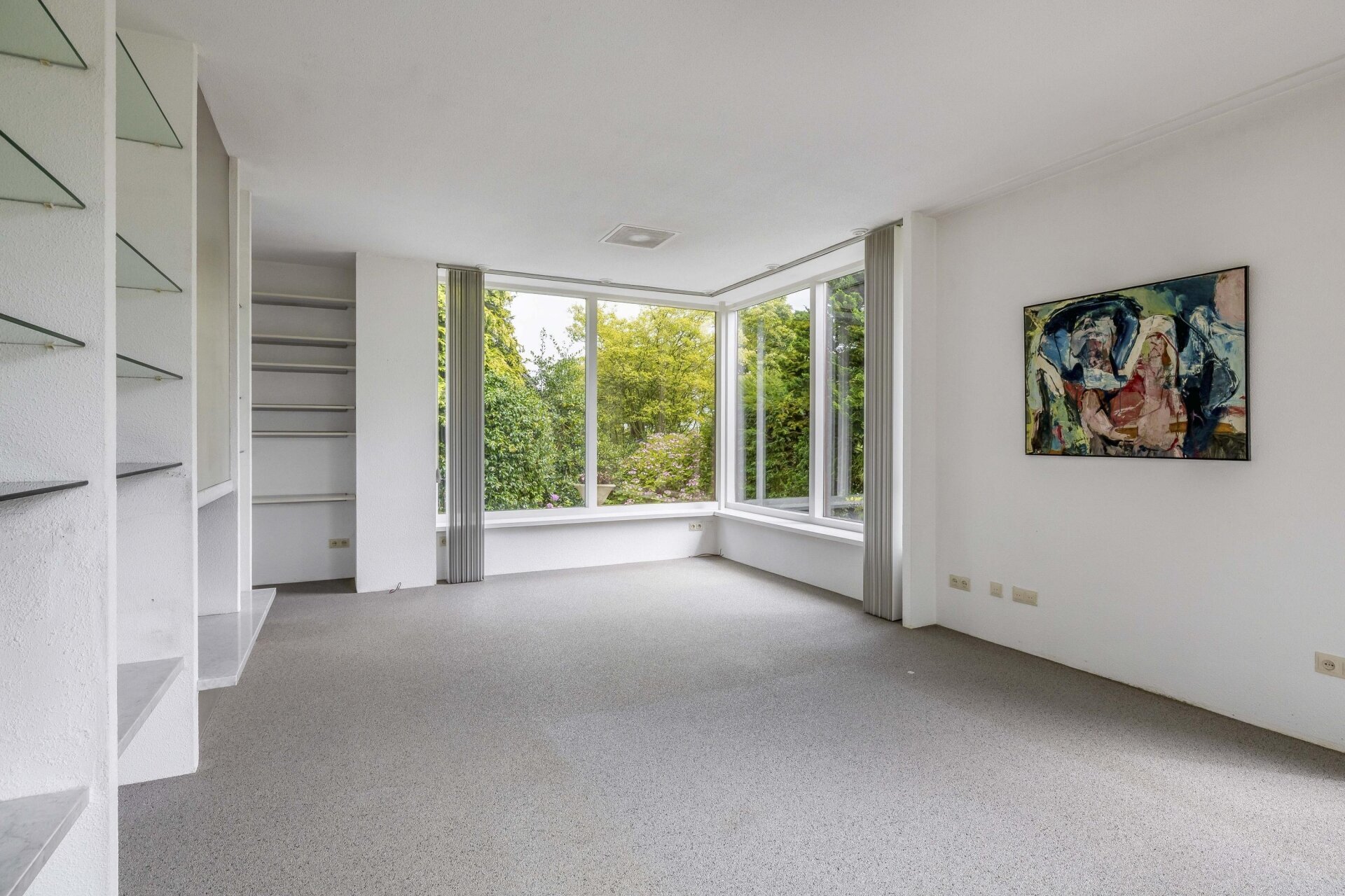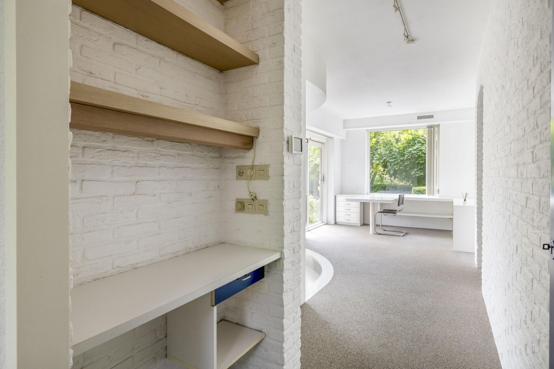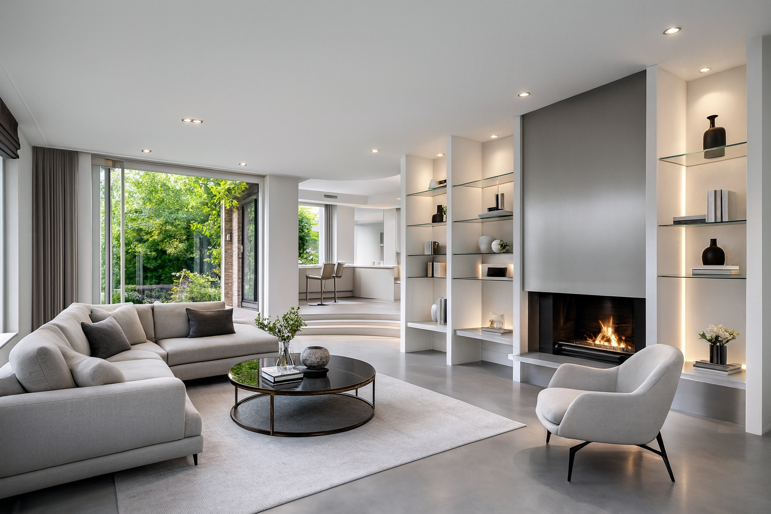 De begane grond verrast direct met een grote, lichte living die op een speelse manier overgaat in een eetgedeelte en aansluit op de keuken. Dankzij het split-level element in de woonkamer ontstaat er een gezellige dynamiek in de ruimte. De living heeft grote raampartijen, zicht op de tuin en een open haard als sfeervol middelpunt.