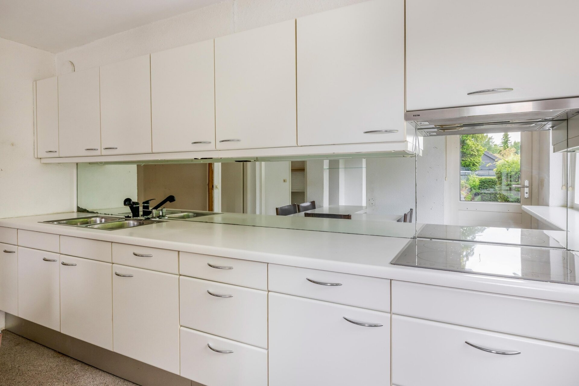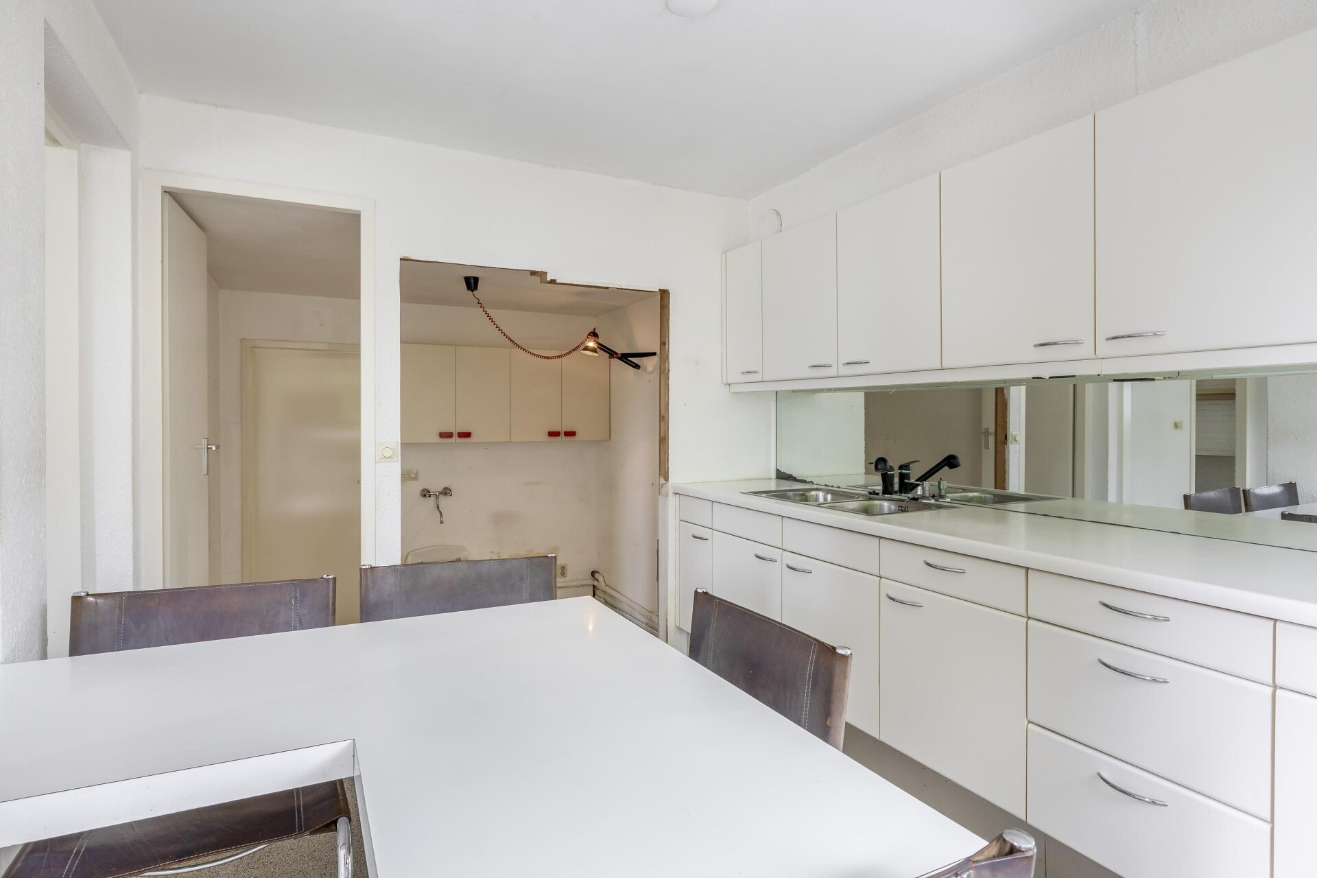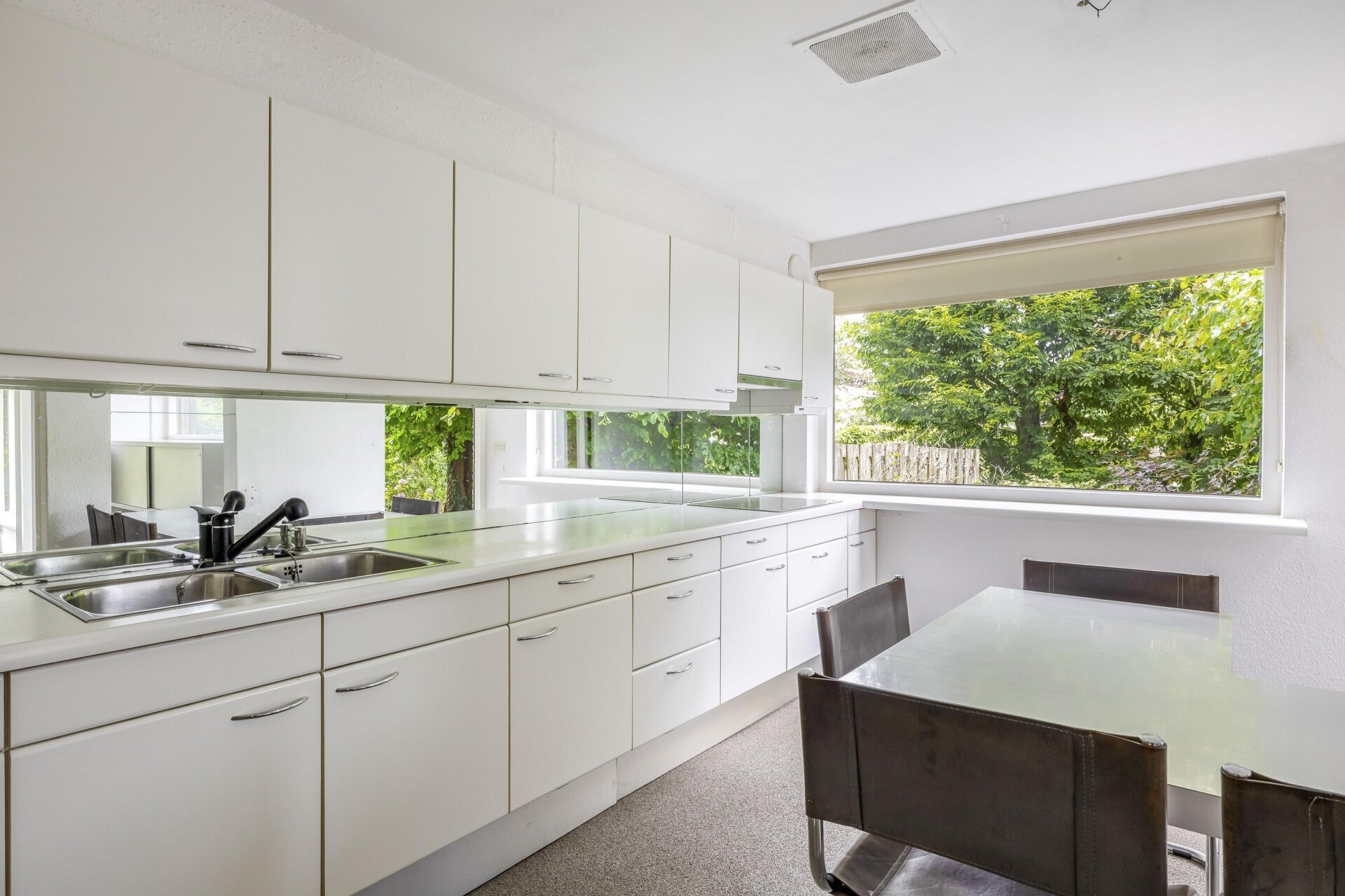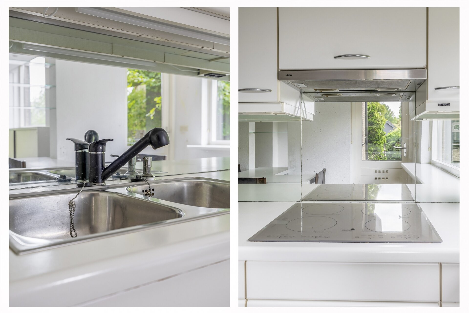 De keuken is royaal en biedt voldoende werkruimte, opbergruimte en potentie voor een luxe woonkeuken. Aansluitend vind je de praktische bijkeuken.