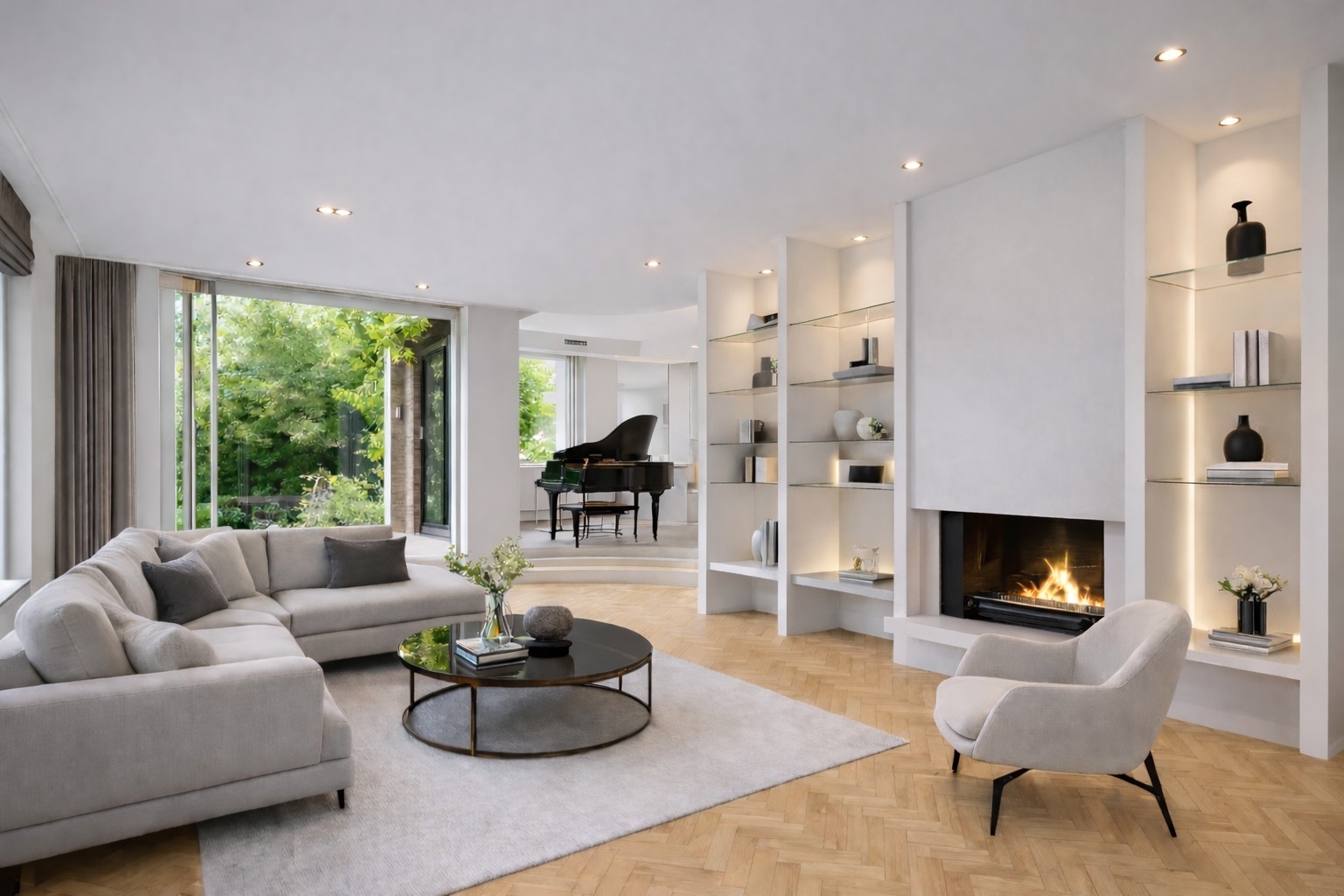 De begane grond verrast direct met een lichte, ruime living. Het split-level element zorgt voor een speelse en dynamische indeling, waarbij zit- en eetgedeelte op natuurlijke wijze in elkaar overlopen. Grote raampartijen bieden prachtig zicht op de groene tuin en zorgen voor een aangename lichtinval. De open haard vormt het warme middelpunt van de ruimte.