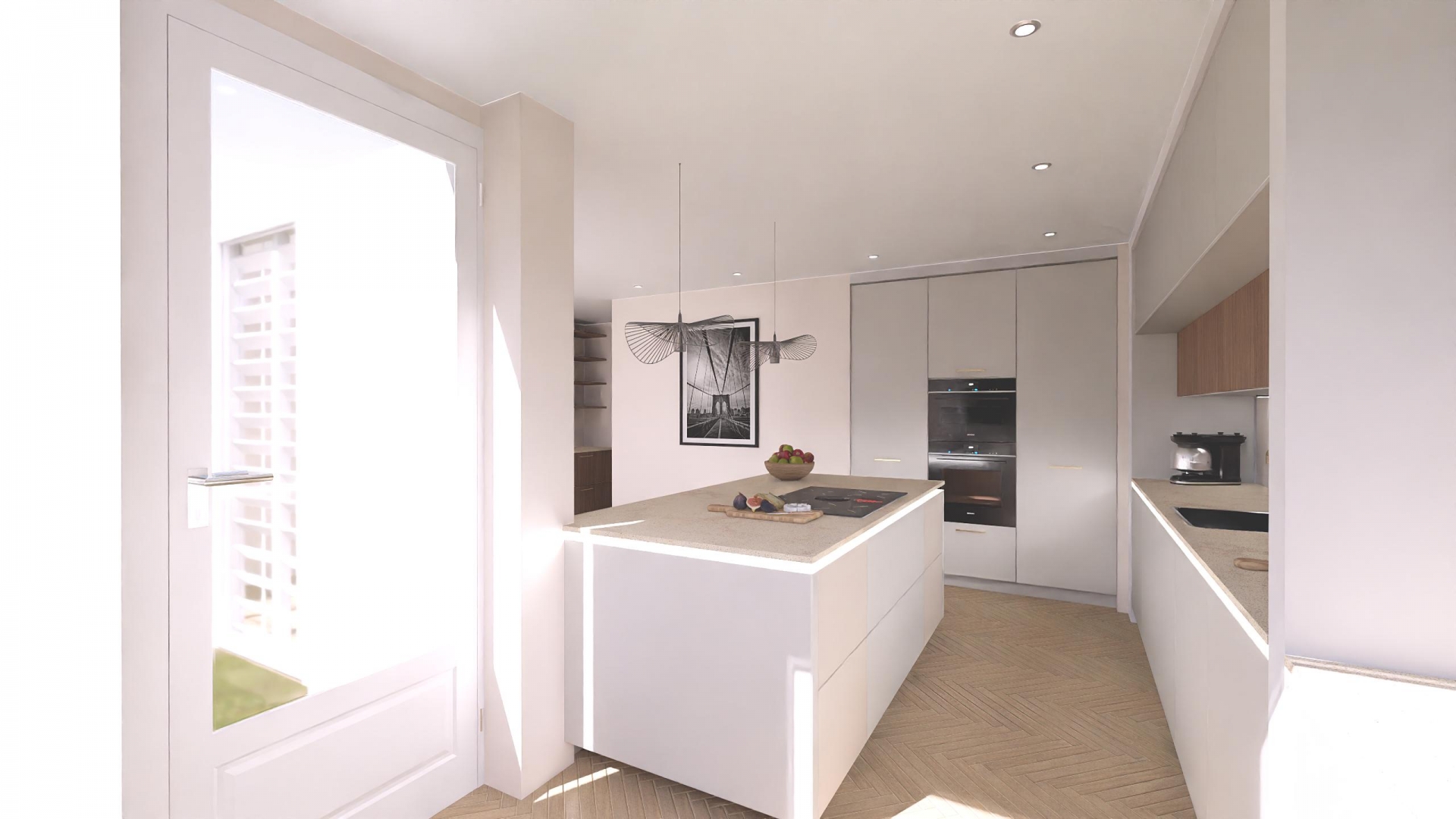 De royale keuken biedt volop werk- en bergruimte en heeft alle potentie om te transformeren tot een luxe woonkeuken. Aansluitend bevindt zich de praktische bijkeuken.