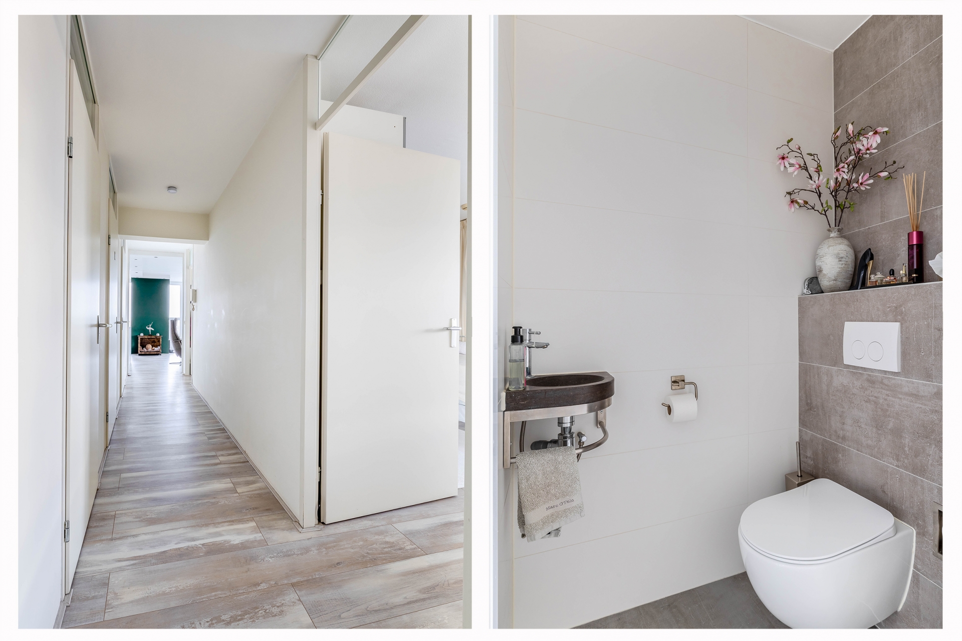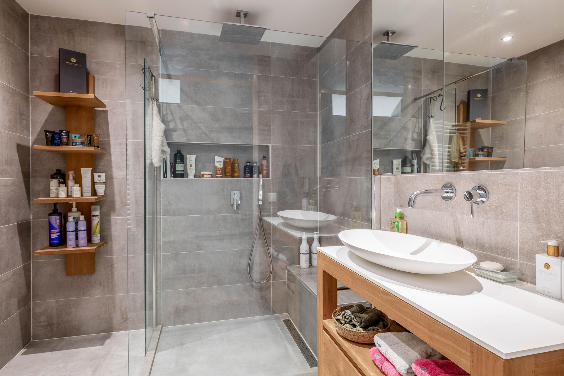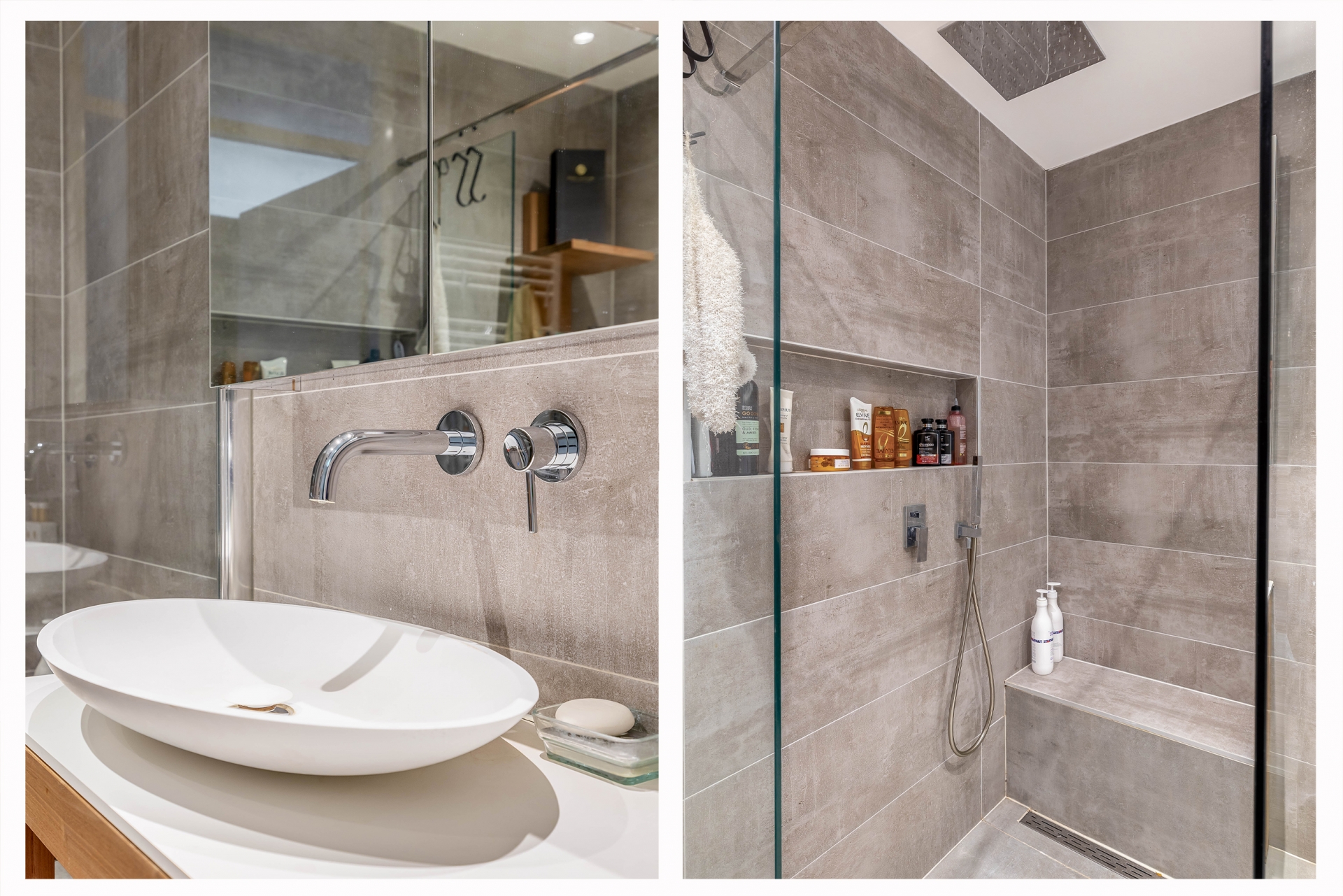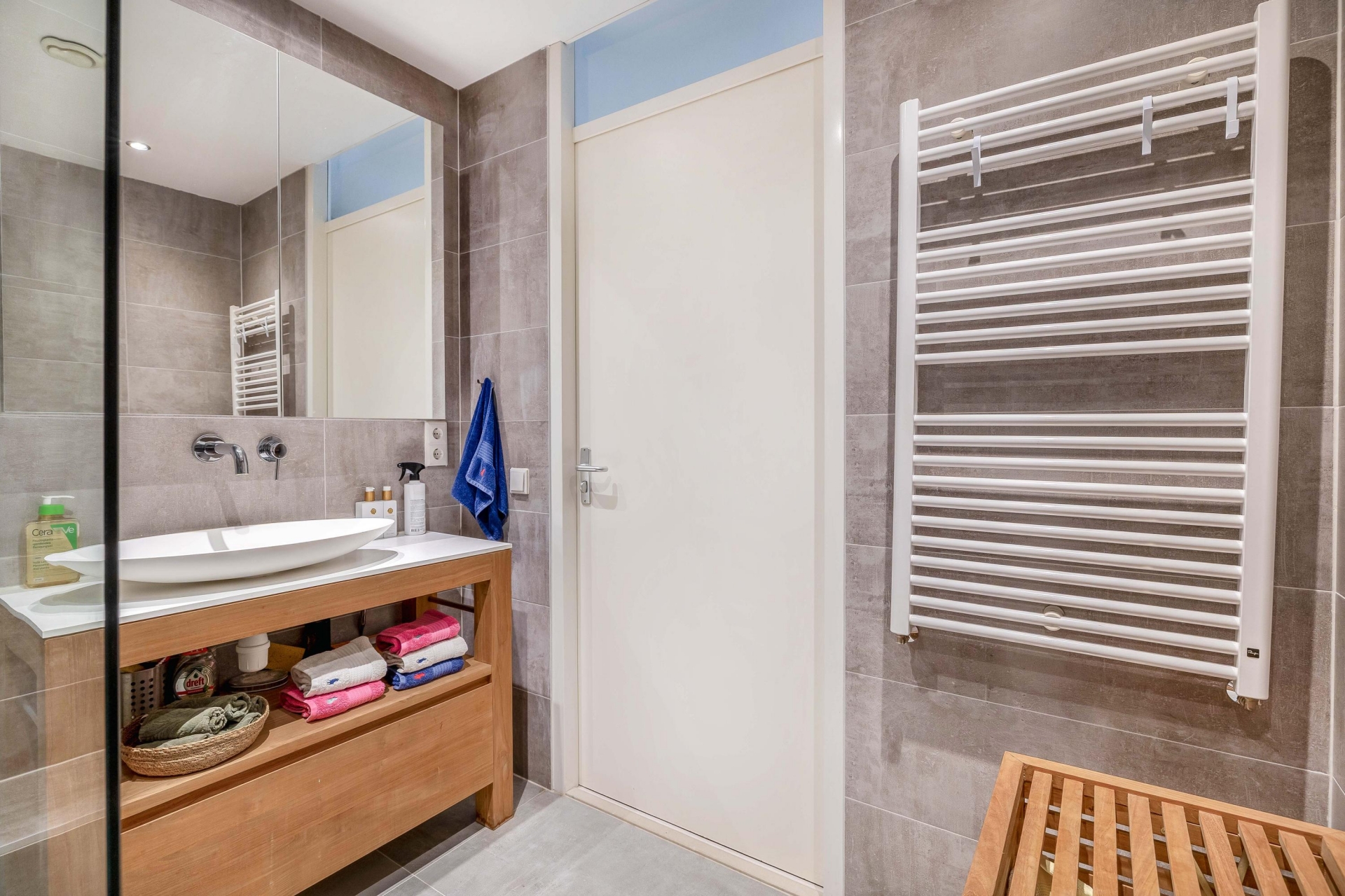 De badkamer is modern, strak en verzorgd uitgevoerd met een ruime inloopdouche voorzien van regendouche, een eigentijds wastafelmeubel en een sfeervolle tegelafwerking. Ook de separate toiletruimte is in dezelfde stijl afgewerkt, wat zorgt voor een rustig en samenhangend geheel.