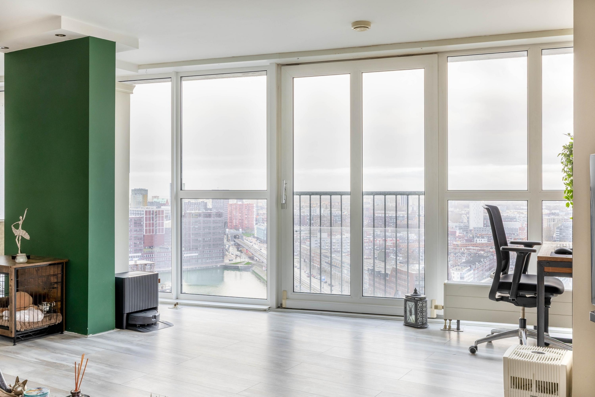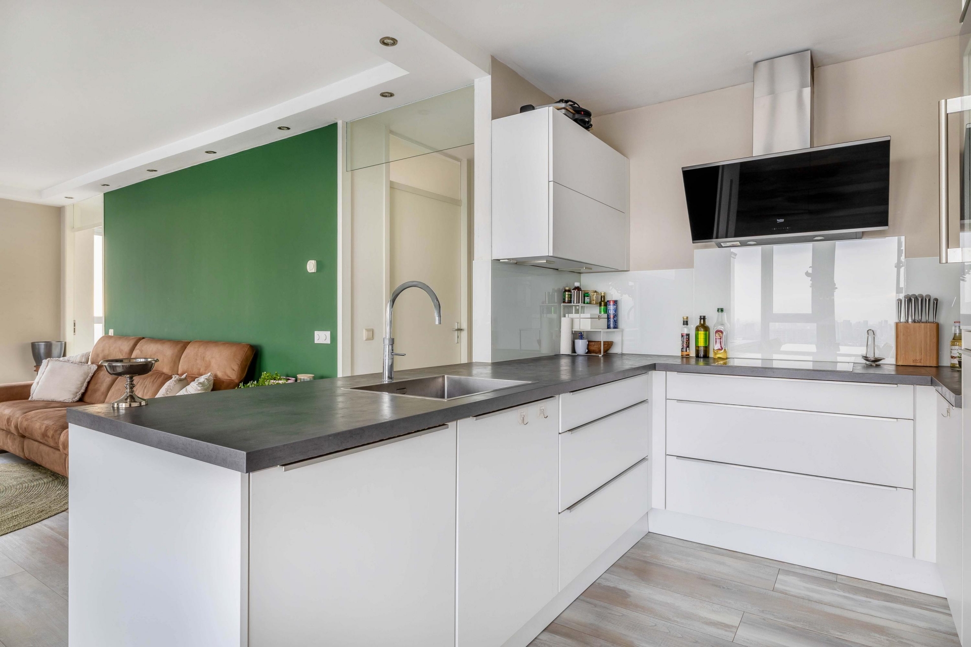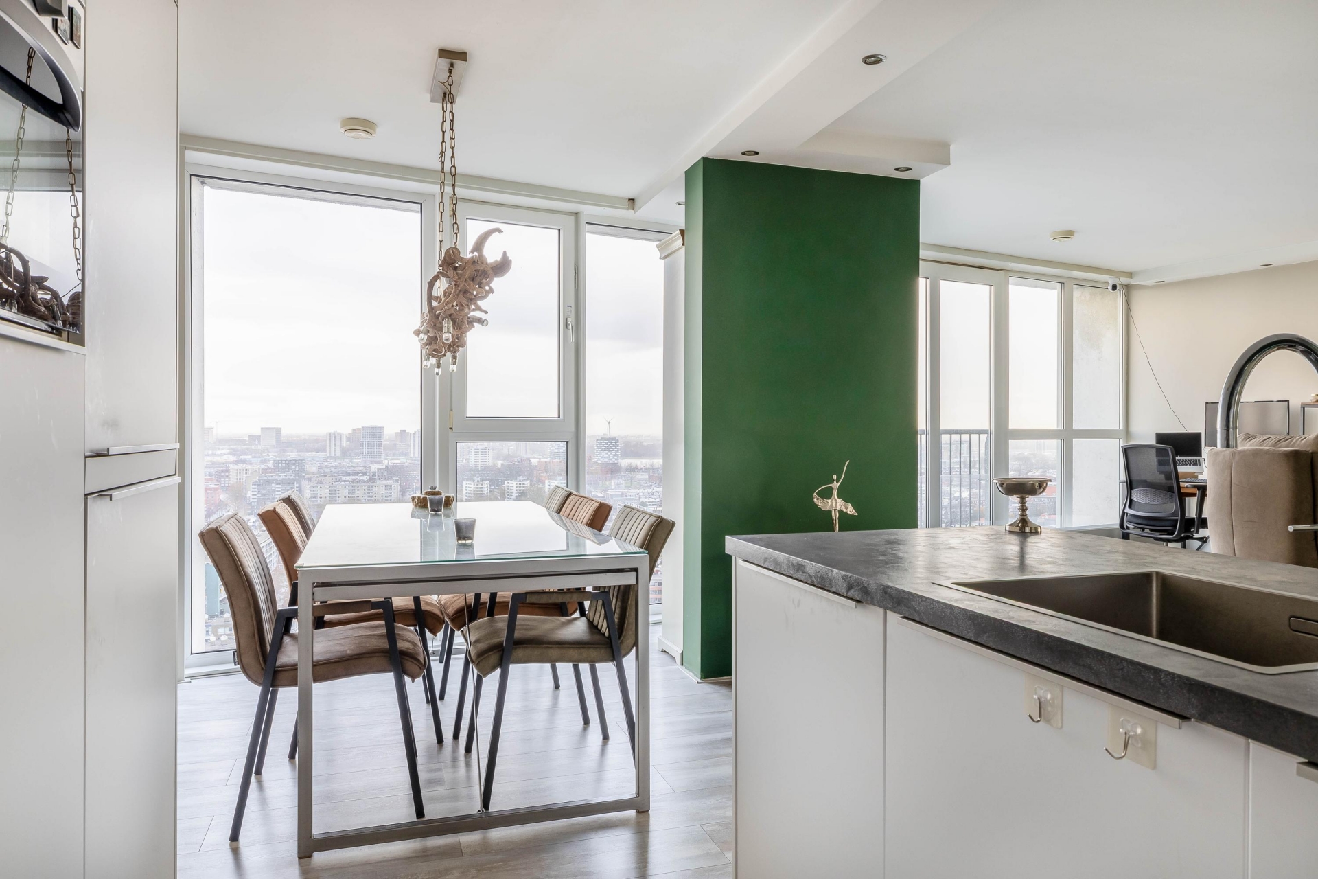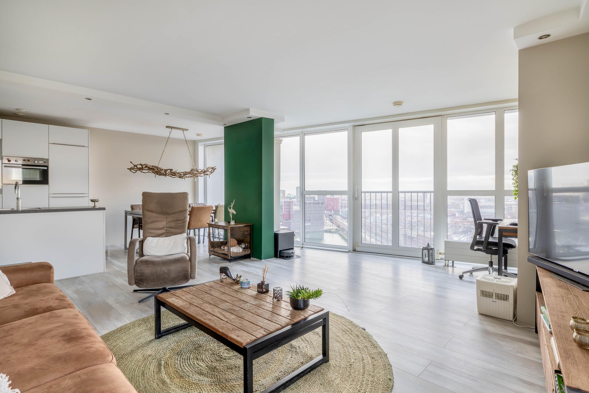 Bij binnenkomst in de woonkamer wordt je blik direct naar buiten getrokken. Dankzij de hoge ligging en de grote raampartijen geniet je hier van een panoramisch uitzicht over de stad, van zonsopkomst tot een indrukwekkend verlichte skyline in de avond. De woonkamer is ruim, licht en strak afgewerkt en biedt moeiteloos plaats aan een royale zithoek én een comfortabele werkplek. De open verbinding met de keuken versterkt het ruimtelijke gevoel en maakt de indeling zowel praktisch als uitnodigend.