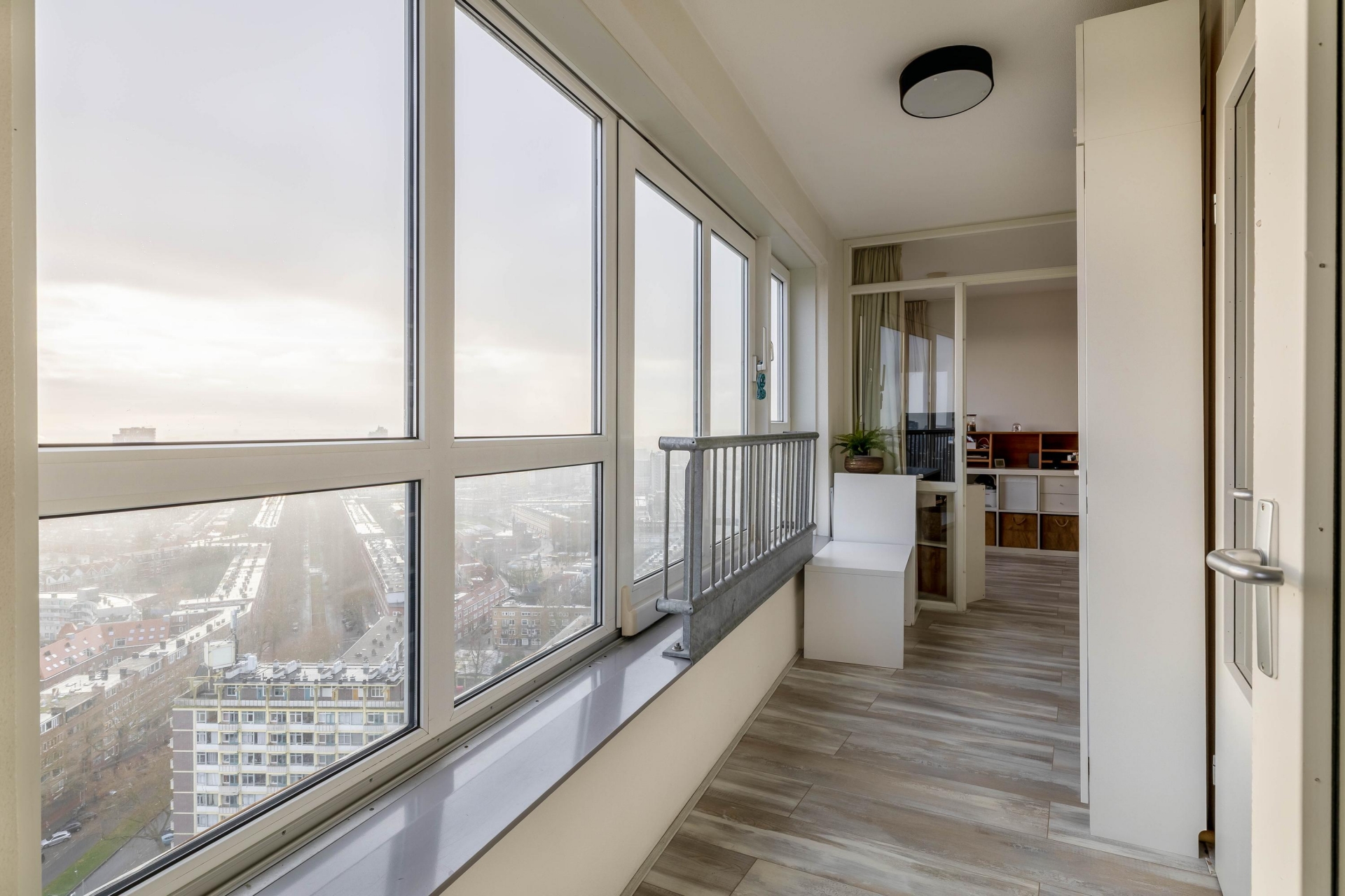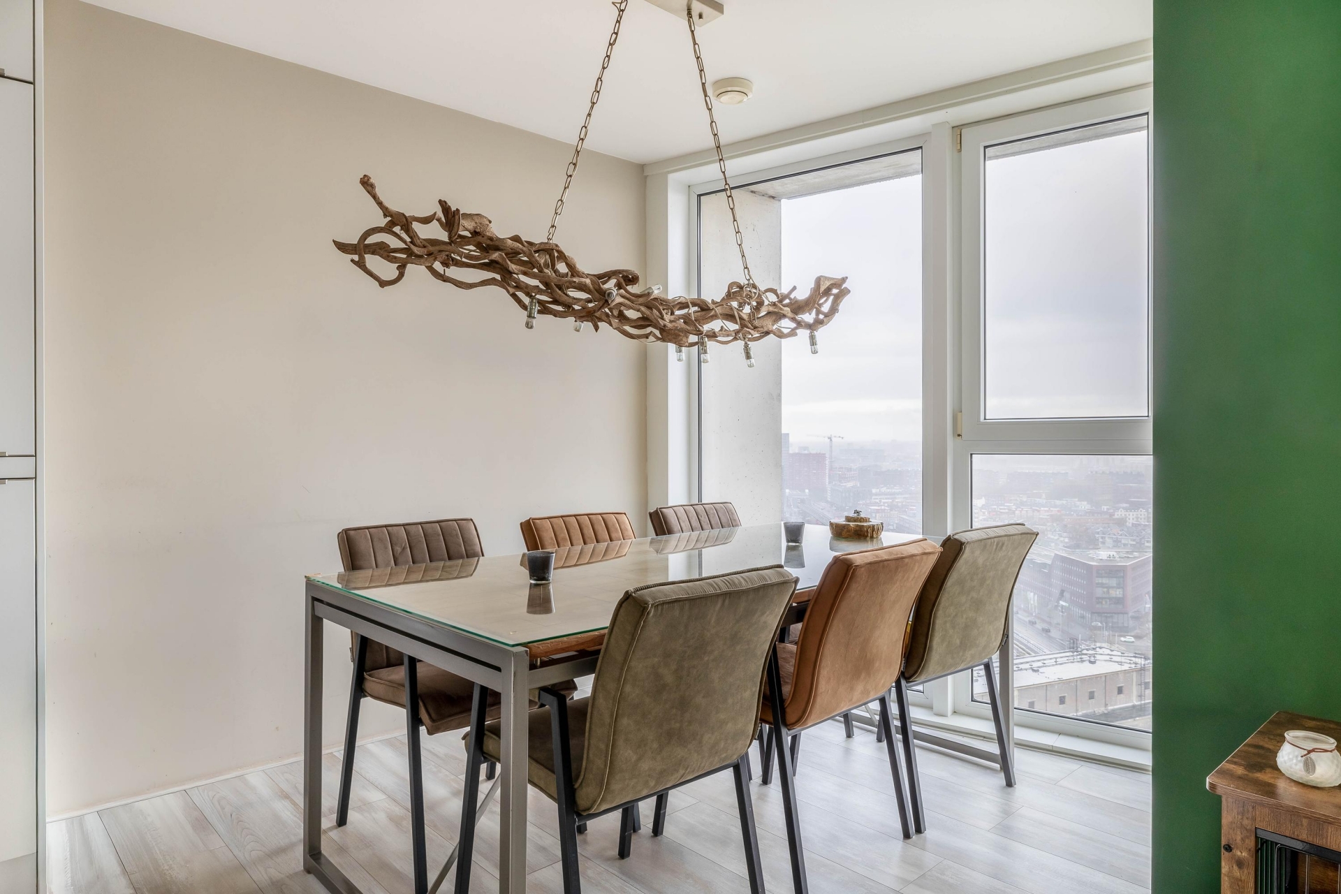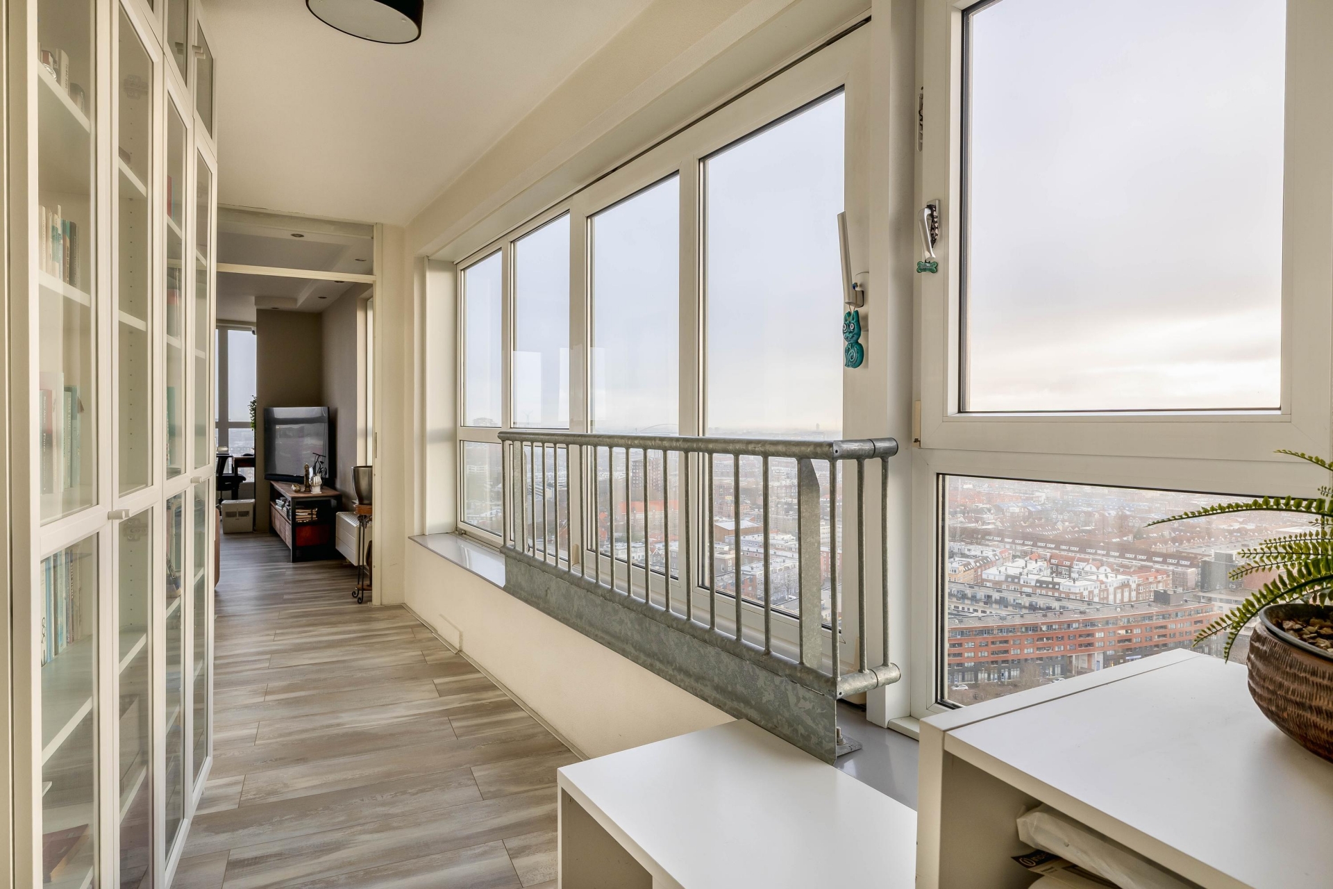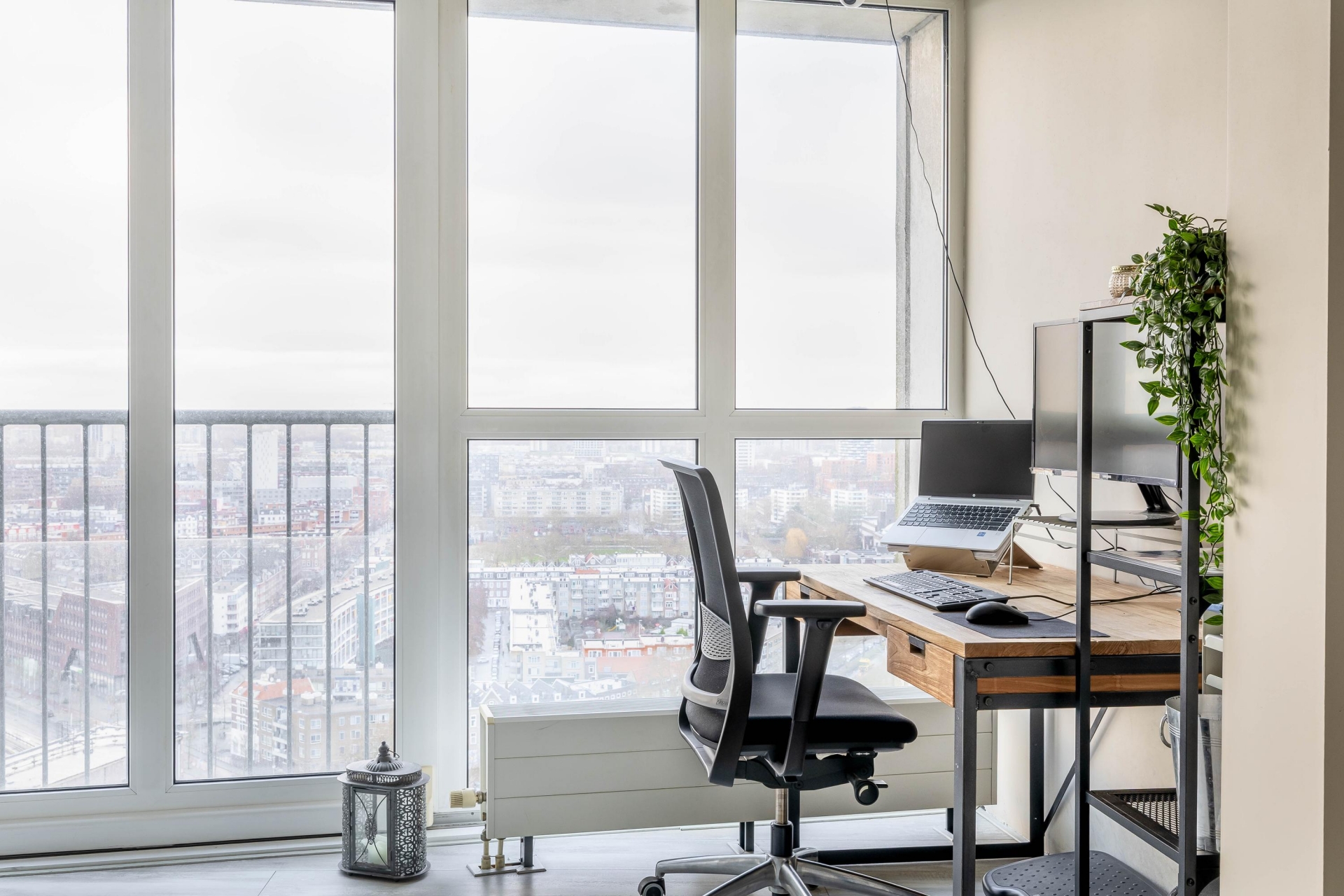 Bij binnenkomst in de woonkamer wordt je blik direct naar buiten getrokken. Dankzij de hoge ligging en de grote raampartijen geniet je hier van een panoramisch uitzicht over de stad, van zonsopkomst tot een indrukwekkend verlichte skyline in de avond. De woonkamer is ruim, licht en strak afgewerkt en biedt moeiteloos plaats aan een royale zithoek én een comfortabele werkplek. De open verbinding met de keuken versterkt het ruimtelijke gevoel en maakt de indeling zowel praktisch als uitnodigend.