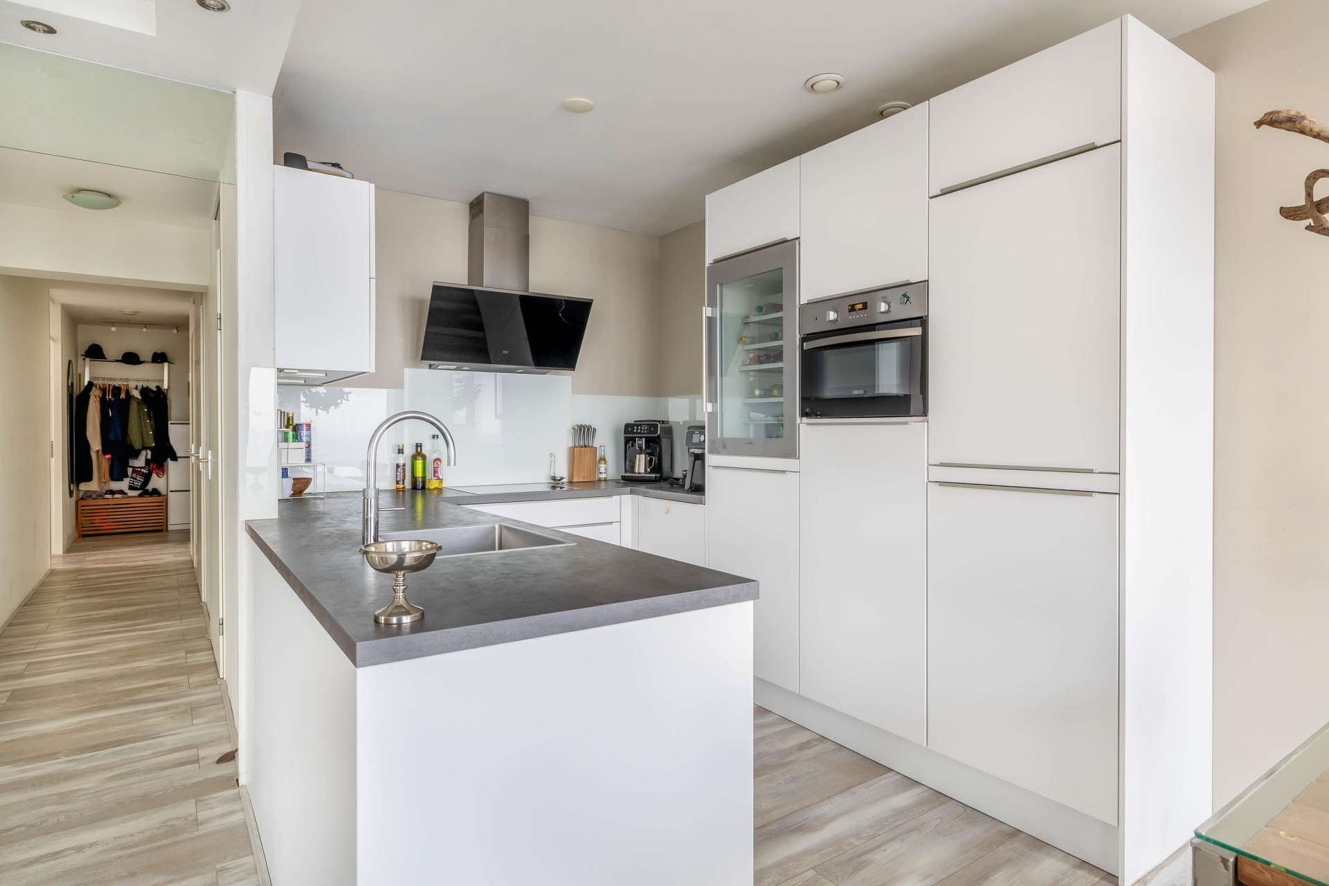 De keuken is in 2019 volledig vernieuwd en uitgevoerd in een strakke, tijdloze stijl. De witte kastenwand, het ruime werkblad en de efficiënte indeling maken deze keuken zowel functioneel als elegant. Uiteraard is de keuken voorzien van hoogwaardige inbouwapparatuur, waaronder een inductiekookplaat, oven, combimagnetron, ruime koel-/vriescombinatie én een wijnkoeler. De Quooker 5-in-1 maakt het geheel compleet en biedt direct kokend, warm, koud, gekoeld en bruisend water. Een keuken die comfort en luxe moeiteloos combineert.