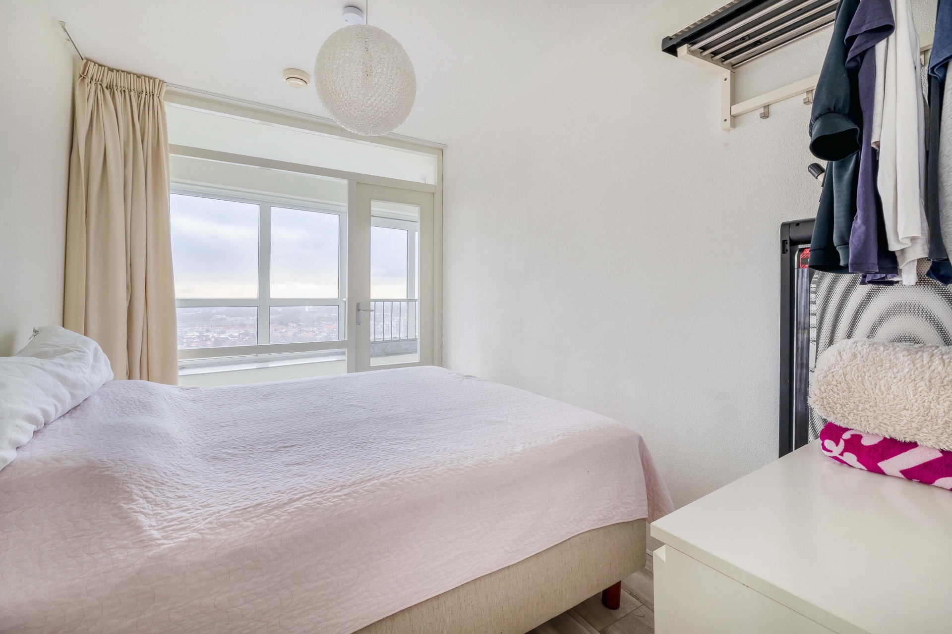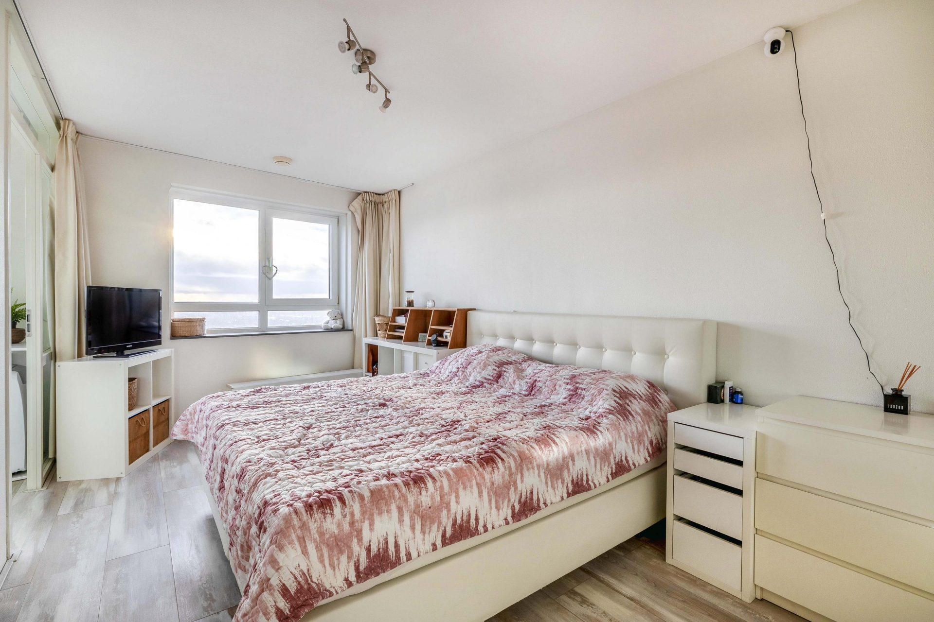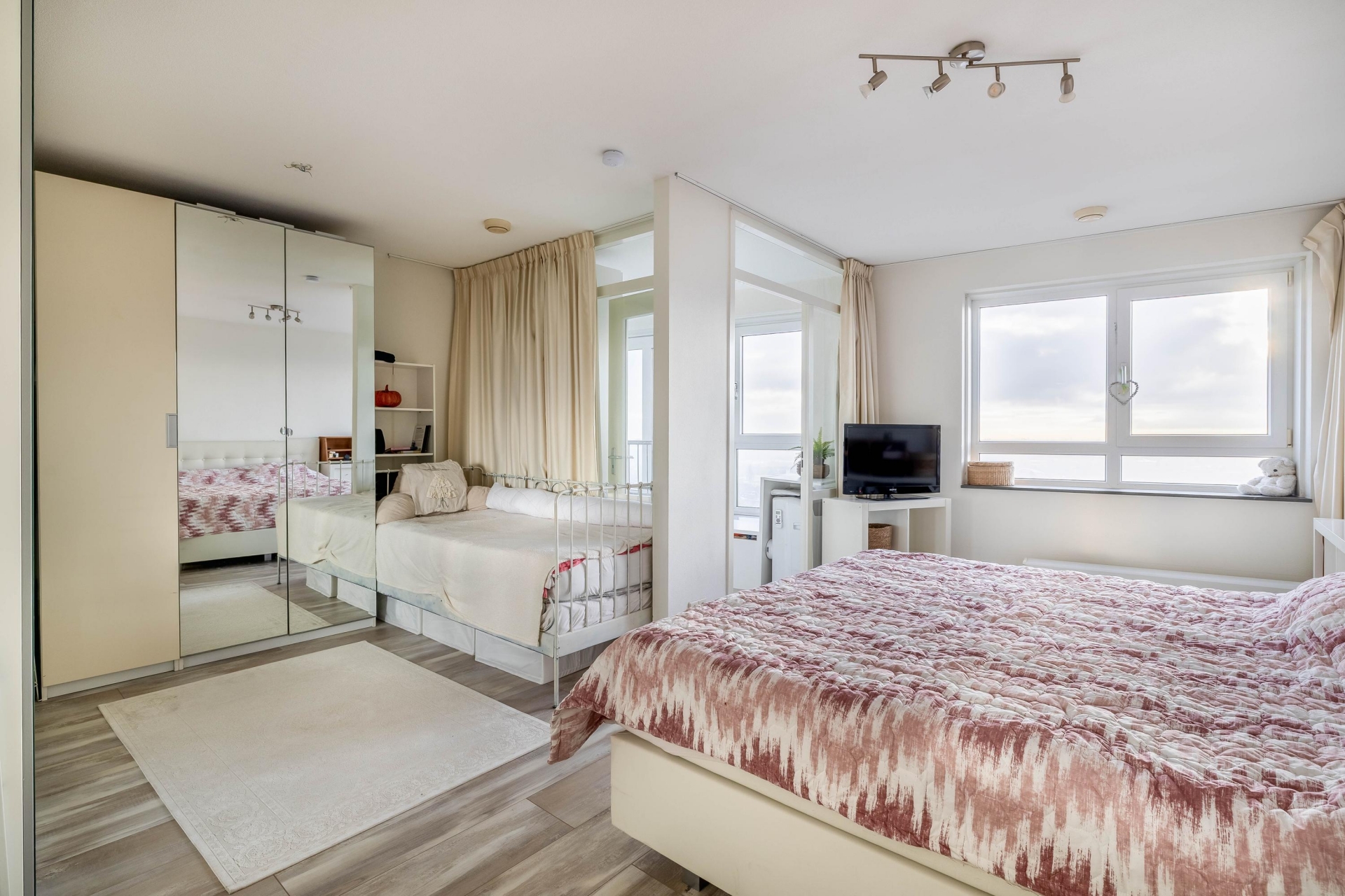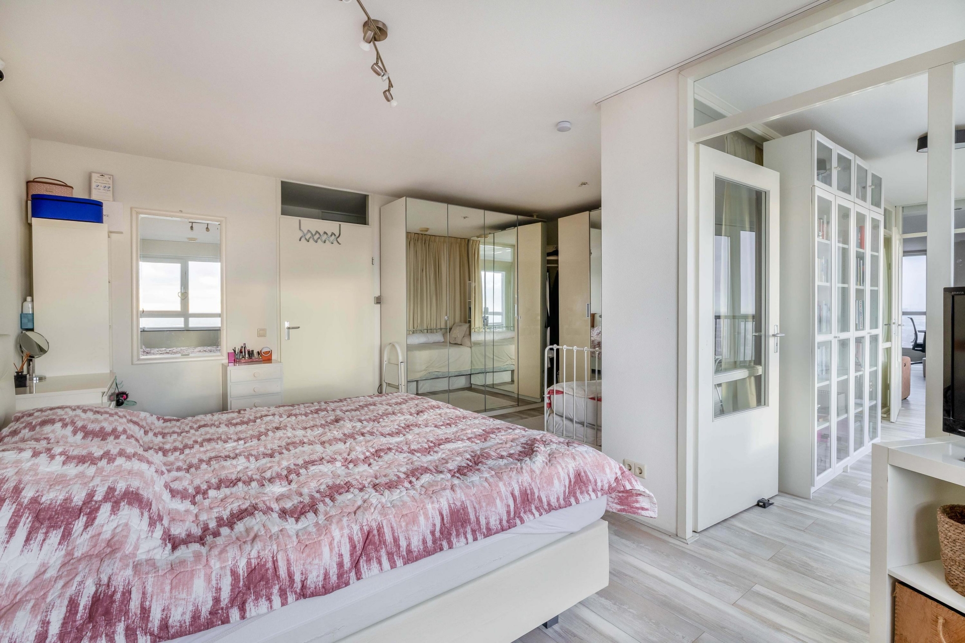 De hoofdslaapkamer is royaal opgezet en biedt volop ruimte voor een groot bed, kastenwand en eventueel een werk- of zithoek. De tweede slaapkamer is veelzijdig inzetbaar als logeerkamer, kinderkamer of thuiskantoor. Oorspronkelijk beschikte het appartement over drie slaapkamers; deze indeling is eenvoudig weer terug te brengen voor wie behoefte heeft aan extra kamers.