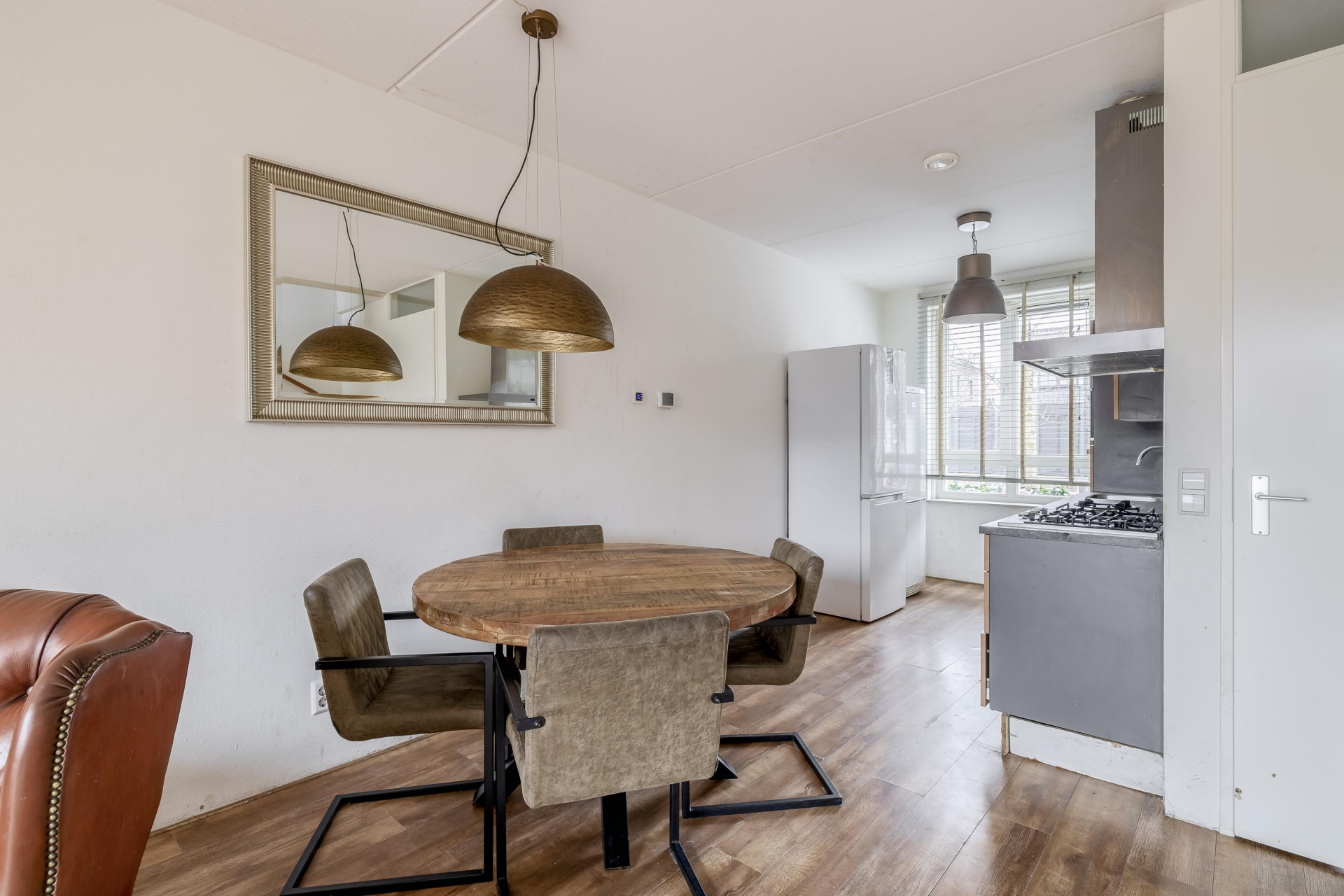 Entree naar de woning via voortuin; hal met meterkast; toiletruimte met toilet en fonteintje; lichte woonkamer voorzien van een halfopen keuken in wandopstelling aan de voorzijde van de woning. De keuken is uitgevoerd met diverse inbouwapparatuur waaronder een 5 pits gaskookplaat, koelkast, vaatwasser en afzuigkap; aan de achterzijde de ruime achtertuin met berging met elektra en een achterom naar de parkeerplaats.