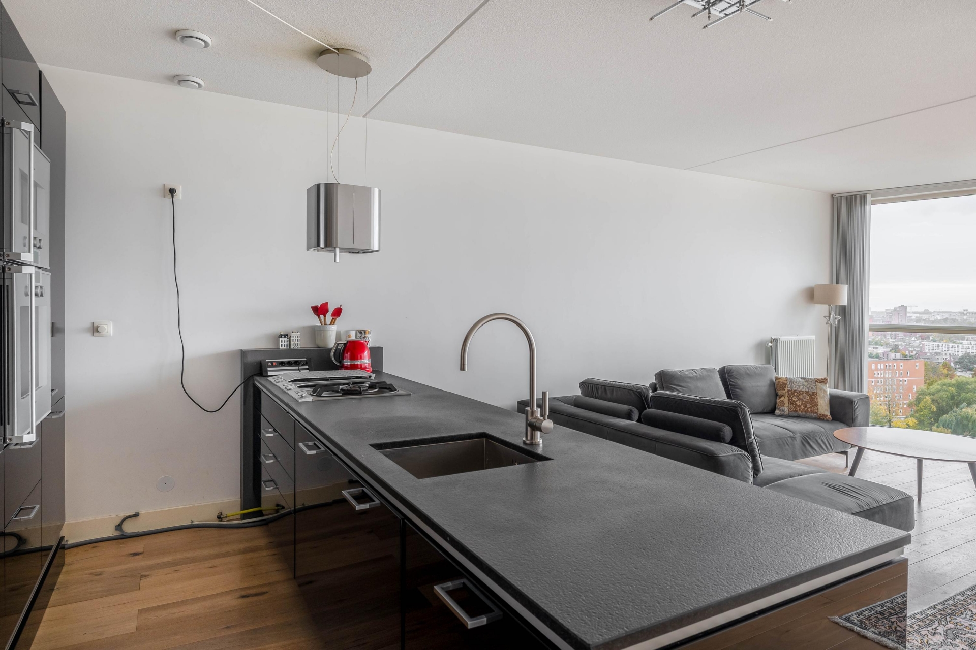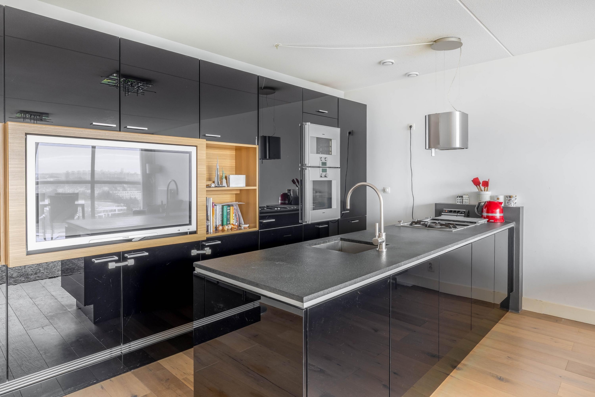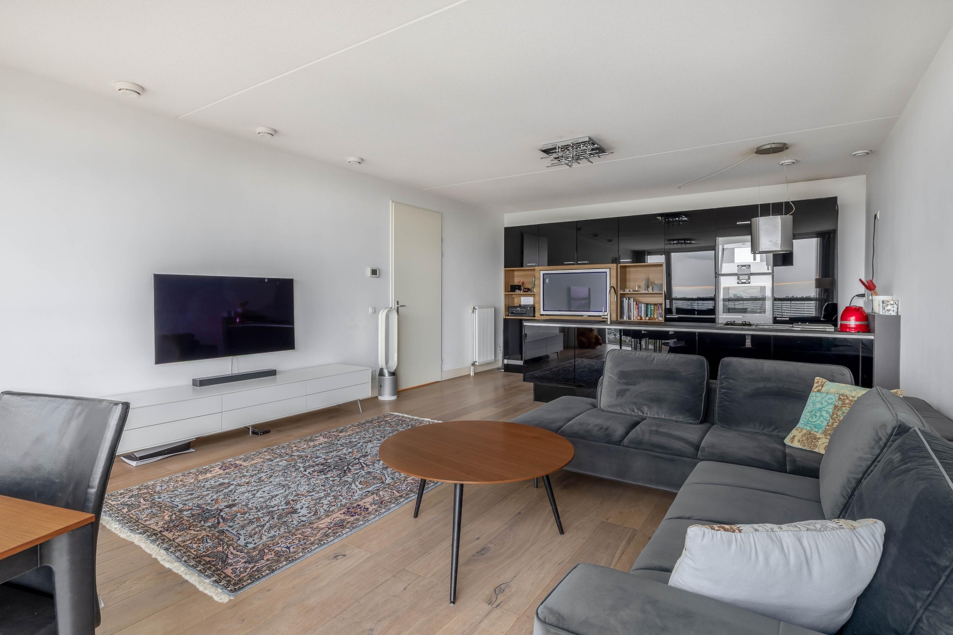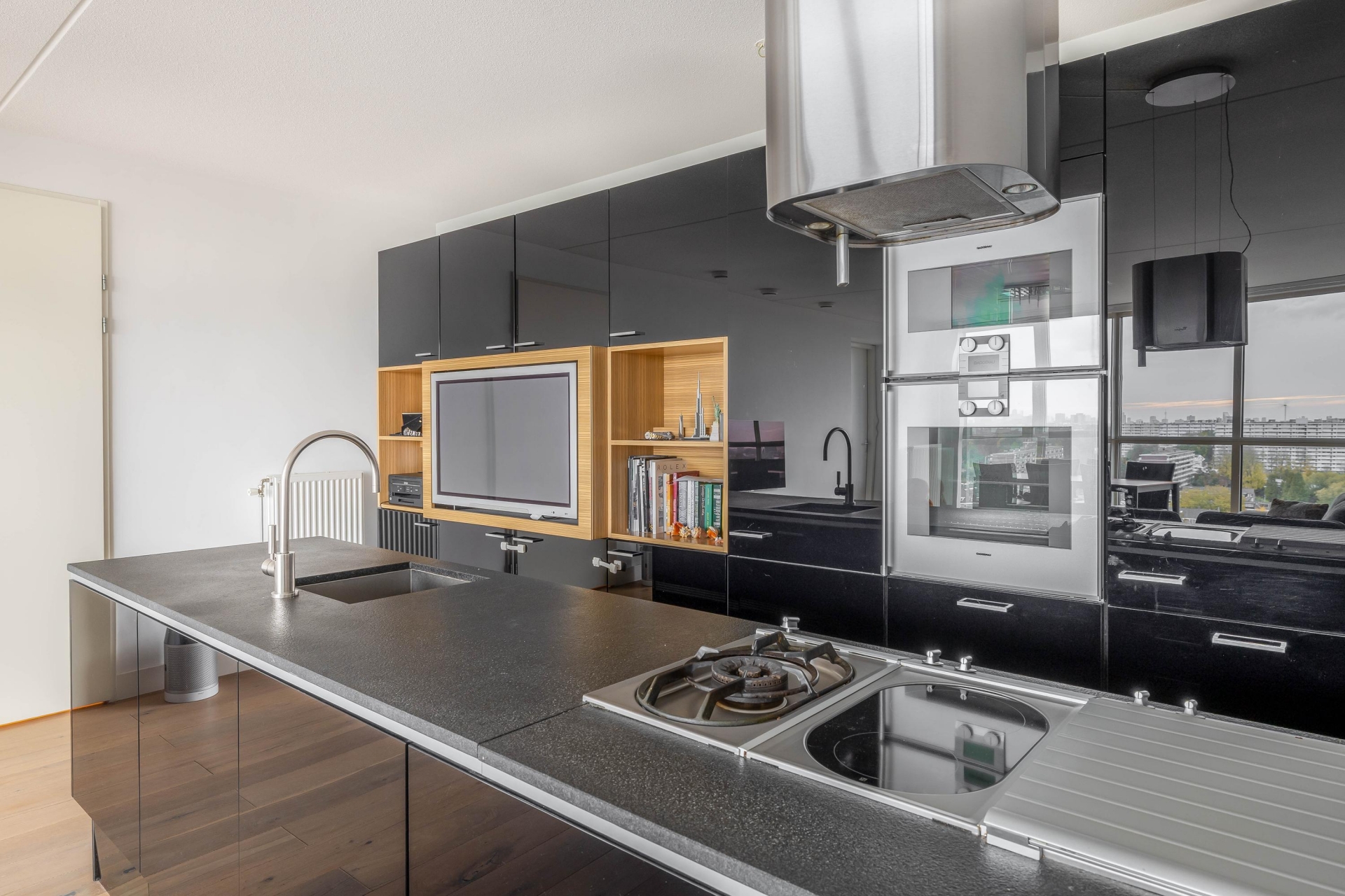 Entree, met toegang tot de vertrekken, 2 slaapkamers, de badkamer, het toilet, een technische ruimte en een inpandige berging. Aan het einde van de hal bevindt zich de woonkamer met open keuken. Het eerste wat opvalt bij het betreden van deze ruimte is het waanzinnige uitzicht. Hier vind je de stijlvolle, open keuken met een strak zwart front en een ruim kookeiland van Poggenpohl en voorzien van Gaggenau apparatuur. De opstelling zorgt voor veel werkruimte én een fijne connectie met de woonkamer ideaal voor wie graag kookt en tegelijk contact houdt met gasten of gezinsleden. Het eetgedeelte grenst direct aan de keuken en heeft, net als de zithoek, volop licht en uitzicht. Overdag is het hier heerlijk vertoeven met een boek of een kop koffie, terwijl je 's avonds geniet van de zonsondergang.