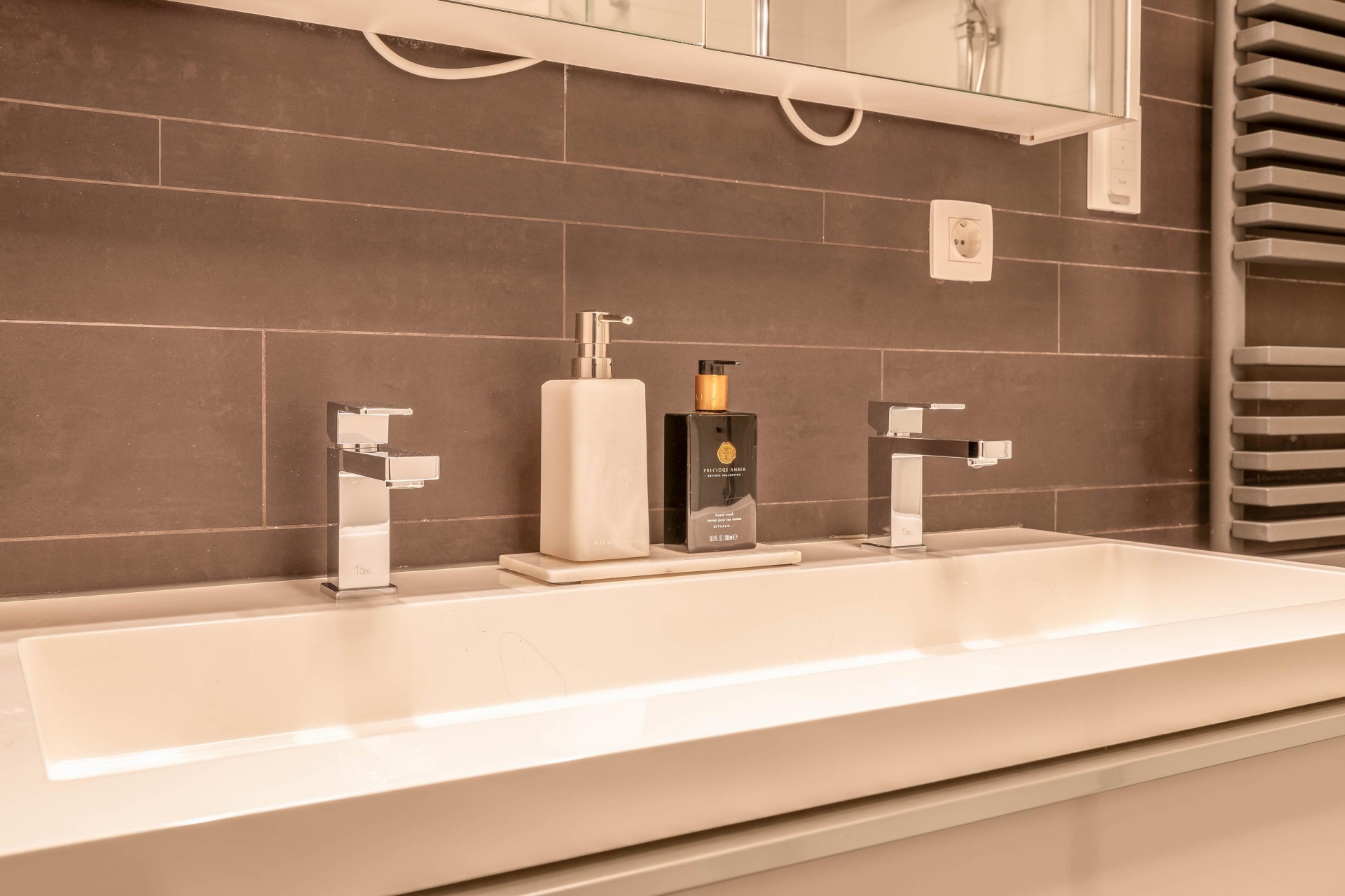 Entree, met toegang tot de vertrekken, 2 slaapkamers, de badkamer, het toilet, een technische ruimte en een inpandige berging. Aan het einde van de hal bevindt zich de woonkamer met open keuken. Het eerste wat opvalt bij het betreden van deze ruimte is het waanzinnige uitzicht. Hier vind je de stijlvolle, open keuken met een strak zwart front en een ruim kookeiland van Poggenpohl en voorzien van Gaggenau apparatuur. De opstelling zorgt voor veel werkruimte én een fijne connectie met de woonkamer ideaal voor wie graag kookt en tegelijk contact houdt met gasten of gezinsleden. Het eetgedeelte grenst direct aan de keuken en heeft, net als de zithoek, volop licht en uitzicht. Overdag is het hier heerlijk vertoeven met een boek of een kop koffie, terwijl je 's avonds geniet van de zonsondergang.