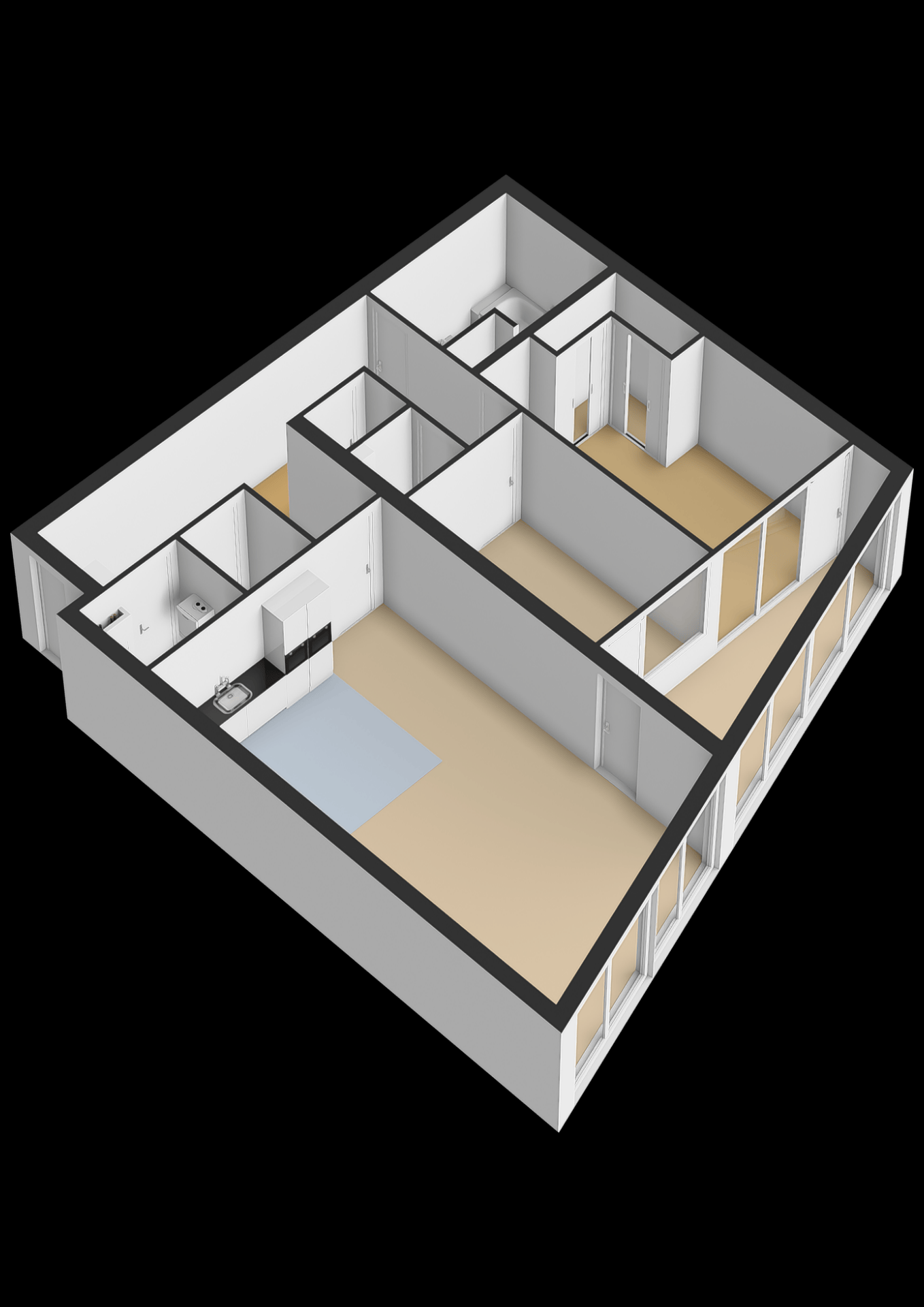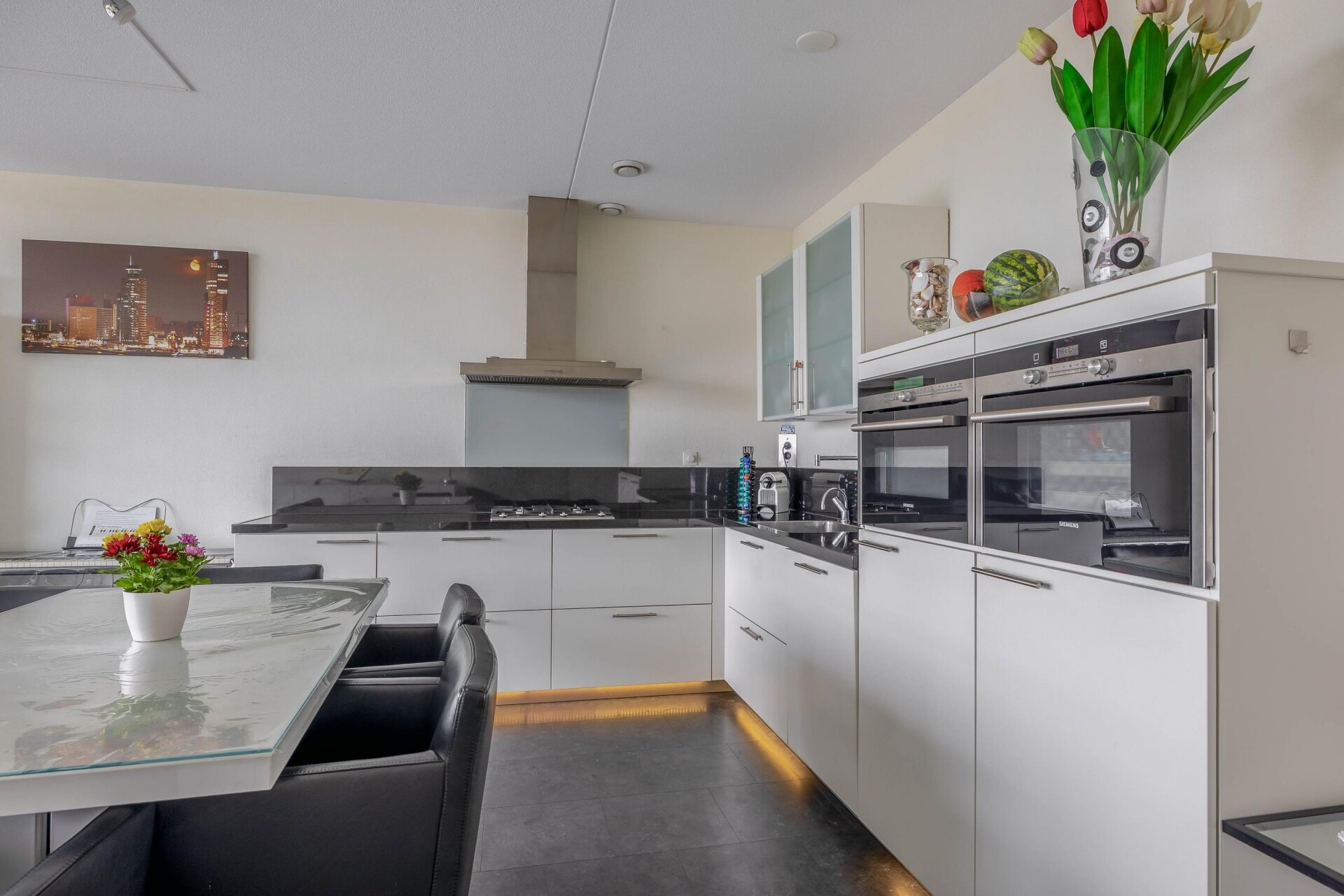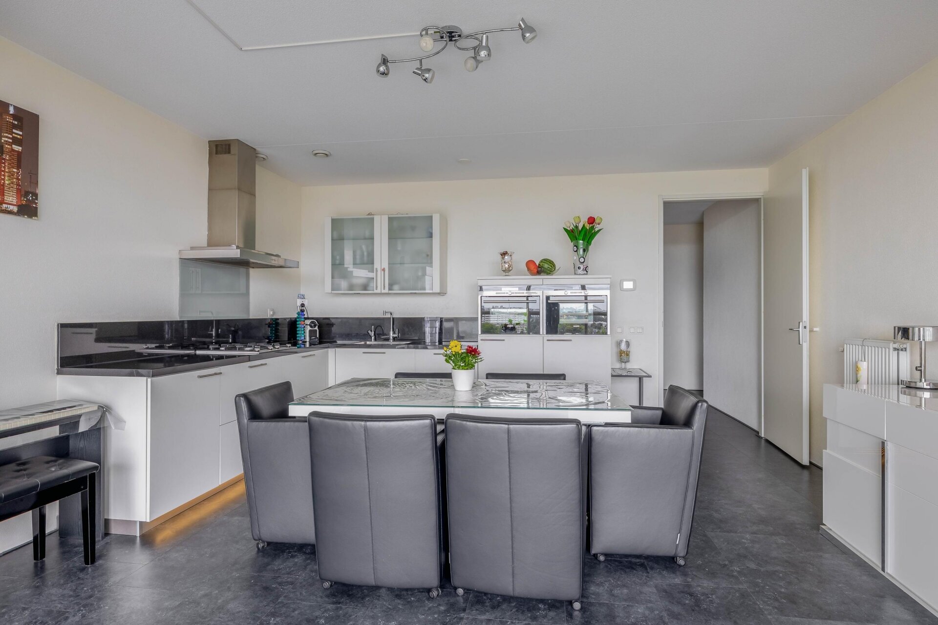 De open keuken is compleet ingericht met inbouwapparatuur zoals een koelkast, aparte vriezer, oven, magnetron, vaatwasser, 4-pits gaskookplaat, afzuigkap en Quooker. Zowel de woonkamer als beide slaapkamers grenzen aan de zonnige loggia met schuifpui, grote raampartijen en uitzicht waar je niet op uitgekeken raakt.