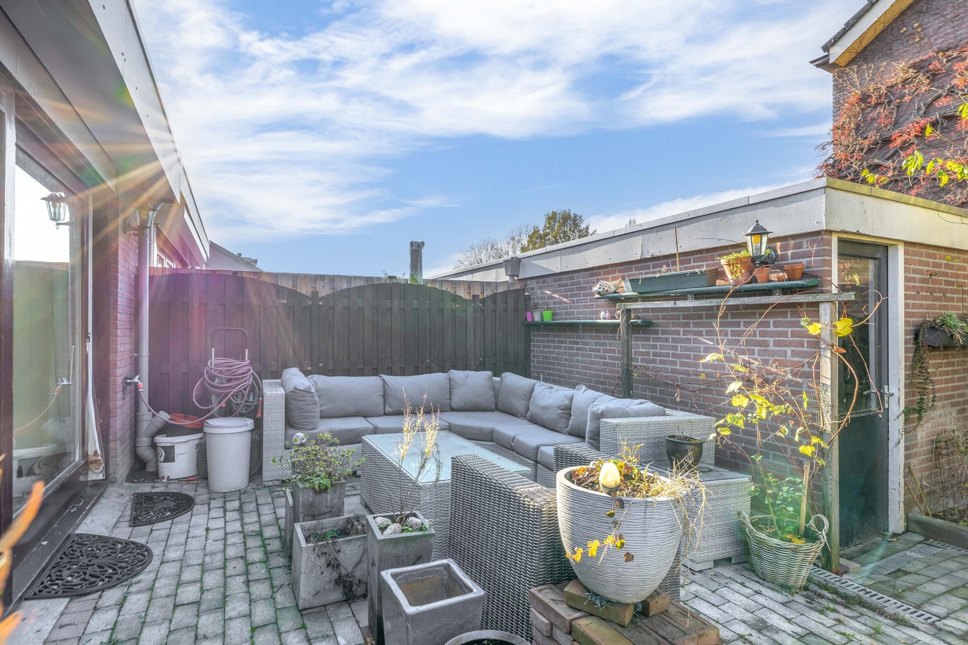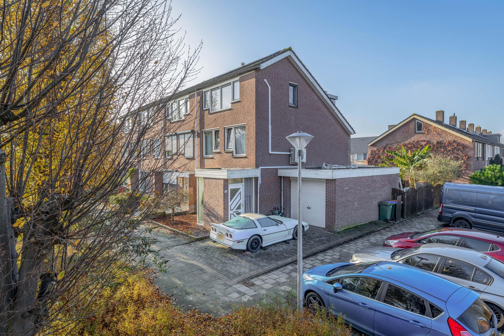 De achtertuin ligt op het westen, wat betekent dat je hier vooral in de middag en avond van de zon geniet. Een heerlijke plek om buiten te eten of lekker te ontspannen. De tuin is grotendeels bestraat en dus onderhoudsvriendelijk. Achterin de tuin staat een berging en via de zijkant heb je directe toegang tot de ruime garage. Aan de voorzijde biedt de oprit plek voor meerdere auto’s op eigen terrein, geen gedoe met parkeren dus. De ligging op de hoek zorgt bovendien voor extra privacy en een vrijer gevoel.