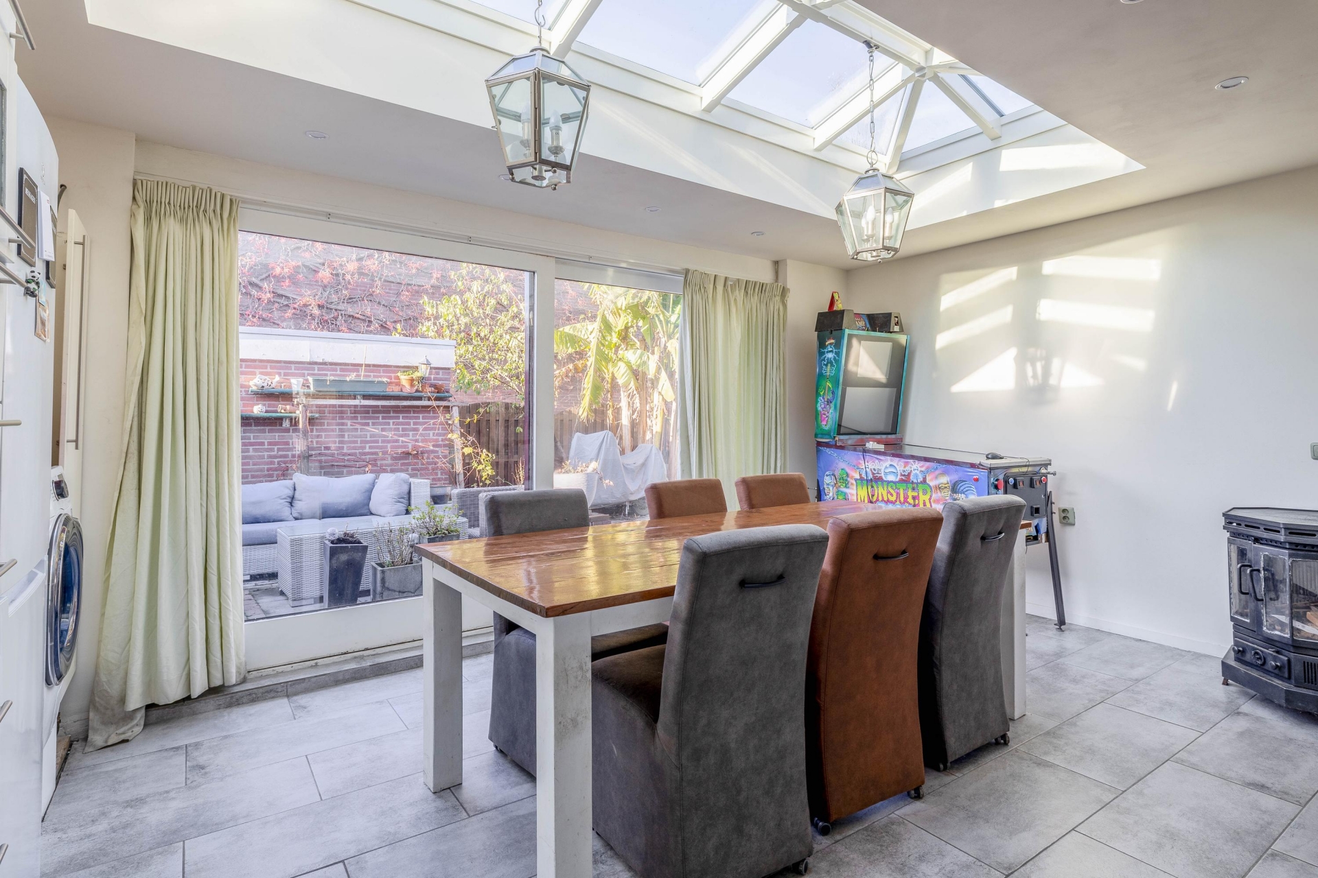 Zodra je binnenkomt, valt direct op hoe open en licht het huis is. De uitgebouwde woonkamer loopt over in een ruime open keuken met kookeiland, wat zorgt voor een fijne doorloop naar de eetkamer. Dankzij de grote raampartijen aan de achterzijde en de schuifpui naar de tuin komt het daglicht rijkelijk naar binnen. De vloer is voorzien van grote grijze tegels met vloerverwarming, comfortabel en stijlvol tegelijk. In de zomer biedt de airconditioning op de begane grond extra verkoeling.