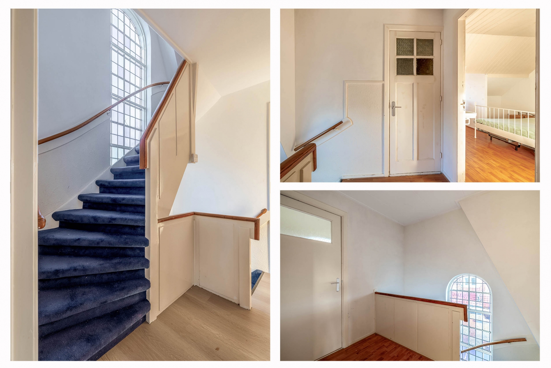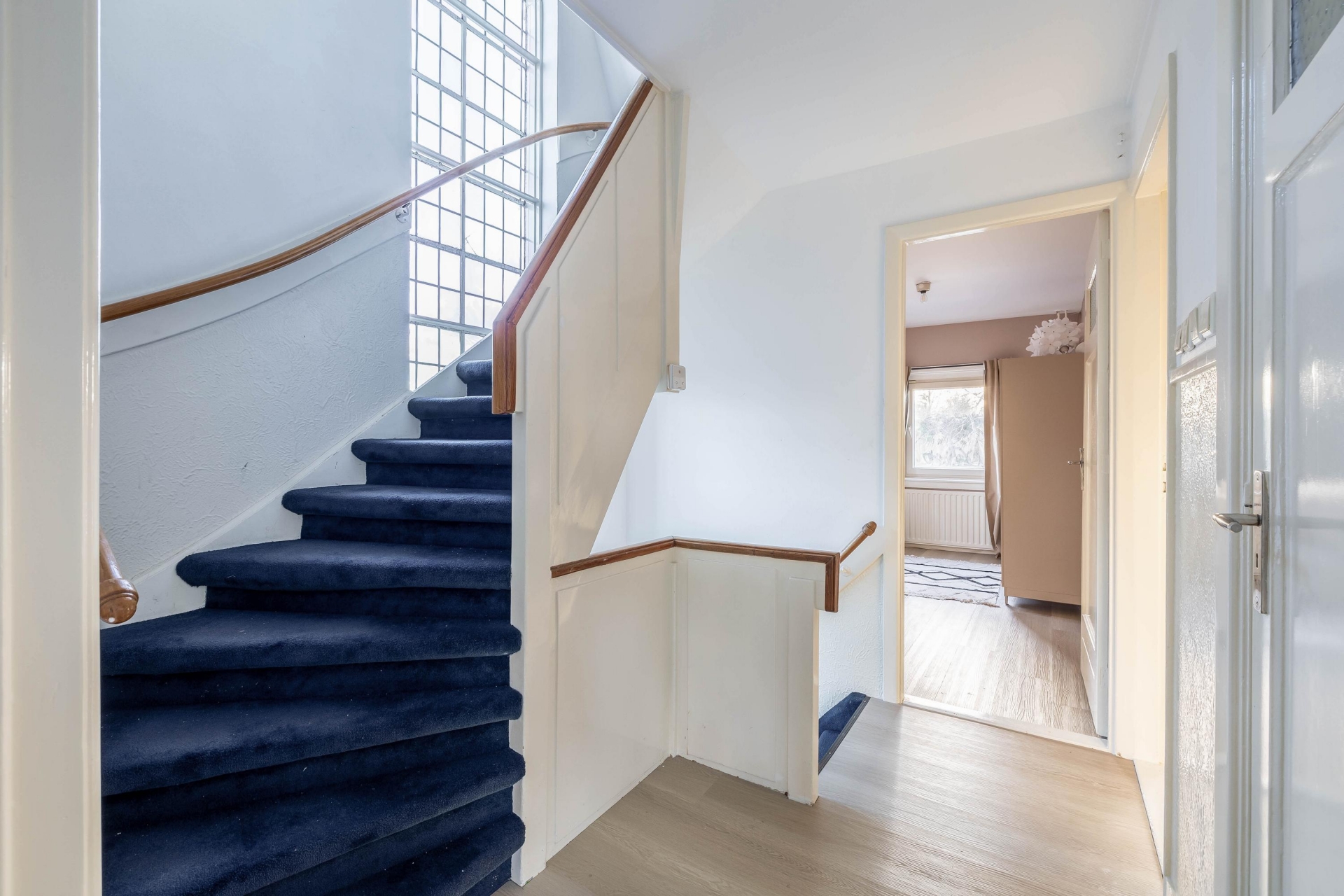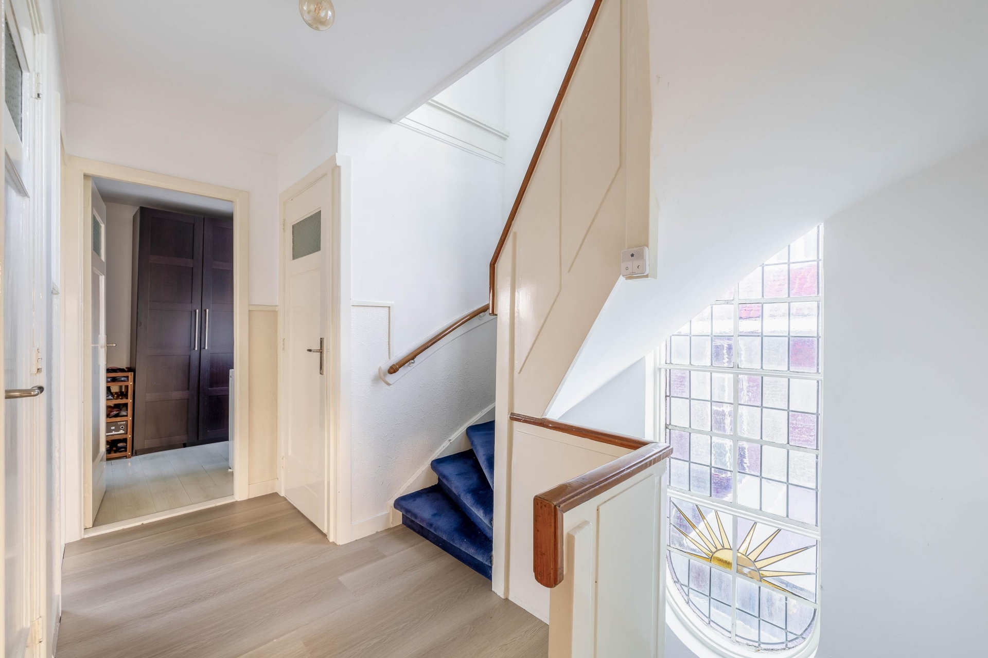 De badkamer is praktisch ingericht met een inloopdouche en wastafel, en er zijn in totaal drie toiletten in de woning. Op de eerste verdieping vind je ook nog een aparte wasruimte, zodat de huishoudelijke taken vlot verlopen. Leuk detail: het prachtige glas-in-loodraam in het trappenhuis geeft het huis extra charme.