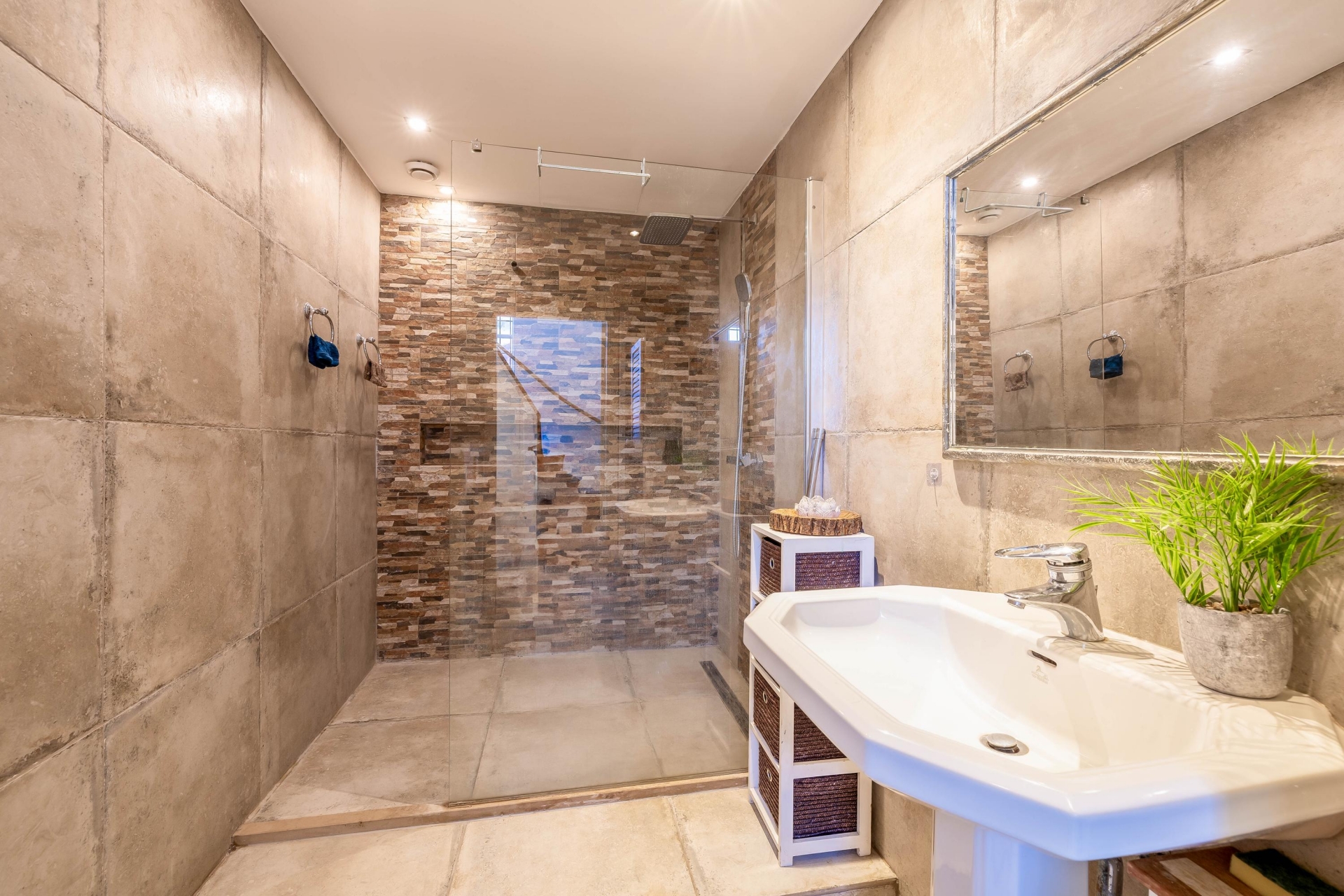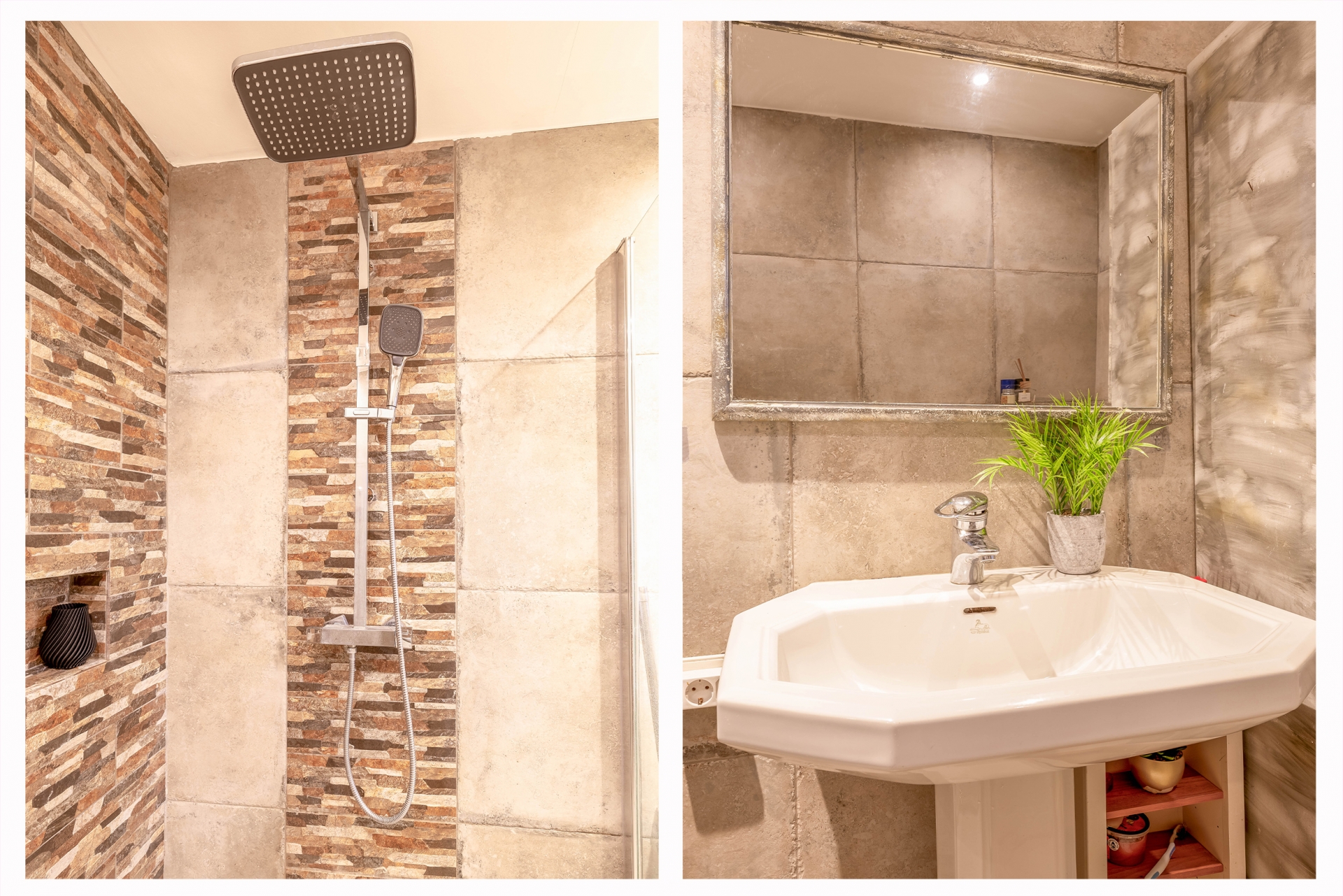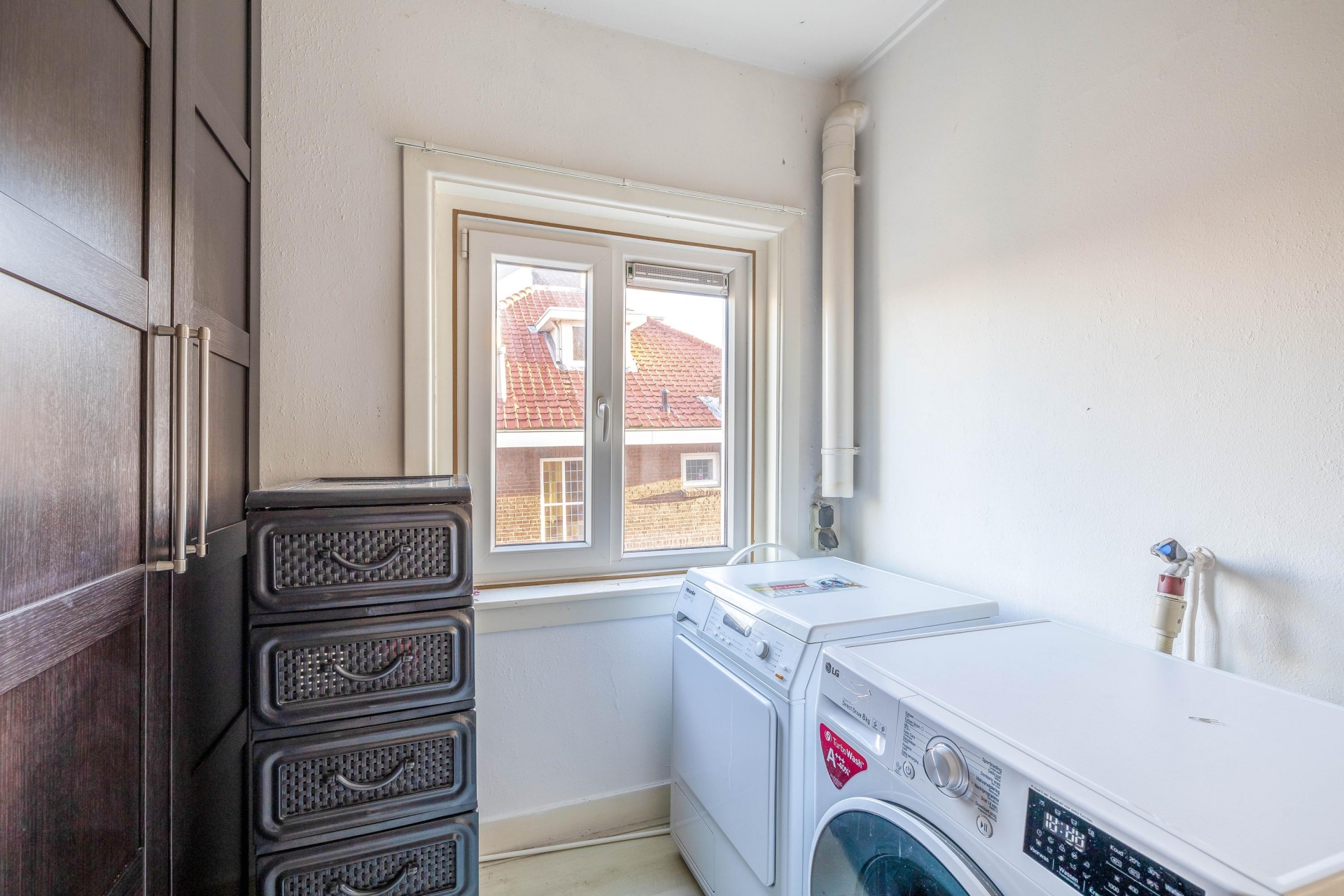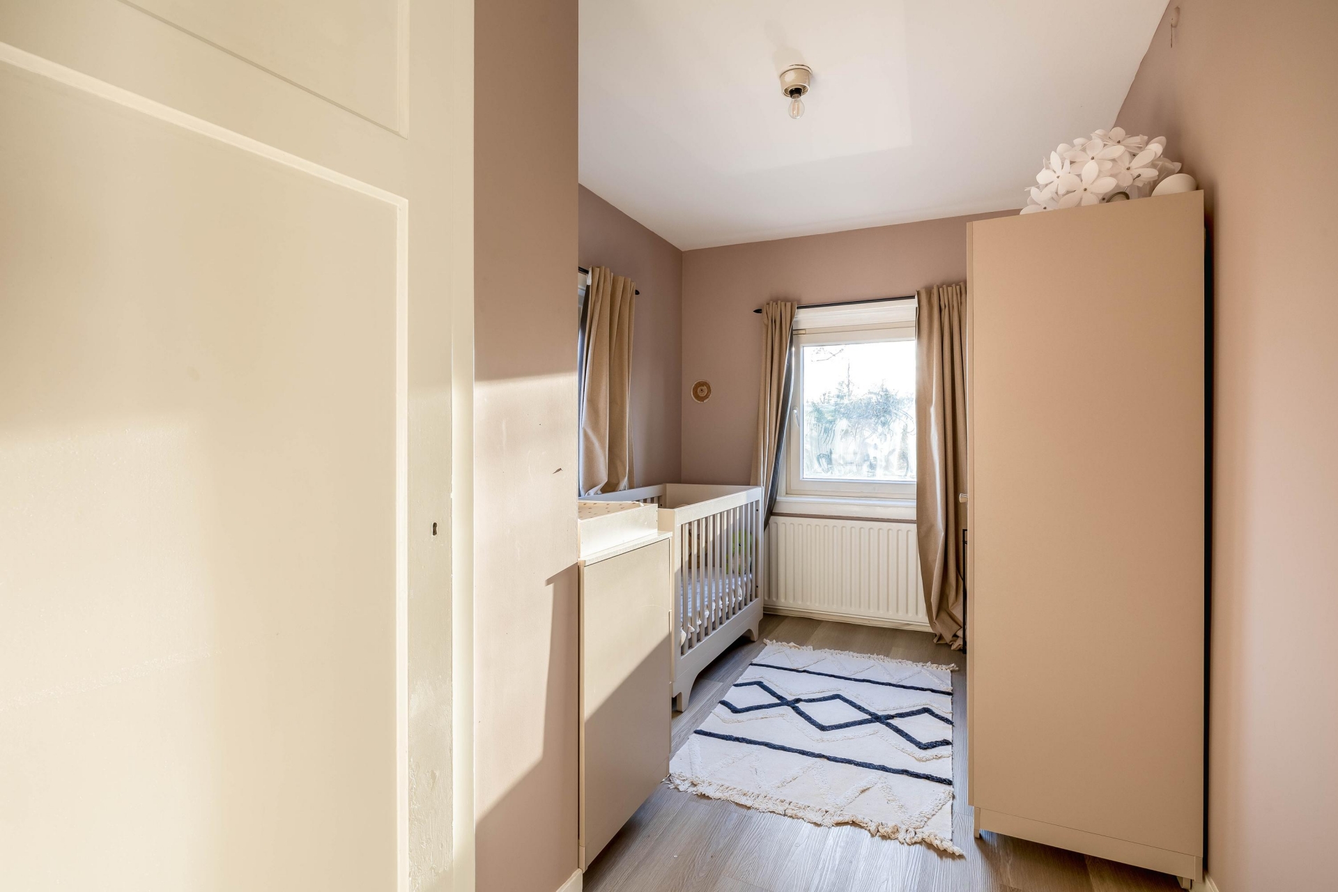 De badkamer is praktisch ingericht met een inloopdouche en wastafel, en er zijn in totaal drie toiletten in de woning. Op de eerste verdieping vind je ook nog een aparte wasruimte, zodat de huishoudelijke taken vlot verlopen. Leuk detail: het prachtige glas-in-loodraam in het trappenhuis geeft het huis extra charme.