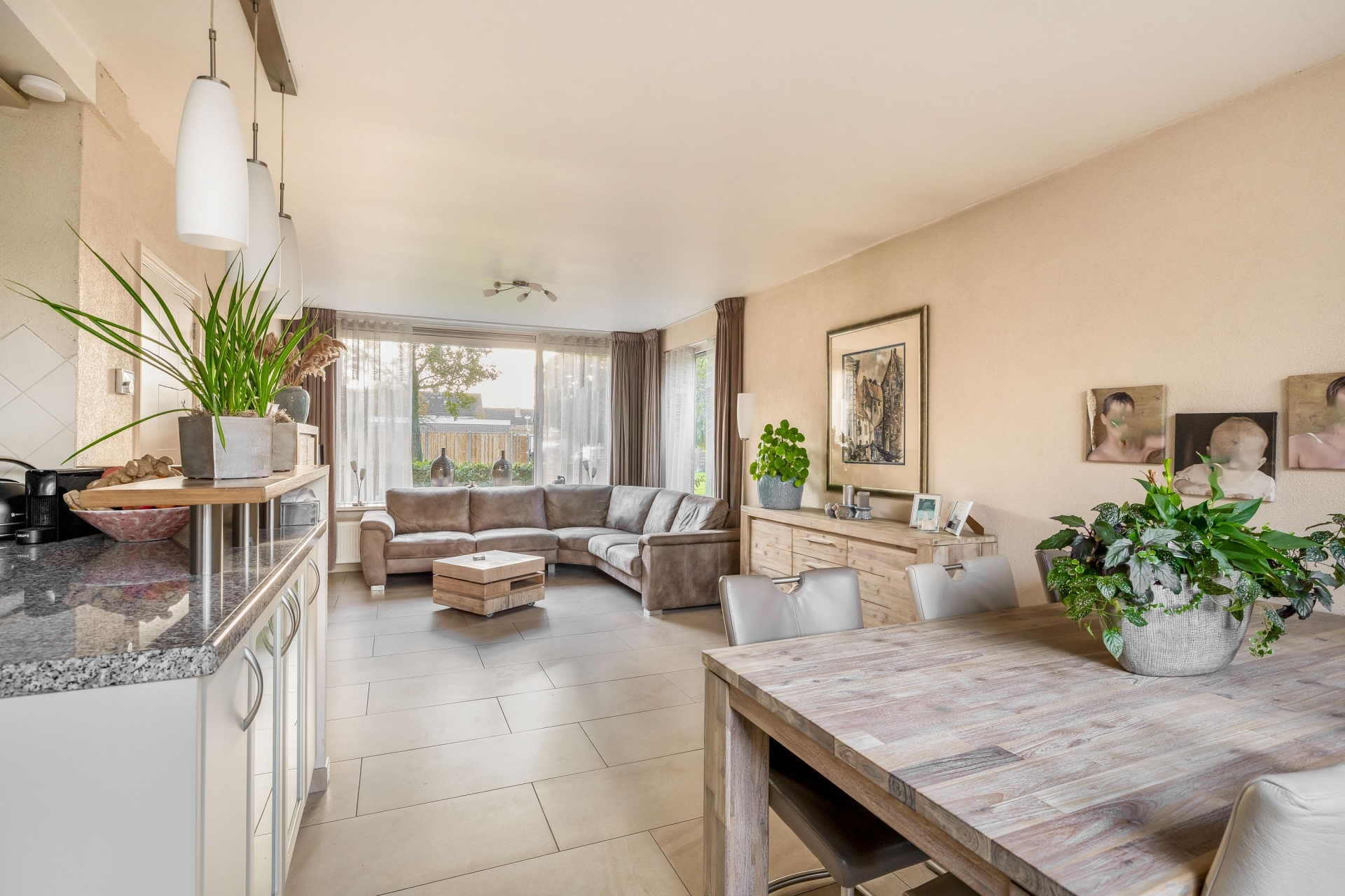 De begane grond voelt meteen prettig aan. De lichte hal met trapopgang geeft toegang tot de woonkamer, die dankzij de grote raampartijen heerlijk licht is. De plavuizen vloer met vloerverwarming zorgt niet alleen voor comfort, maar ook voor een moderne uitstraling. Aan de achterzijde is de woning uitgebouwd en vind je de praktische bijkeuken met extra werk- en bergruimte — ideaal als wasruimte, extra keukenopslag of speelruimte voor de kinderen. Via de bijkeuken stap je zó de zonnige achtertuin in. Ook aan de zijkant van het huis is extra ruimte gecreëerd met een aangebouwde berging én een eigen stenen garage achterin de tuin.
