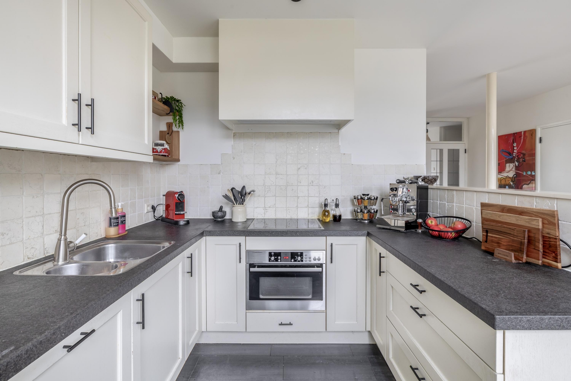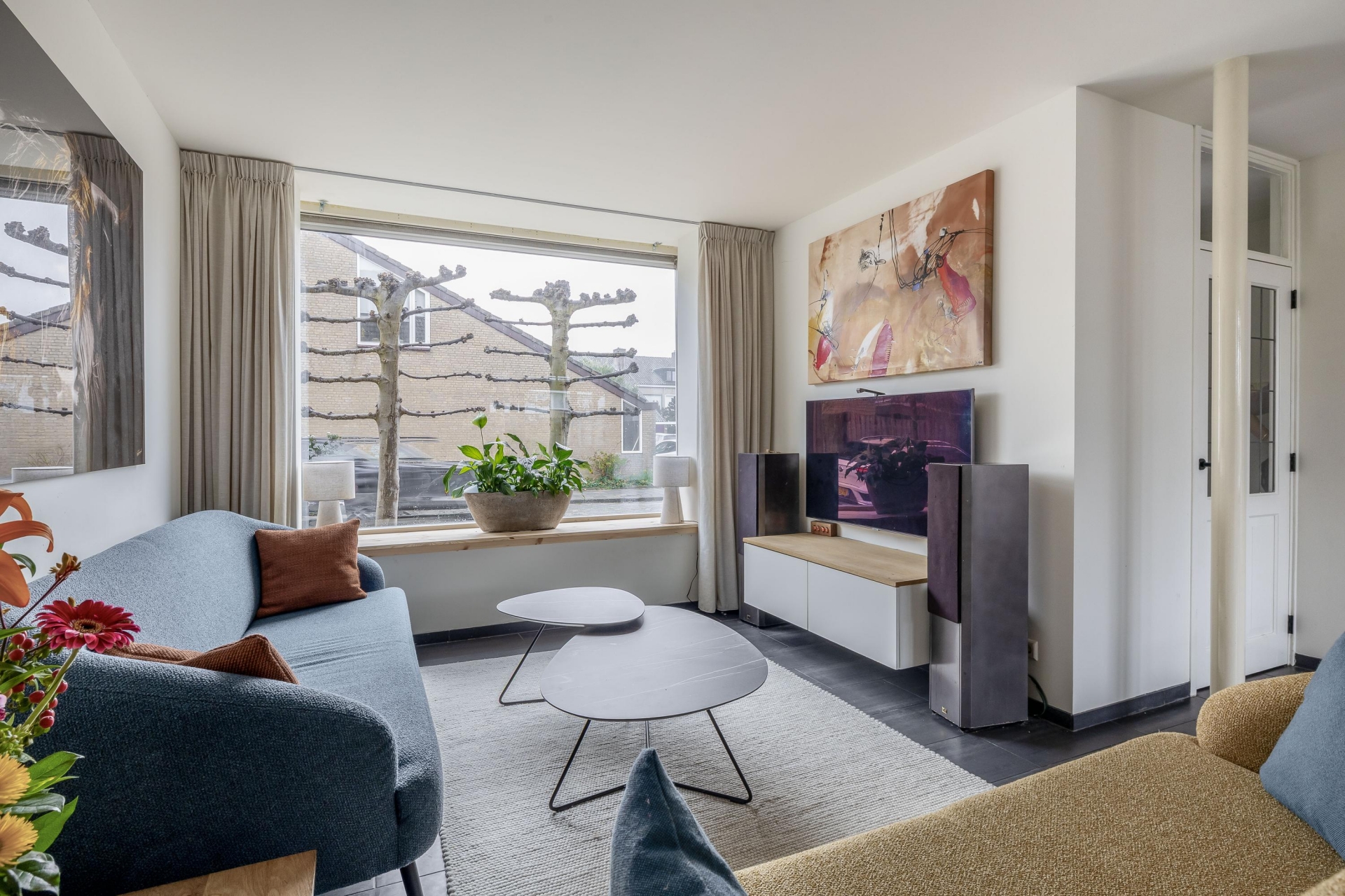 Bij binnenkomst valt direct de prettige indeling op. De woonkamer aan de voorzijde heeft een grote erker dat zorgt voor veel daglicht en een vrij uitzicht over de straat. Hierdoor voelt de ruimte licht en open aan. Het is een fijne plek om een comfortabele zithoek te creëren waar je samenkomt na een lange dag. Aan de achterzijde van het huis bevindt zich de open keuken. Deze is netjes uitgevoerd in een lichte kleurstelling en heeft een ruime opstelling met voldoende werkruimte en kastruimte. Dankzij de open verbinding met het eetgedeelte blijf je altijd in contact met je gasten of gezin tijdens het koken.